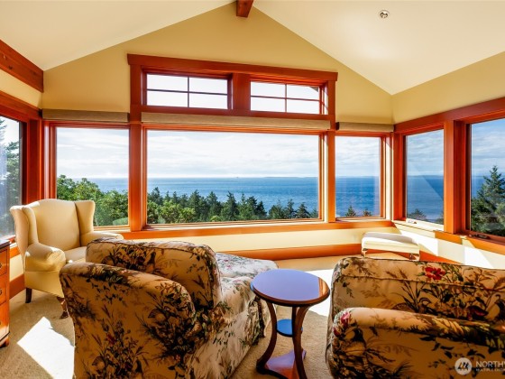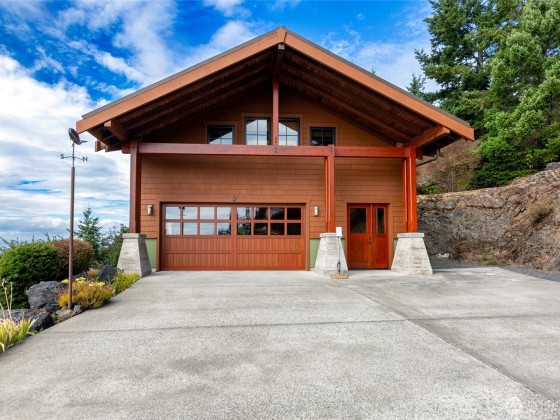 Perched on the iconic Westside Road of San Juan Island, this private 5-acre estate captures breathtaking 180° views of Haro Strait, passing boats, and majestic sunsets. Elegantly designed with timeless architecture and quality craftsmanship, the 3,464 sq. ft. home features a main-floor primary suite, expansive picture windows, and refined spaces for entertaining. A detached garage with shop and guest/office space above complements beautifully landscaped grounds and spacious deck designed for indoor-outdoor living. An ideal island retreat offering privacy, elegance, and some of the best views on San Juan Island.