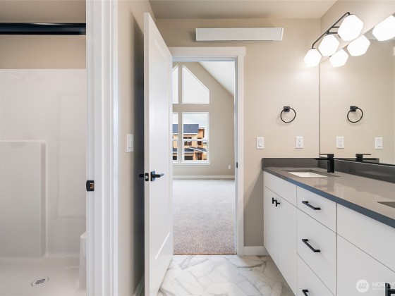 Welcome to Northview 2 in Cordata, Bellingham's premier solar home community! This stunning 2-story modern farmhouse design features an open and spacious floorplan, a custom kitchen with sleek quartz countertops, and a primary suite with an ensuite boasting a double sink and walk-in closet. Designed with sustainability in mind, enjoy efficient mini-split heat pumps with A/C, a partially fenced backyard, and EV charger prewiring. Light-filled interiors enhance the modern design. This beautiful 3-bedroom home backs up to a greenbelt for added privacy. Your dream home awaits—secure yours today!