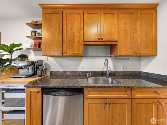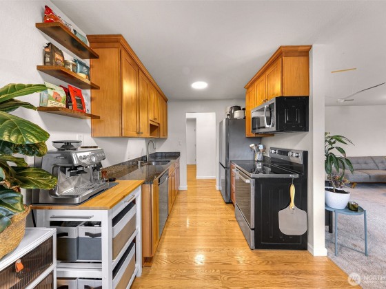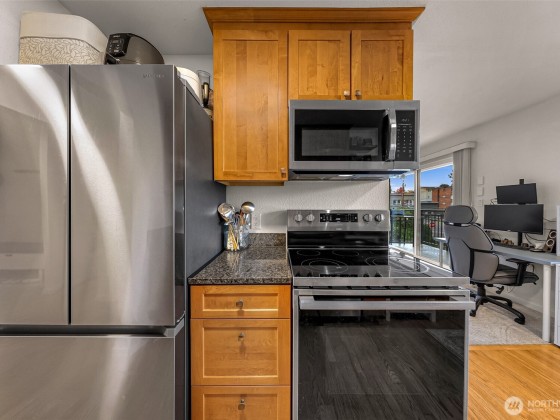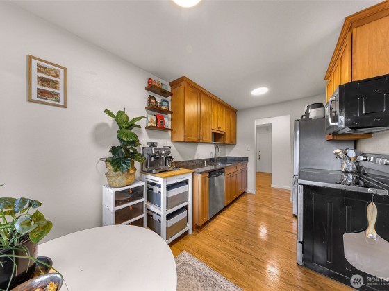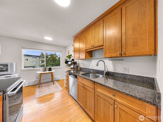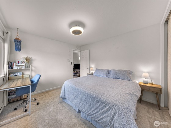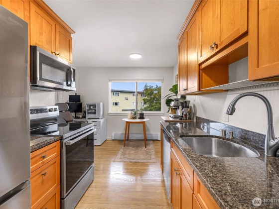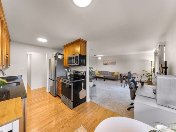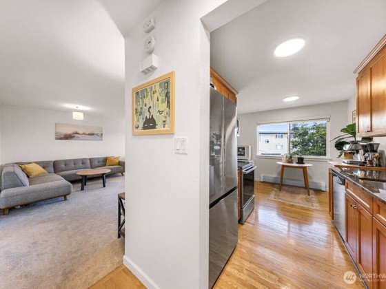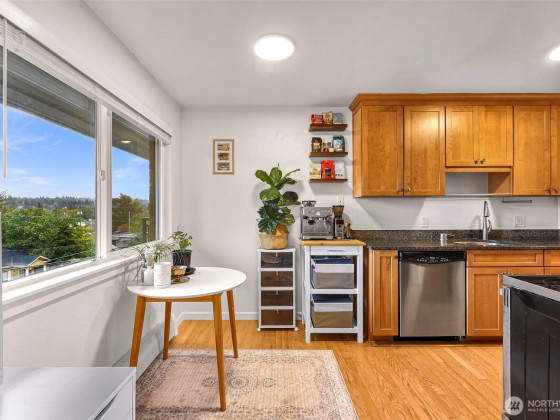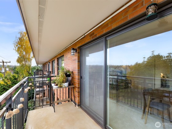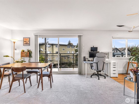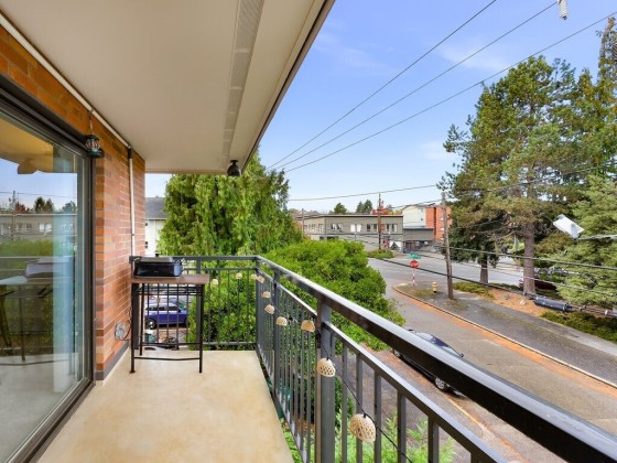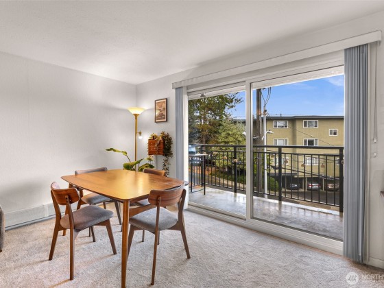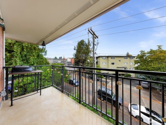 Welcome to Phinney Ridge! This quiet 1-bedroom, 1-bath top-floor end unit just steps from Green Lake offers privacy, natural light, and thoughtful updates throughout. Features include LED lighting, newer carpet, blinds, and closets, a stylish kitchen with stainless-steel appliances, a modern bath, dedicated off-street parking, private storage, and bike storage. The open layout extends to a spacious living room and large balcony with panoramic neighborhood views. Building remodels completed in 2018 with new decks, railings, windows, roof, and plumbing. With no rental cap, easy access to local restaurants, shops, PCC Market, and express transit to downtown, this unit is an excellent investment opportunity or perfect for your next home!