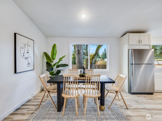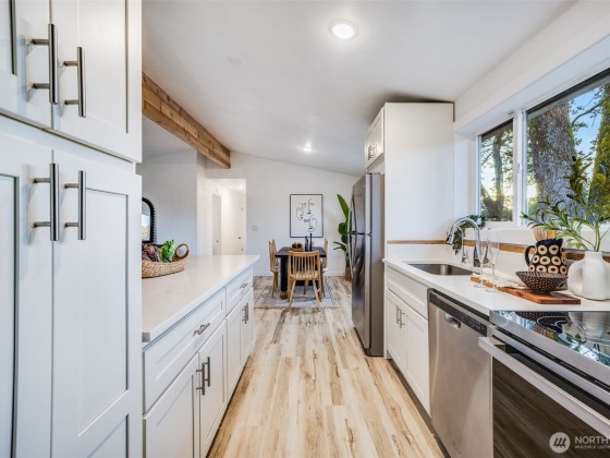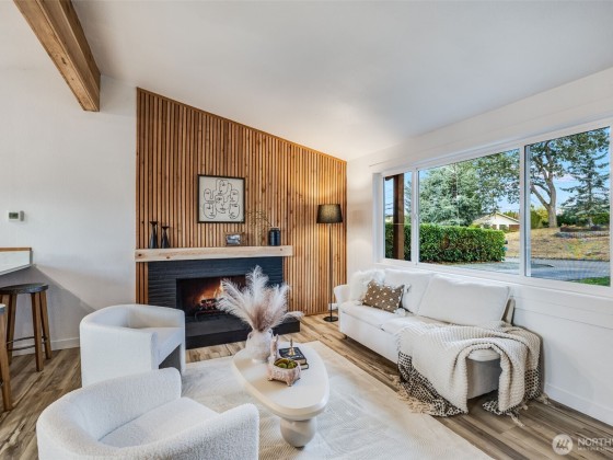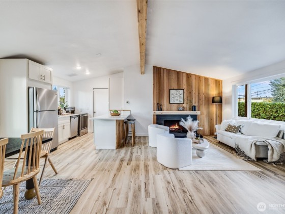 Step into this stunning 3 bed 1.5 bath remodel where modern design meets warm natural textures. Every inch has been thoughtfully updated—featuring an open-concept living space with expansive windows, light-toned flooring, and a striking wood beam that adds character and charm. The custom accent wall and fireplace create a perfect focal point, blending contemporary with cozy. The fully remodeled kitchen boasts clean lines, stainless steel appliances, and a stylish island with detailing that ties the space together. Enjoy a spacious backyard ideal for entertaining—complete with a deck, firepit, and storage shed. Close to Steilacoom Lake, shopping, and dining—this move-in-ready home offers style and comfort in a prime location.