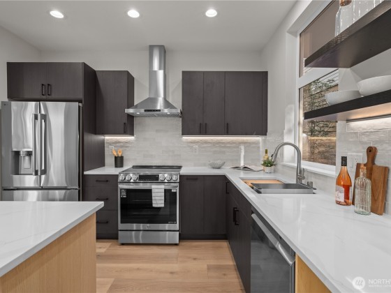 **Brand New | Exquisite Luxury Finishes!** This contemporary stand-alone home blends modern design with comfort. Bright, airy open-concept living & dining area, stylish island kitchen features a stunning full-height backsplash, ample counter space, pop-up counter outlets, LED lighting, and soft-close cabinets. A large sliding glass door leads to a private, fully fenced patio, ideal for entertaining or gardening. Upstairs, the luxurious primary suite includes a walk-in closet, dual sinks, LED lighting, and heated tile flooring. An additional 2-bedrooms, designed full bathroom, and laundry room. Quality LVP flooring runs throughout the home, paired with an efficient mini-split heating and cooling system, and dedicated EV-ready parking.