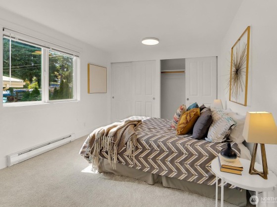 Delightful end unit in boutique building offers tech, style & convenience. Wired Cat 6, No Wi-Fi needed! 20 Amp dual gang on its own circuit in Living Room (also wired for surround sound.) Unique stranded Tiger Bamboo flooring in main rooms. Ceramic tile in kitchen and bath. Quality ss appliances in kitchen include a BRAND NEW induction range. Lovely slab quartz countertops, cherry cabinets in kitchen and bath. New carpet and full wall closet in BR. Fresh paint throughout. HUGE private patio with secure bike lock. Minutes to Greenwood and Northgate shopping, theaters, dining, parks, E line and Northgate light rail transit station. One reserved parking PLUS rare visitor parking. Now a Dead-end street, no thru traffic. Strong HOA, low dues.