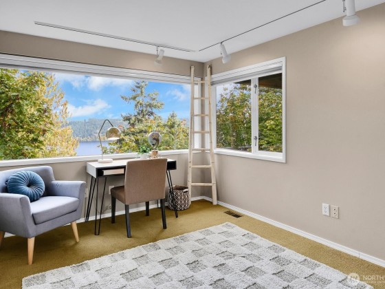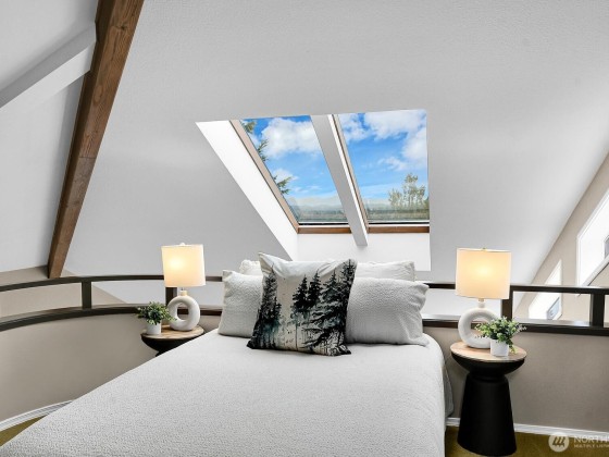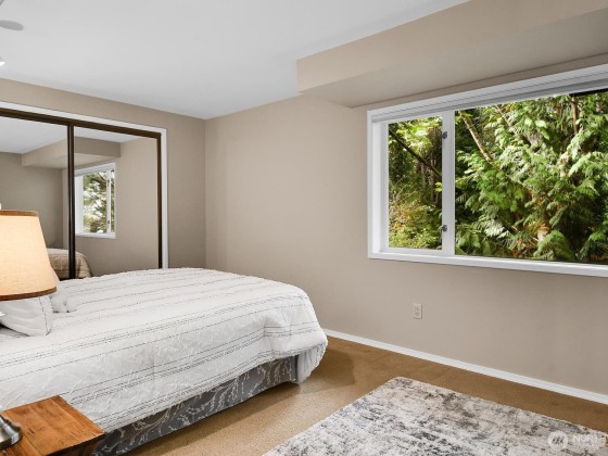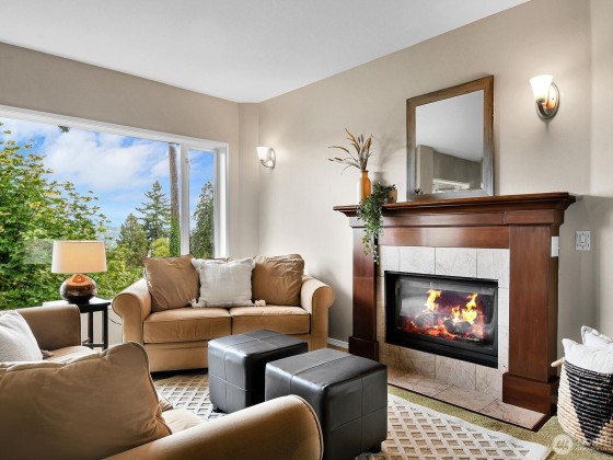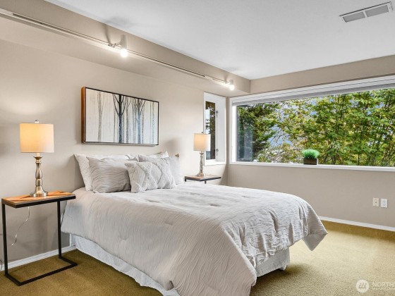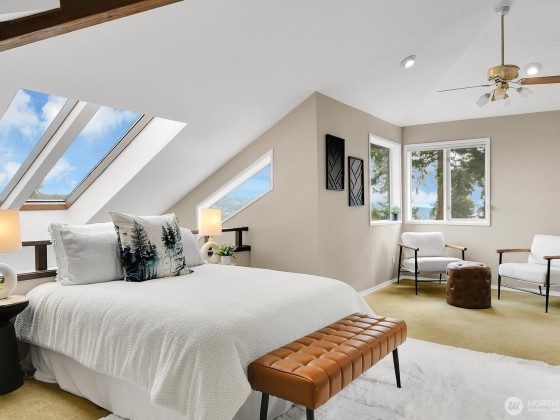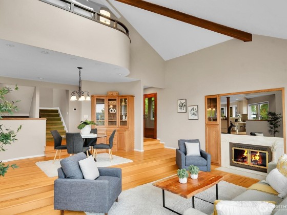 Eagle's aerie perched high above Lake Washington w/picturesque lake & mountain views. Former Seattle Times/AIA home of the month features soaring ceilings w/walls of windows to marvel at the vistas. Main level open floor plan is perfect for entertaining w/gleaming hardwood floors, generous kitchen, living and dining rooms which open to newly constructed view deck. Spacious top floor Primary Suite w/bath remodel, walk-in closet and sauna. Lower level offers 3 additional bedrooms plus game/media/family room w/gas fireplace. Tiered garden space and covered patio offer a multitude of potential options. Two car garage designed w/ample loft storage. Unique property situated on quiet street end, easy access to Burke/Gilman trail.