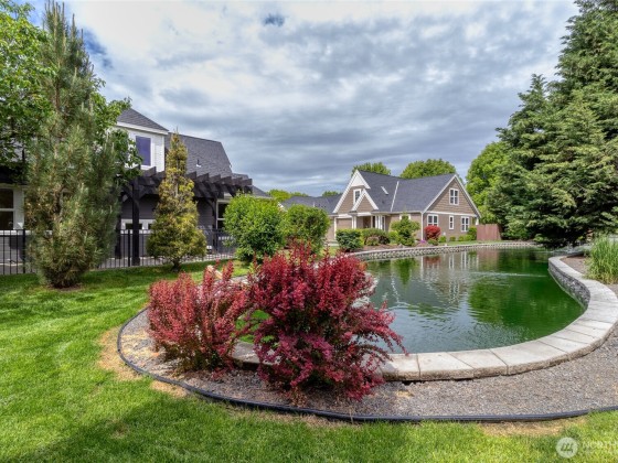 Nestled in the desirable Villages of Garrison Creek, this custom home showcases elegant craftsmanship throughout. An impressive walnut entry door greets you upon arrival, flowing into the beautiful refinished walnut floor, new interior paint, new carpet, and elevated luxury fixtures. The chef's kitchen features walnut cabinets with maple pull-out shelves, granite counters, and a Wolf gas range. The great room captivates with high ceilings, wall-to-wall windows and a three-sided fireplace. Two main floor bedrooms include a spacious primary suite, while upstairs offers three additional bedrooms plus flexible living space. Relax and enjoy the wrap-around patio overlooking the duck pond and park like setting. Easy carefree living awaits!