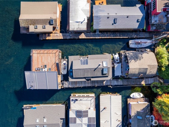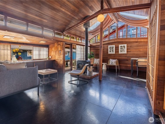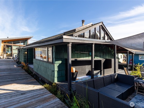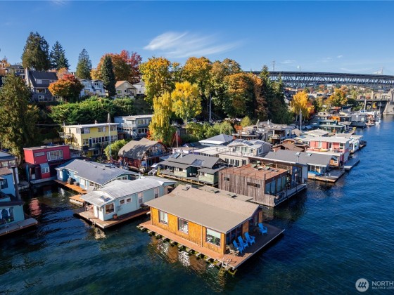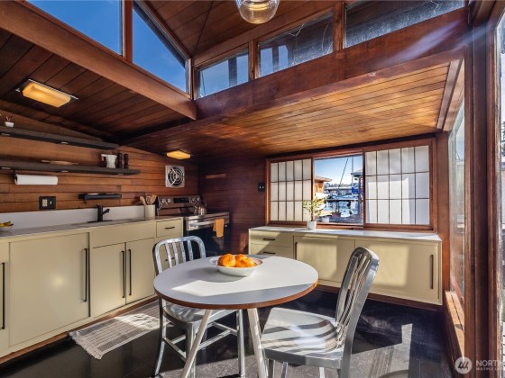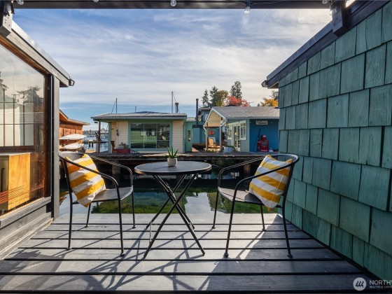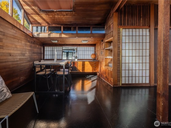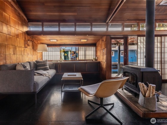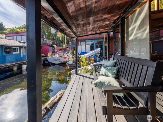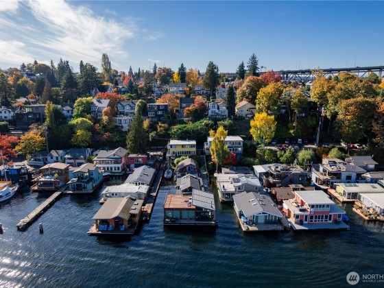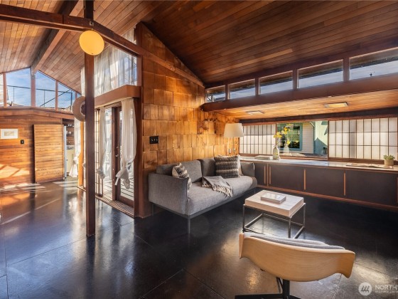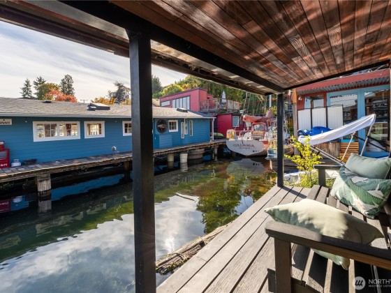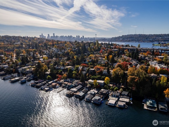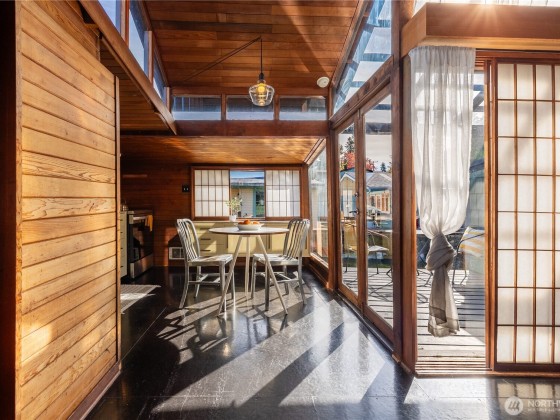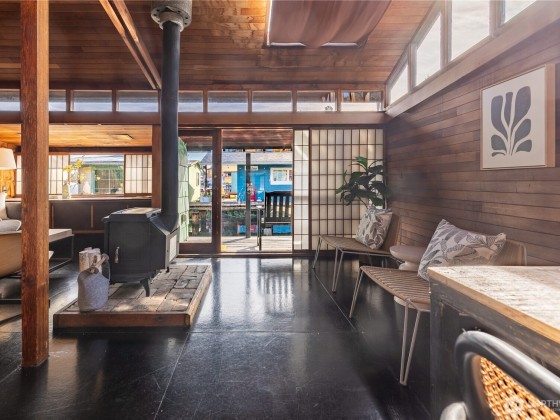 Designed by architect Gerald Van Slyck in the late 1950s to early 1960s, this distinctive floating home captures the essence of midcentury design with a NW sensibility. Vaulted ceilings, clerestory windows, and generous skylights welcome shifting sunlight that dances through the rooms & reflects off the water, giving the space a luminous, ever-changing quality. Outdoor areas frame tranquil Portage Bay views, while the intimate four-home co-op dock offers a genuine sense of community. Includes one dedicated parking space & a 43-foot moorage slip - a timeless blend of architecture, light, & waterfront serenity. Second from the end, this is your perfect retreat from the daily city life putting you absolutely in touch w/ nature at it's best.