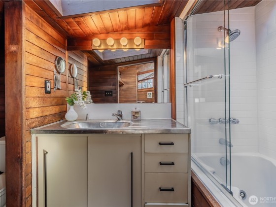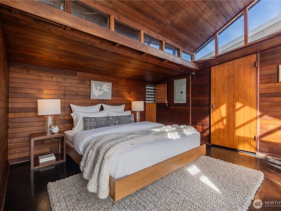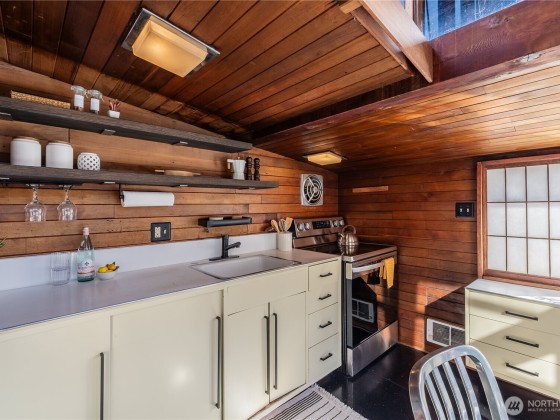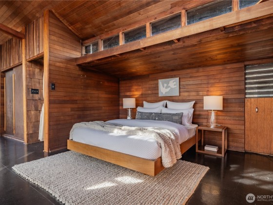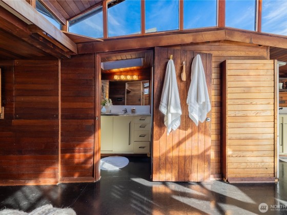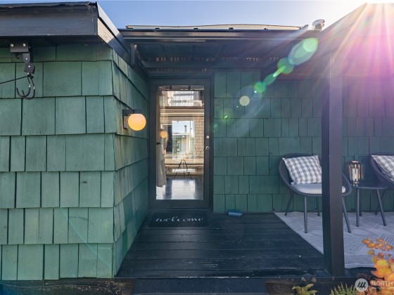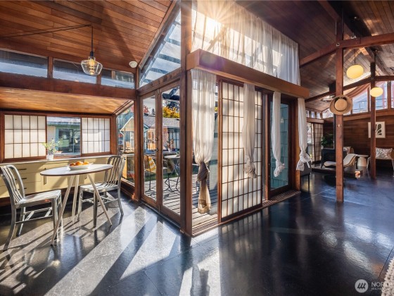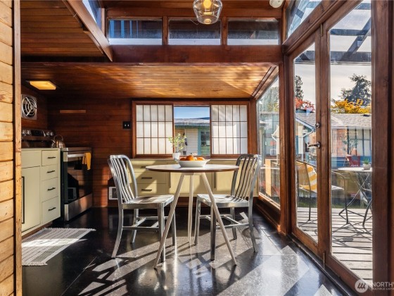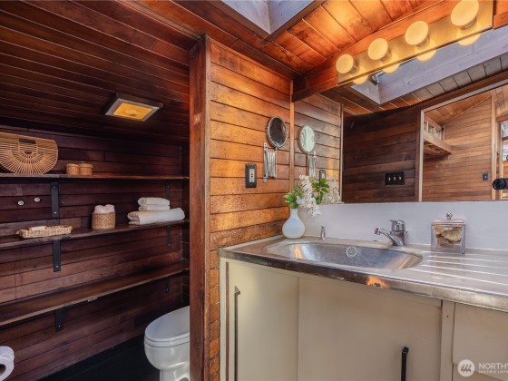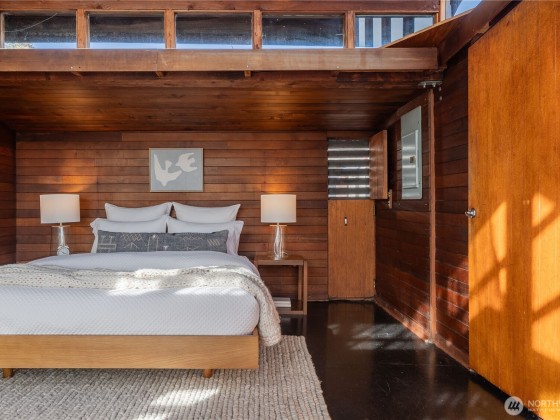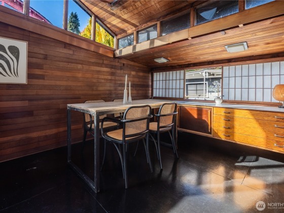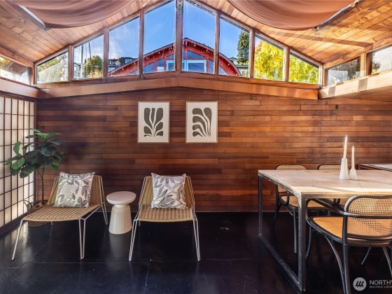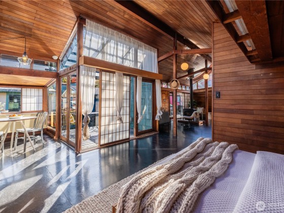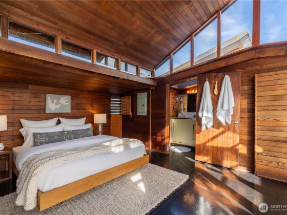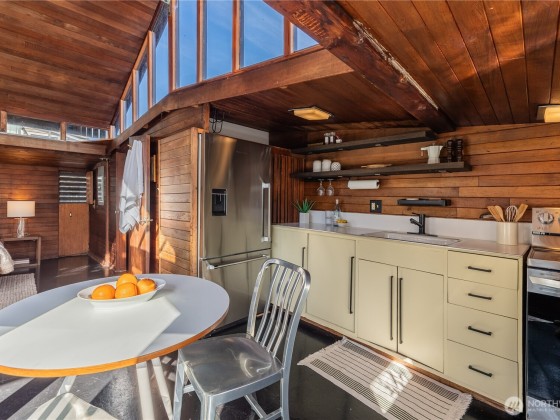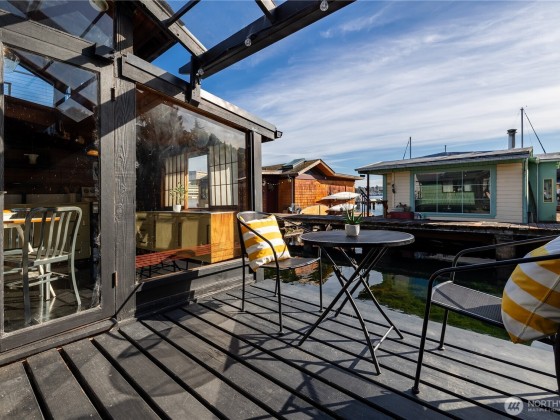 Designed by architect Gerald Van Slyck in the late 1950s to early 1960s, this distinctive floating home captures the essence of midcentury design with a NW sensibility. Vaulted ceilings, clerestory windows, and generous skylights welcome shifting sunlight that dances through the rooms & reflects off the water, giving the space a luminous, ever-changing quality. Outdoor areas frame tranquil Portage Bay views, while the intimate four-home co-op dock offers a genuine sense of community. Includes one dedicated parking space & a 43-foot moorage slip - a timeless blend of architecture, light, & waterfront serenity. Second from the end, this is your perfect retreat from the daily city life putting you absolutely in touch w/ nature at it's best.