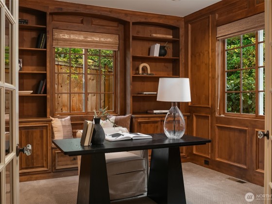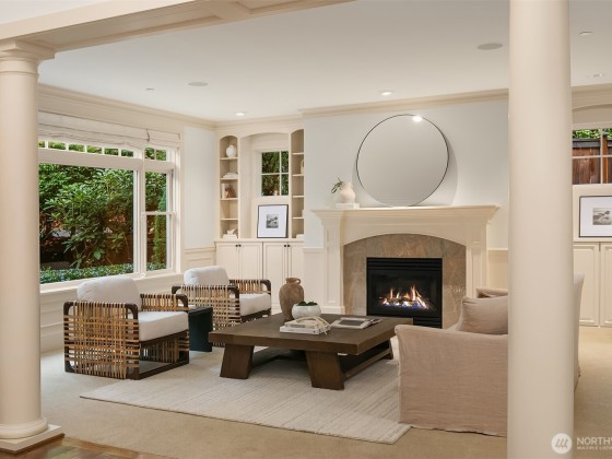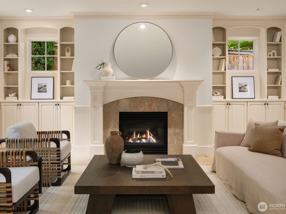 Nestled in the coveted Enatai community, this home blends timeless architecture w modern sophistication & shared waterfront access. Thoughtfully designed w extensive millwork & rich wood details throughout, creating an elegant backdrop for everyday living & entertaining. Formal living & dining room w French doors open to a verdant backyard w courtyard fountain. A rich wood paneled office provides space for work or study. The chefs kitchen boasts Sub-Zero & Dacor appliances, granite island w prep sink, & seamless flow to the dining & family room w fireplace flanked by custom bookshelves. Upstairs hosts 4 ensuite beds, including primary suite w a gas fireplace, sitting area & 5-piece marble bath. Minutes to DT Bellevue's shopping & dining.