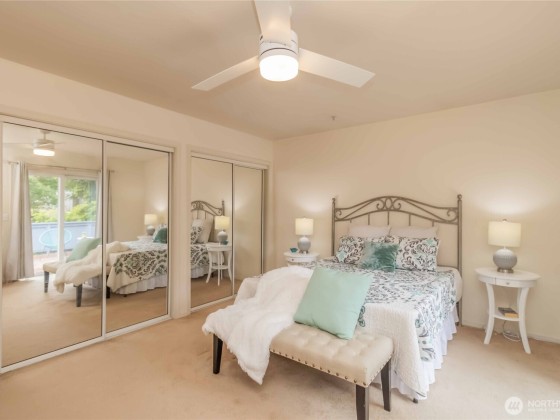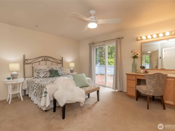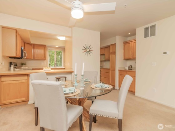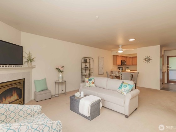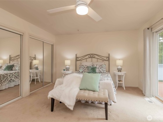 Welcome to the well-planned community of Weathervane, centrally located near schools, UP Town Center, & Fircrest Golf Course & Country Club! Gorgeous expansive deck captures beautiful views of the greenery and the woods, w/entries off primary bedroom & kitchen! This 3-bed, 2-bth condo features a huge great room with beautiful gas fireplace to cozy up to, dining room off the kitchen (with tons of cabinets), breakfast bar, attached garage, tool/hobby shop, TONS of storage & interior sprinklers! Room for additional parking and even an RV on the side of the home. All appliances stay! Separate primary bath entry of the bedroom. Very well loved home; only second owner!