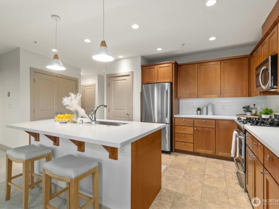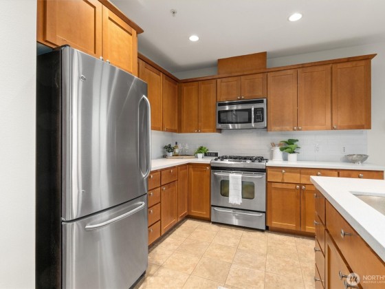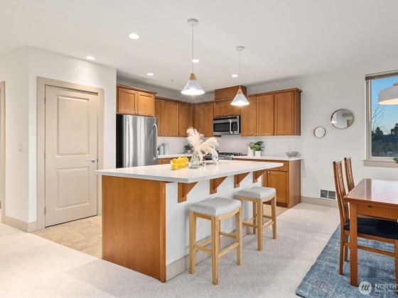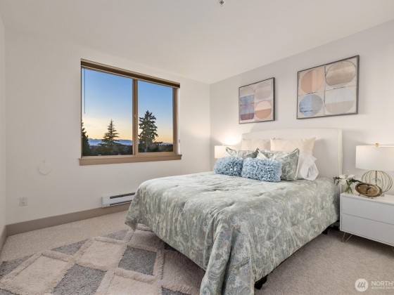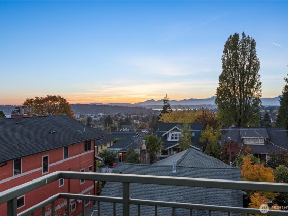 Perched atop Phinney Ridge, this 2-bedroom, 2-bathroom plus den, southwest-corner home showcases unobstructed Olympic Mountain and sunset views from nearly every room. One owner since new and freshly updated with new carpet, paint, countertops, and backsplash, it feels like new. The open layout fills with natural light and offers spacious living and dining areas plus a private balcony for endless sunsets. With two secure parking spaces and an unbeatable location—Petit Pierre in the lobby and Red Mill, Ken’s Market, and Greenwood Hardware just steps away—this home combines incredible views, privacy, and walkability in the heart of Phinney Ridge.