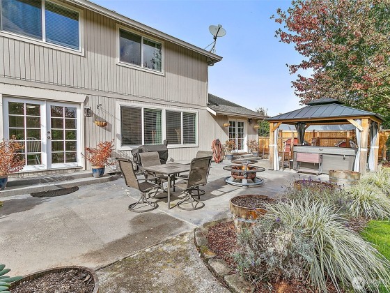Come check out the charm of this home in beautiful Enumclaw. Upstairs you will find two bdrms, a primary w/ en suite bath and a second bdrm w/ a half bath. On the main level there are two bdrms and a full bath. Home has brand new kitchen w/ stainless appliances, quartz counters and a dining room with French doors leading to the spacious private backyard. The backyard has all the amenities...dog run, fruit trees, garden and a space for above ground pool (pool included in shed). Yard also has a huge patio with a gazebo and hot tub for relaxing after a long day. Top it off with a security system, views of the mountain and a great neighborhood close to everything and this house has it all!