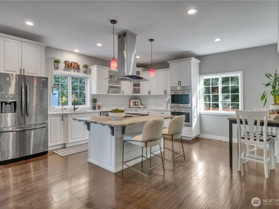 Beautiful country living just minutes from the city—without King County taxes! This inviting home, completely remodled in 2019, features warm wood floors, a stunning new kitchen with a chef’s gas range, and a spacious primary suite. Enjoy a huge family room, detached garage/shop, and RV parking. Relax or entertain on the expansive deck overlooking a shy acre of property, including additional forested space behind the fence. The perfect blend of rural tranquility and urban convenience awaits!