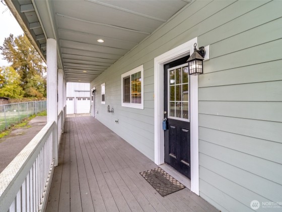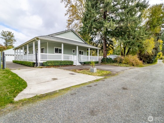 Charming 3 Bedroom 1.75 Bath Rambler offering comfort & convenience on one level. Enjoy the light-filled open-concept living room with a cozy pellet fireplace and dining room. The expansive kitchen offers granite counters, plenty of cabinetry, pantry & eating space—ideal for gatherings or everyday living. The spacious primary suite is privately separated from the other bedrooms and includes a ¾ bath & walk-in closet. Step outside to a covered wrap-around Trex deck for year-round enjoyment. A detached 1,088 sq ft shop provides space for projects, storage, or hobbies. Additional features include a ramp and french doors thoughtfully designed for accessibility. Located minutes from I-5 and JBLM with no HOA.