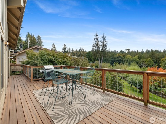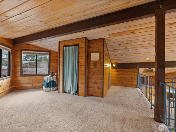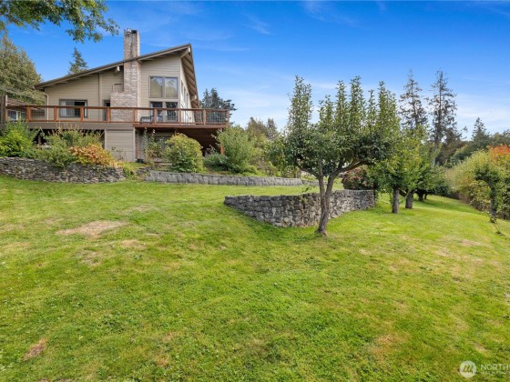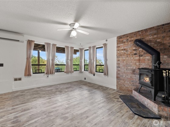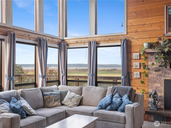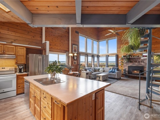 Tucked away on a dead-end street, this Warm Beach home features sweeping views! An oversized entry leads to the open floor plan connecting a gorgeous, cedar planked kitchen to the view-filled living room with doors out to the wrap-around deck—perfect for entertaining. The main-level primary suite features an updated bath and soaking tub. The unique spiral stairs lead to an upstairs loft space with a bedroom and private bath. The lower level offers a second living space including a kitchen, a great room with wood stove, a bedroom, 3/4 bath, and private entry. Additional features include ductless heat & A/C, new carpet, and an office/den space. Outside find RV parking, detached garage with shop, shed, and fruit trees.