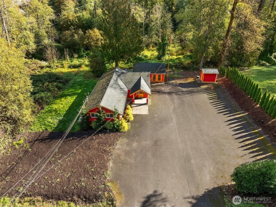 Residential home that was converted to office space. Will need conversion back to residential (Kitchen, and legal baths). Property is zoned R5 which means residential with "other activities" on the specific regulations. Possible home based business but again check with Snohomish Planning Department .Buyers should research to their satisfaction. At present there are 6 office/den spaces (bedroom size). entry, 3 half baths, 2 extra finished rooms and separate converted 24' by 24 ' detached garage with 1/2 bath and counters. Third building is well house. With house at 1425 sq ft and detached garage (bonus room conversion)of 576 sq ft this home potential is 2001 sq ft.