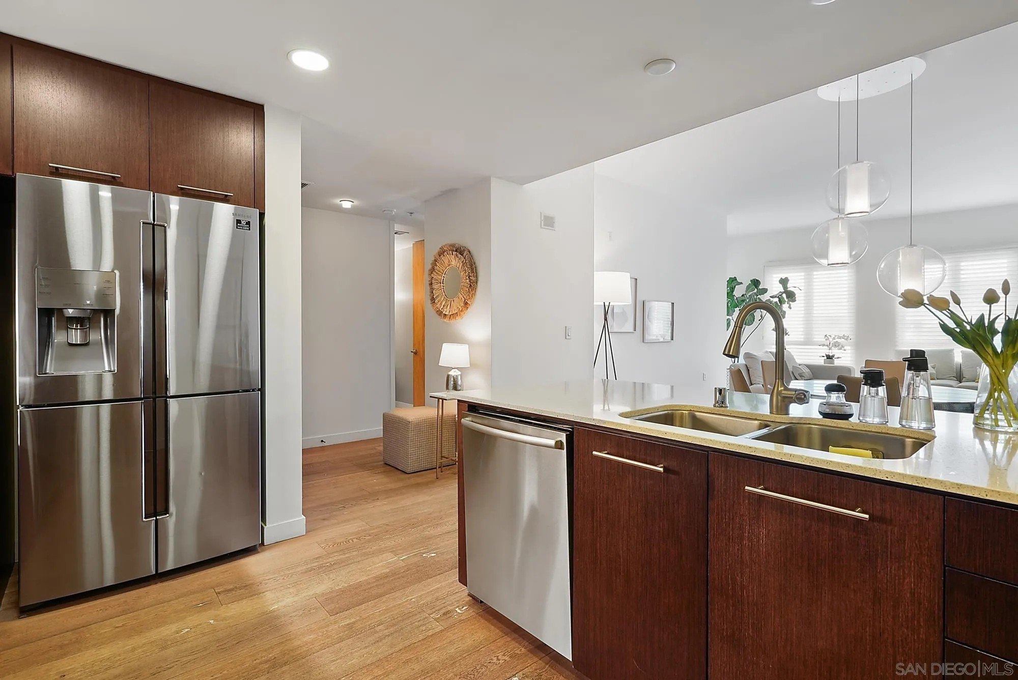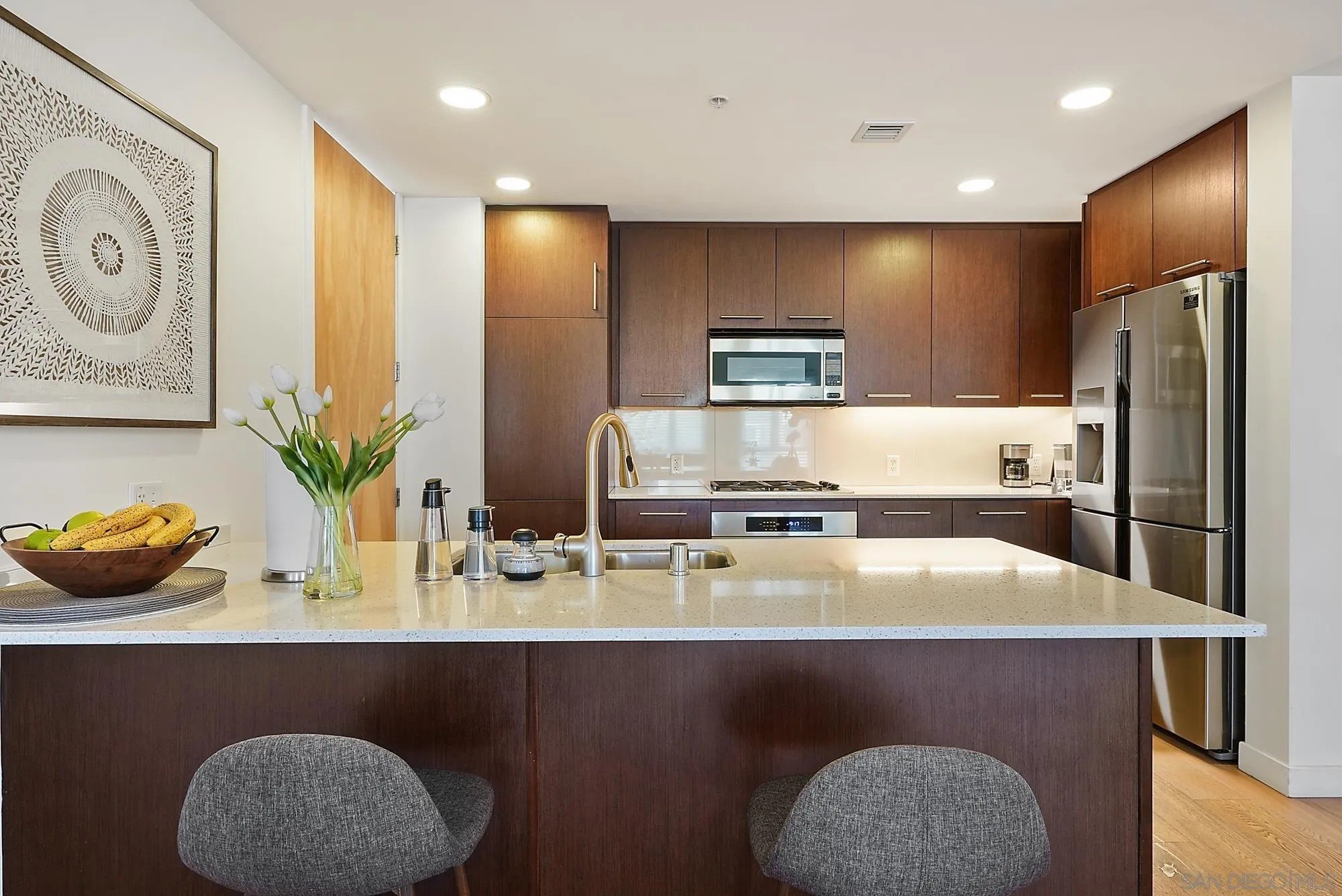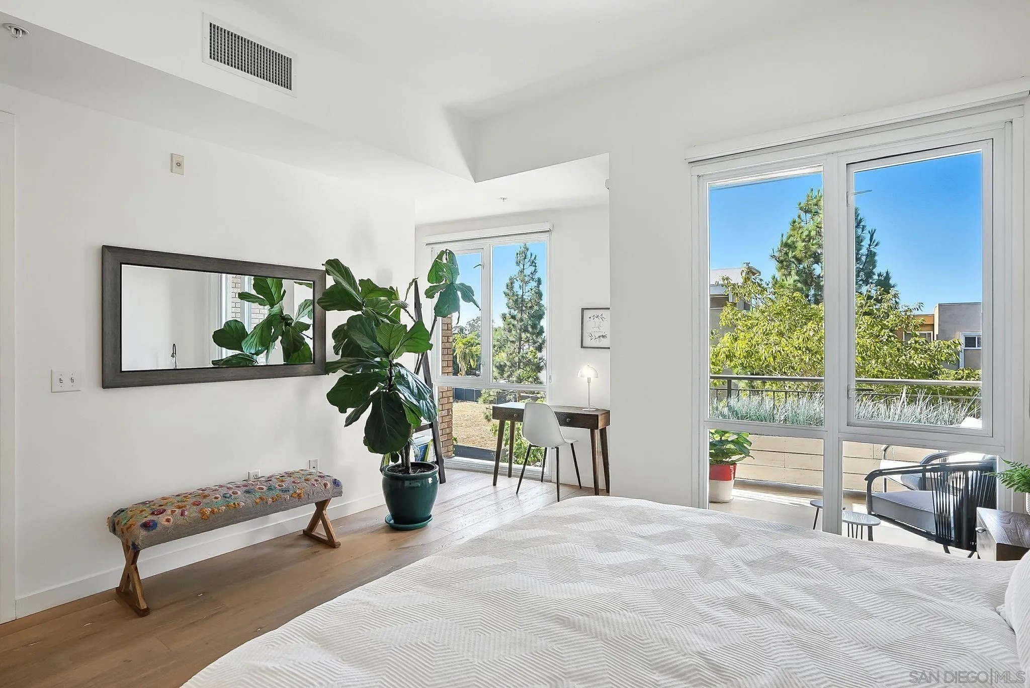 Step into elevated urban living with this stunning 2 bed, 2 bath condo in the prestigious 1Mission community-where timeless sophistication meets everyday comfort! The open-concept floor plan feels airy and expansive with soaring ceilings and sleek neutral-toned plank flooring throughout. At the heart of the home, the chef's kitchen shines with a generous island for bar seating, modern cabinetry, and luxe finishes; perfect for both casual mornings and lively evenings of entertaining. Smart design meets convenience with a laundry room that doubles as a walk-in pantry, giving you functionality without sacrificing style. Unwind on not one, but two private balconies, enjoy peaceful moments from the living room or retreat to the spacious primary suite, where you'll find a spa-inspired bathroom with dual vanities, walk-in closet, and tranquil design details. And the best part? Step outside your door and you're in the heart of Mission Hills, surrounded by award-winning restaurants, boutique shops, and charming cafes. Opportunities like this rarely come up in one of San Diego's most coveted addresses. Don't just find a home - find your lifestyle at 1Mission.