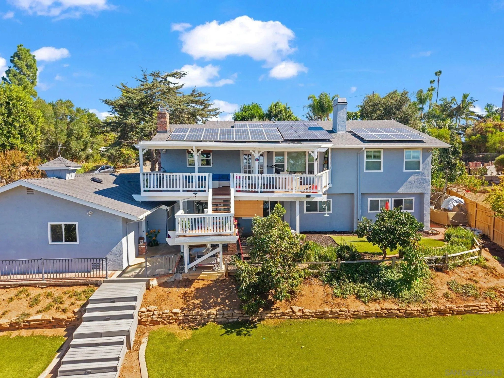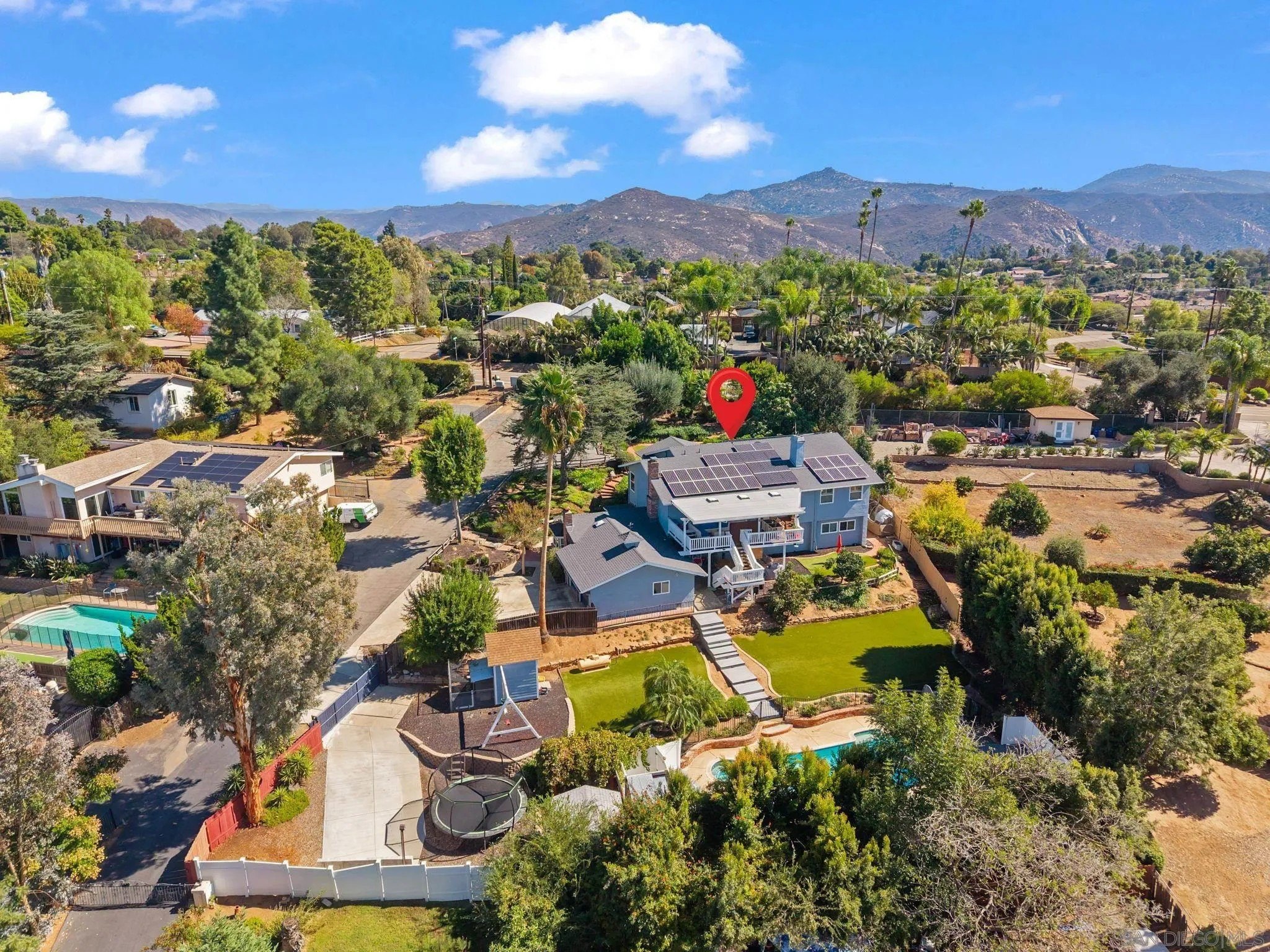 Welcome to luxury powered by 68 OWNED solar panels, including 3 Tesla power walls. Unparalleled elegance, sustainability and self-sufficiency are nestled in the hills of South Escondido delivering modern comfort while keeping operating costs remarkably low. With 5,368 sq.ft including an attached ADU, this palace is meticulously designed with living space ideal for family function & entertainment. A massive granite island highlights the open-concept kitchen which flows effortlessly into the upper-level living area where a 400+ sq. ft. covered terrace is the perfect spot to unwind with panoramic sunset views. The primary suite has striking vaulted ceilings with exposed beams, a spacious walk-in closet, and a luxurious spa-inspired bath ideal for relaxing. Additional bedrooms are thoughtfully placed on both levels. The lower level boasts a fully equipped ADU with private exterior access, a full kitchen, living room, an en-suite bath, laundry utilities, and it's own outdoor area-ideal for generating income and/or multi-generational living. Exposure from the west side bathes the property in natural light & delivers breathtaking sunsets. The massive lot is highlighted by numerous fruit-bearing trees including Macadamia, Avocado, Pomegranate, Orange, Lemon, and more along with thriving grapevines-creating a private orchard retreat. Adding to it's charm, the estate is home to six hens that produce over two dozen eggs weekly, enhancing the self-sustaining lifestyle. With a fully fenced & heated pool & spa, turf lawns, and a charming playhouse, this property is truly extraordinary!