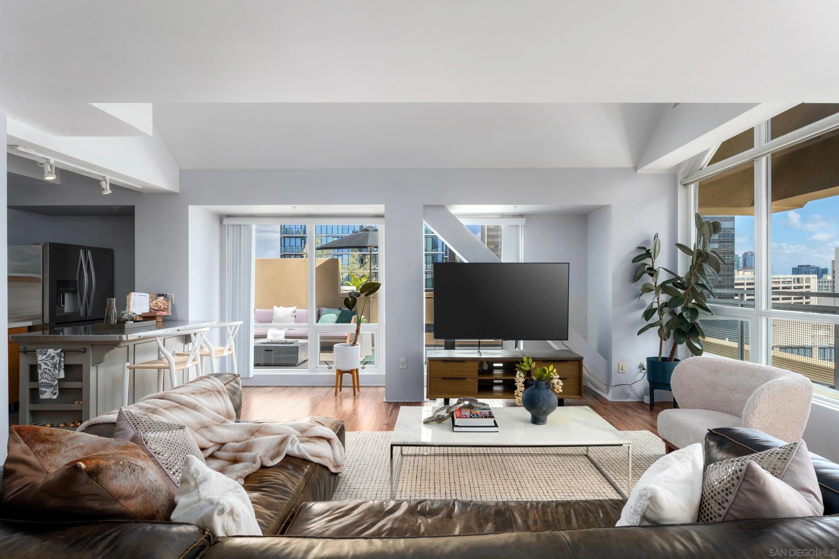 Rare opportunity to own a top-floor, corner residence with an extra large private exterior patio in the heart of Little Italy. This highly coveted two-story condo lives like a townhome, offering one of the largest and most chic floor plans in the building - with striking architectural design and an abundance of natural light throughout. The primary suite occupies the entire upper level, creating a true retreat complete with its own full bathroom, while the second full bathroom downstairs adds functionality and flexibility. High-volume ceilings, expansive windows, and a thoughtful layout enhance the sense of space and openness, while city and ocean views provide an ever-changing urban backdrop. Additional highlights include two side-by-side parking spaces, a private storage unit in the garage and low HOA dues - a rare combination for downtown living. The oversized private patio is exclusive to this unit, offering an ideal setting for entertaining, relaxing, or enjoying indoor-outdoor living above the city. Perfectly positioned just steps from India Street's renowned restaurants, cafes, bars and nightlife - with the waterfront only blocks away. A new Whole Foods is coming soon just two blocks away, adding even more convenience to an already unbeatable location. Penthouse-style living under $1M with views like this is nearly impossible to find in the city- making this a truly exceptional offiering in one of San Diego's most vibrant neighborhoods.