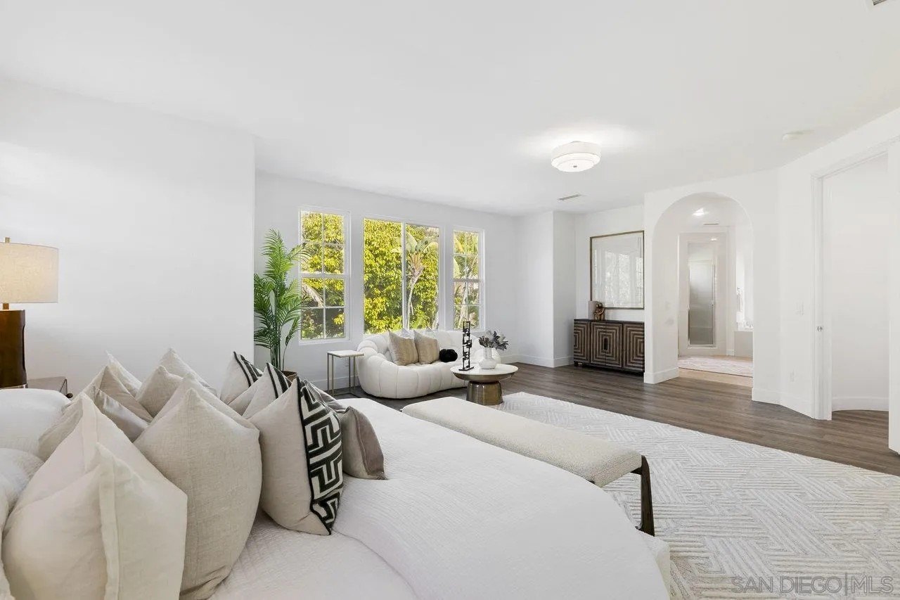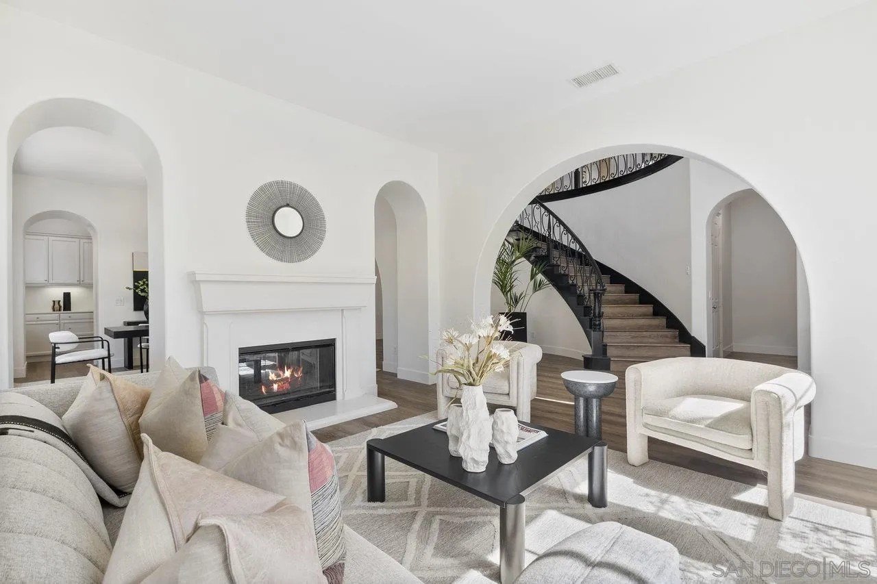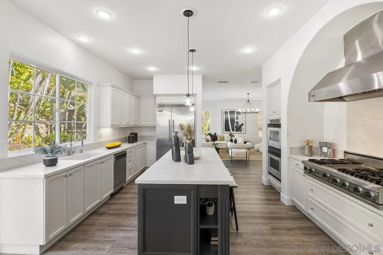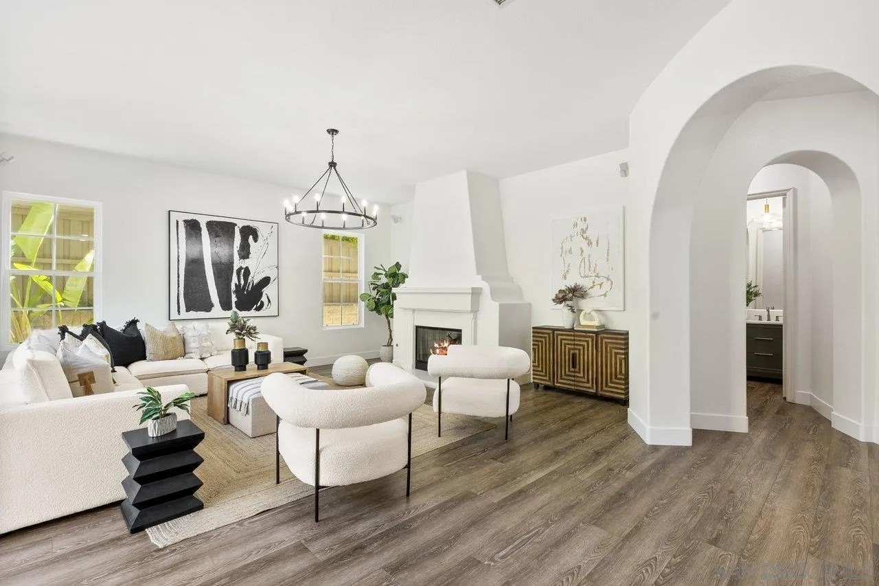 Nestled in the exclusive gated community of Torrey Woods Estates this exceptional home offers the unique advantage of choice between two top-rated elementary schools: Ocean Air or Torrey Hills. Gated courtyard entry invites you into a freshly painted home with designer finishes. Grand formal entry with cathedral ceilings open to formal living and dining rooms with dual-sided fireplace. New luxury vinyl plank flooring throughout, custom lighting, and an abundance of natural light throughout. The chef's kitchen featuring an oversized island with prep sink, pendant lighting, Quartz countertops, a spacious eat-in area, walk-in pantry, built-in desk, premium Viking appliances including a 6-burner cooktop with hood and professional-grade refrigerator-all seamlessly flowing into the family room with fireplace.
