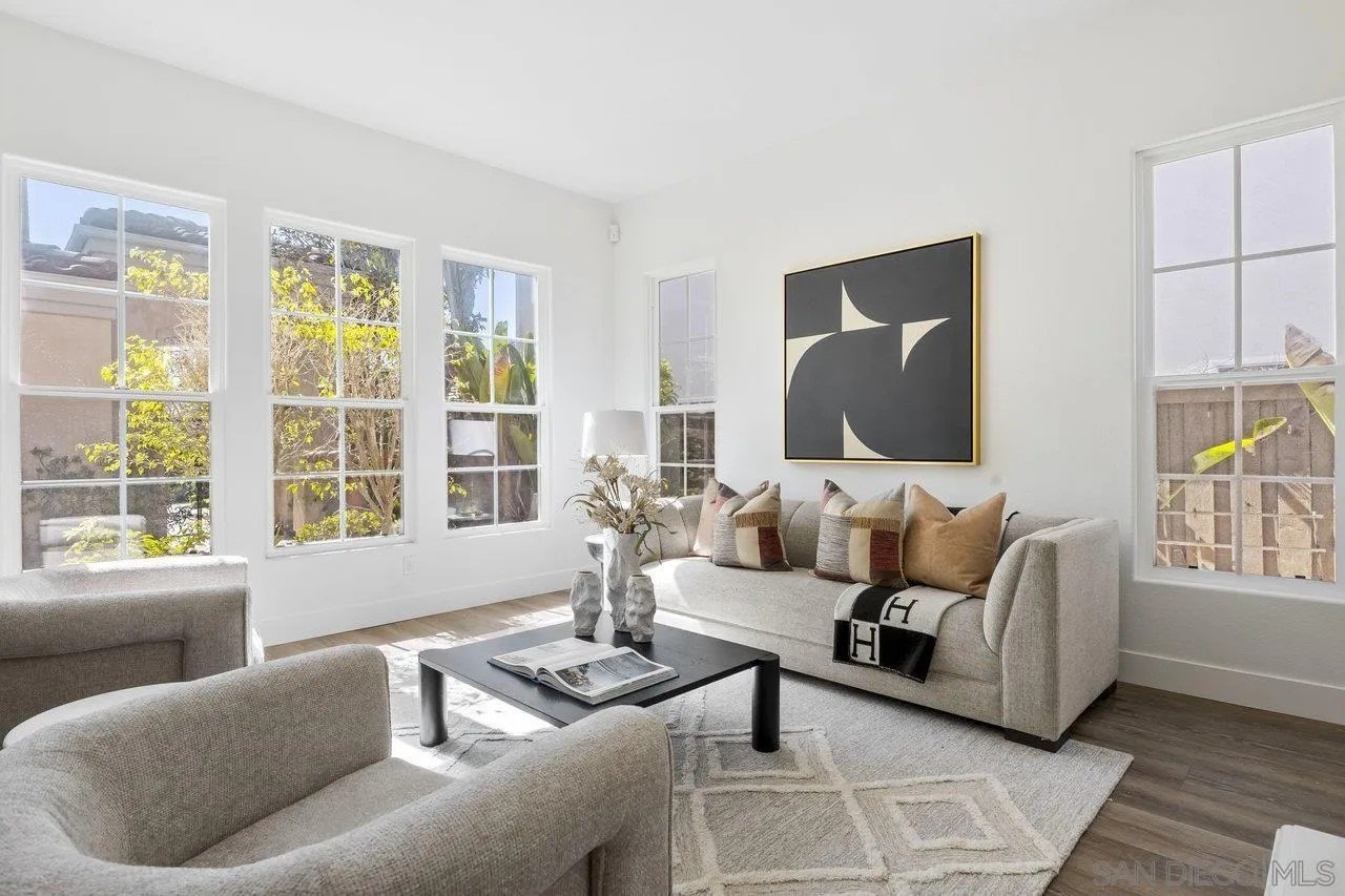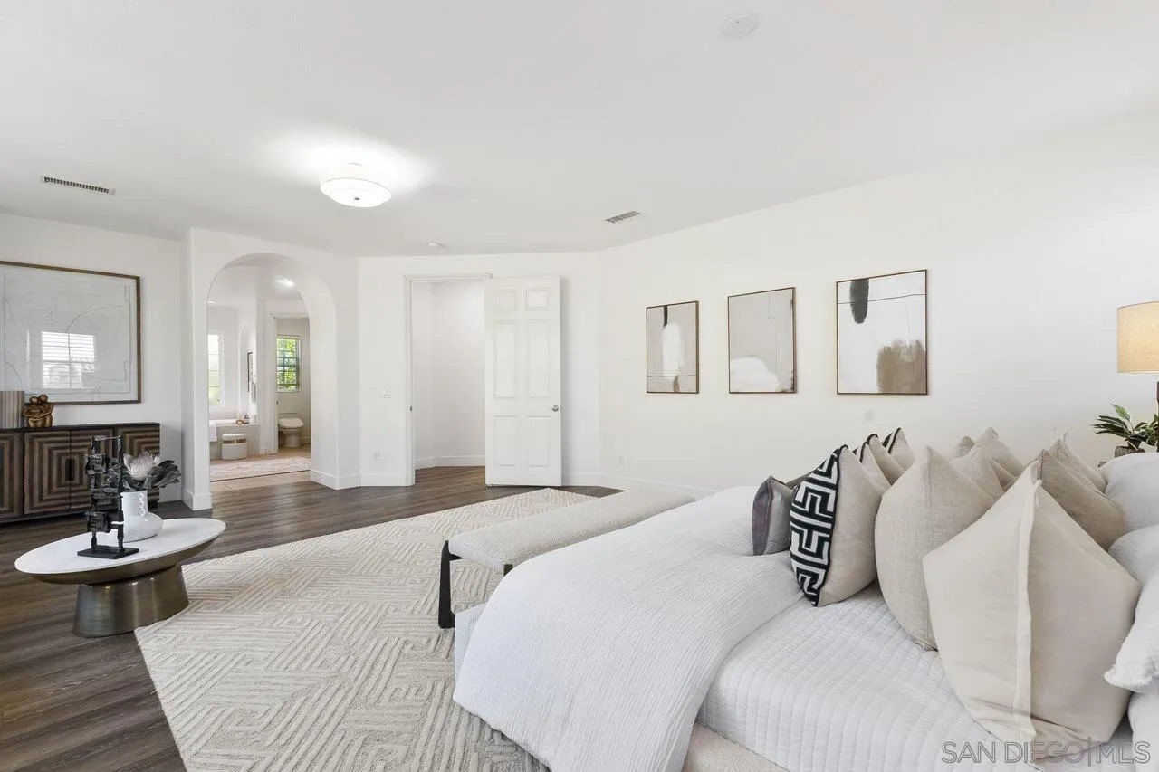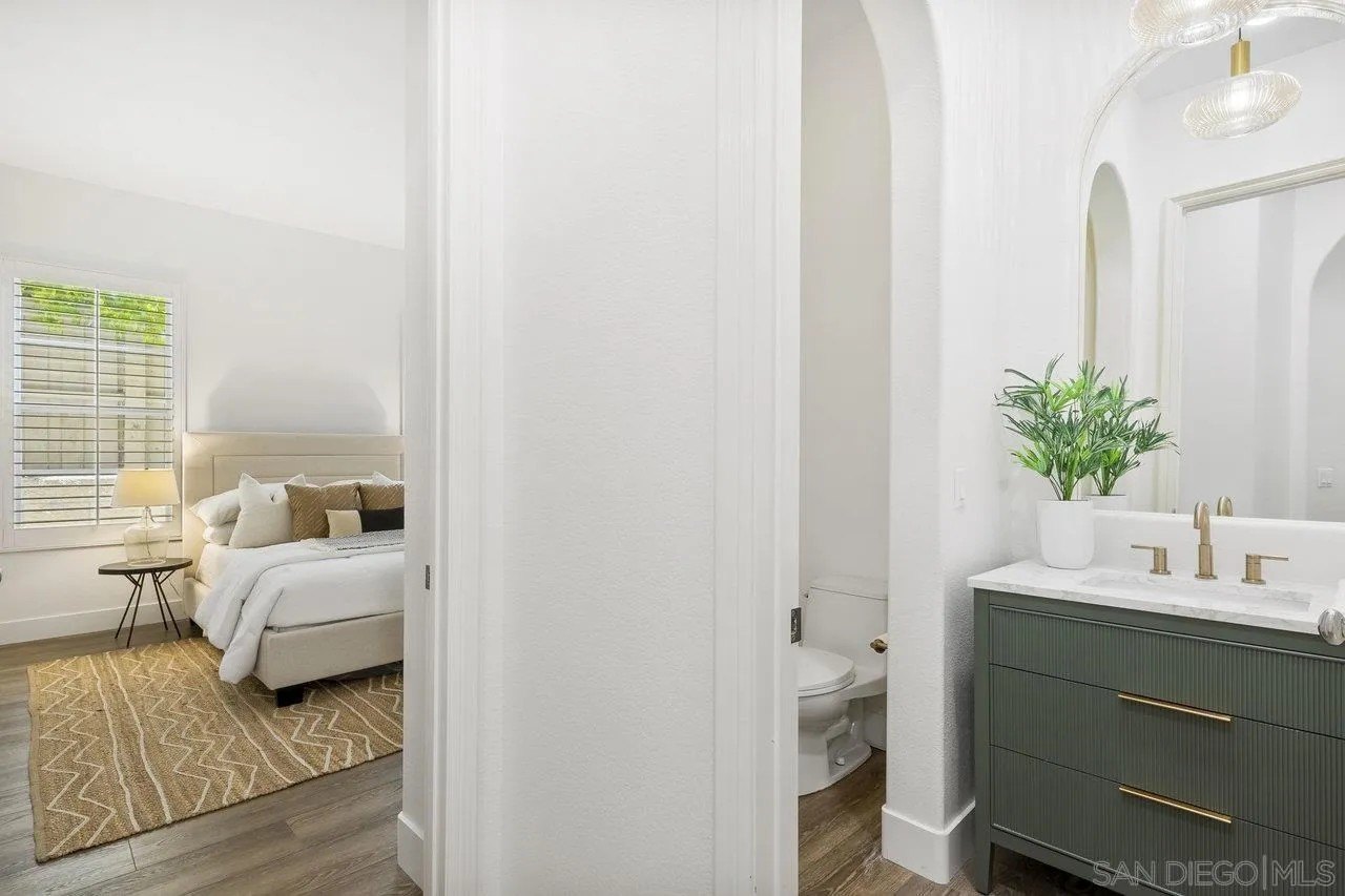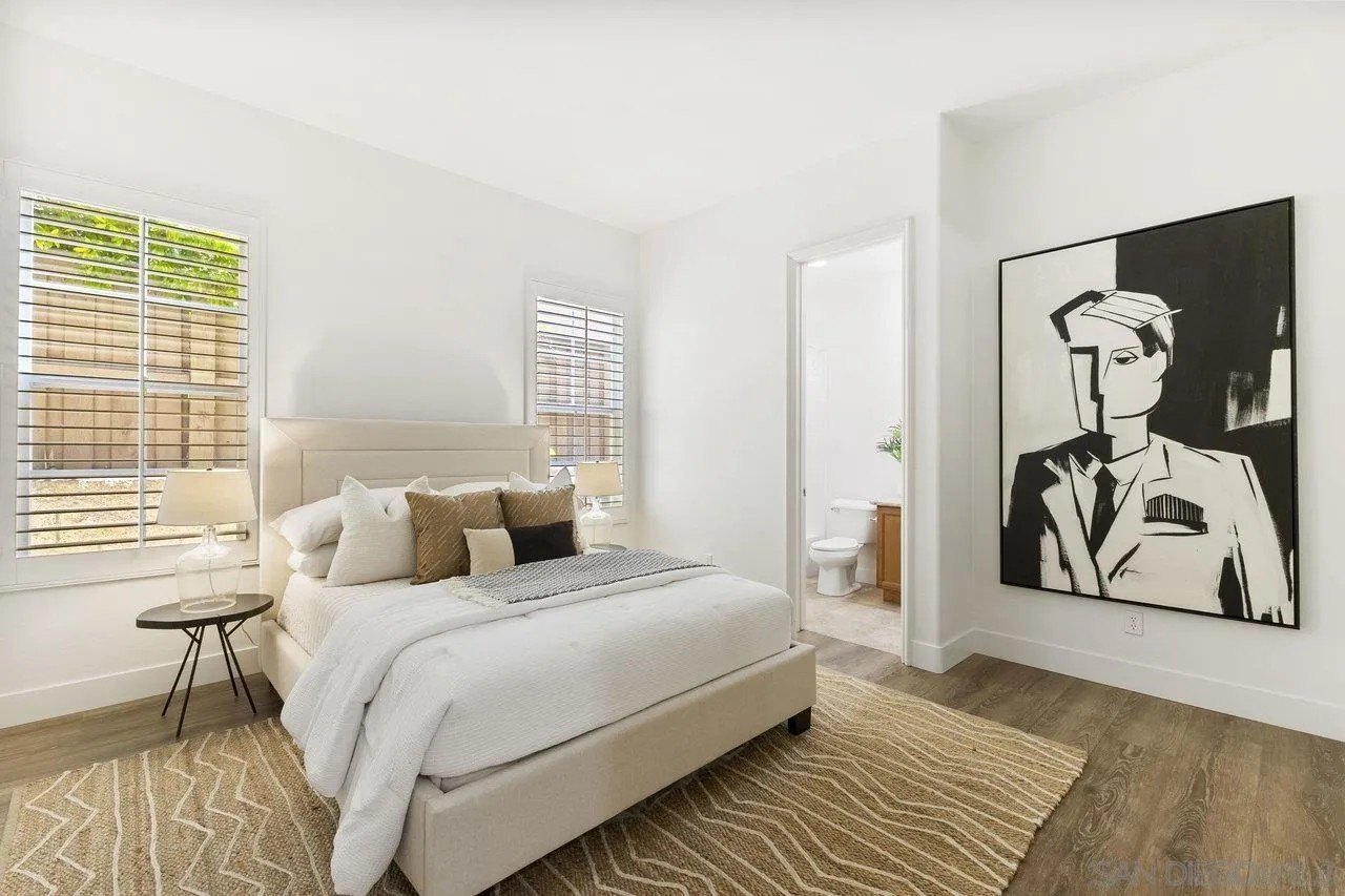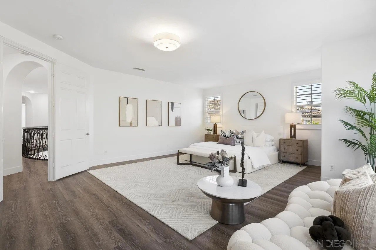 Nestled in the exclusive gated community of Torrey Woods Estates this exceptional home offers the unique advantage of choice between two top-rated elementary schools: Ocean Air or Torrey Hills. Gated courtyard entry invites you into a freshly painted home with designer finishes. Grand formal entry with cathedral ceilings open to formal living and dining rooms with dual-sided fireplace. New luxury vinyl plank flooring throughout, custom lighting, and an abundance of natural light throughout. The chef's kitchen featuring an oversized island with prep sink, pendant lighting, Quartz countertops, a spacious eat-in area, walk-in pantry, built-in desk, premium Viking appliances including a 6-burner cooktop with hood and professional-grade refrigerator-all seamlessly flowing into the family room with fireplace.