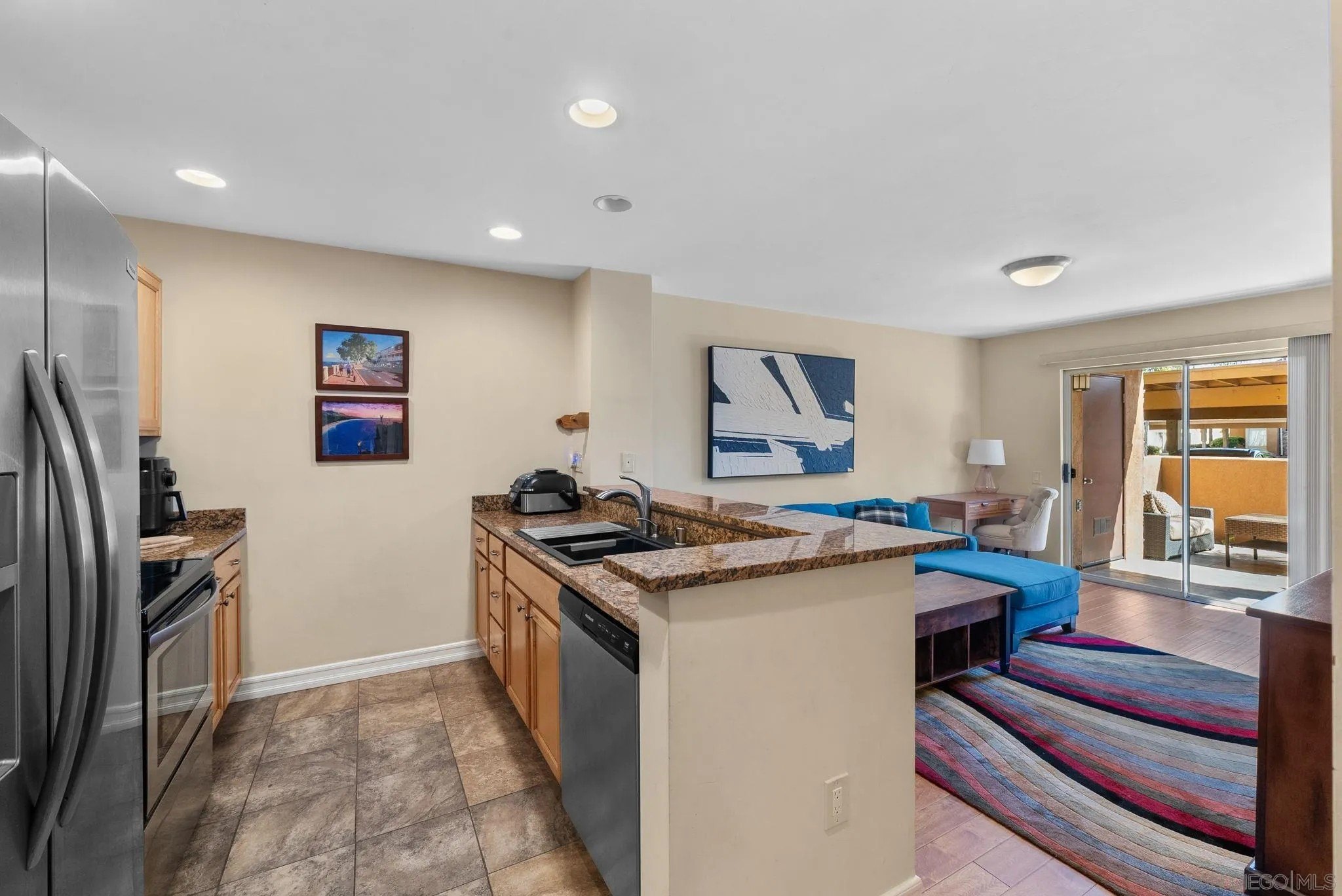 Step into this MOVE-IN READY beautifully maintained 1-bedroom, 1-bath and instantly feel at home. Designed for comfort and convenience, this LIGHT and BRIGHT unit boasts an updated kitchen with gleaming granite countertops, stainless steel appliances, and rich wood cabinetry. The eat-in bar adds functionality and style, making it a perfect spot for casual meals or entertaining guests. Spacious bedroom with mirrored closet doors. Enjoy the convenience of IN-UNIT LAUNDRY and the seamless flow to your partially-covered patio-ideal for morning coffee or relaxing evenings. An outdoor storage closet adds extra functionality to this lovely space. Part of the highly sought-after Villa Taviana community, you'll enjoy resort-style amenities, including two sparkling pools with spas, a fitness center, tennis courts, BBQ areas, a clubhouse, andEV charging stations. HOA covers water, trash pickup, exterior maintenance, and roof care, ensuring easy living.LOCATION for this unit is one of the best in the complex. Reserved carport parking adds an extra layer of convenience. Perfectly situated with easy freeway access, this condo is close to shopping, dining, award-winning schools, and everything else you need.It's more than a home, it's a lifestyle!