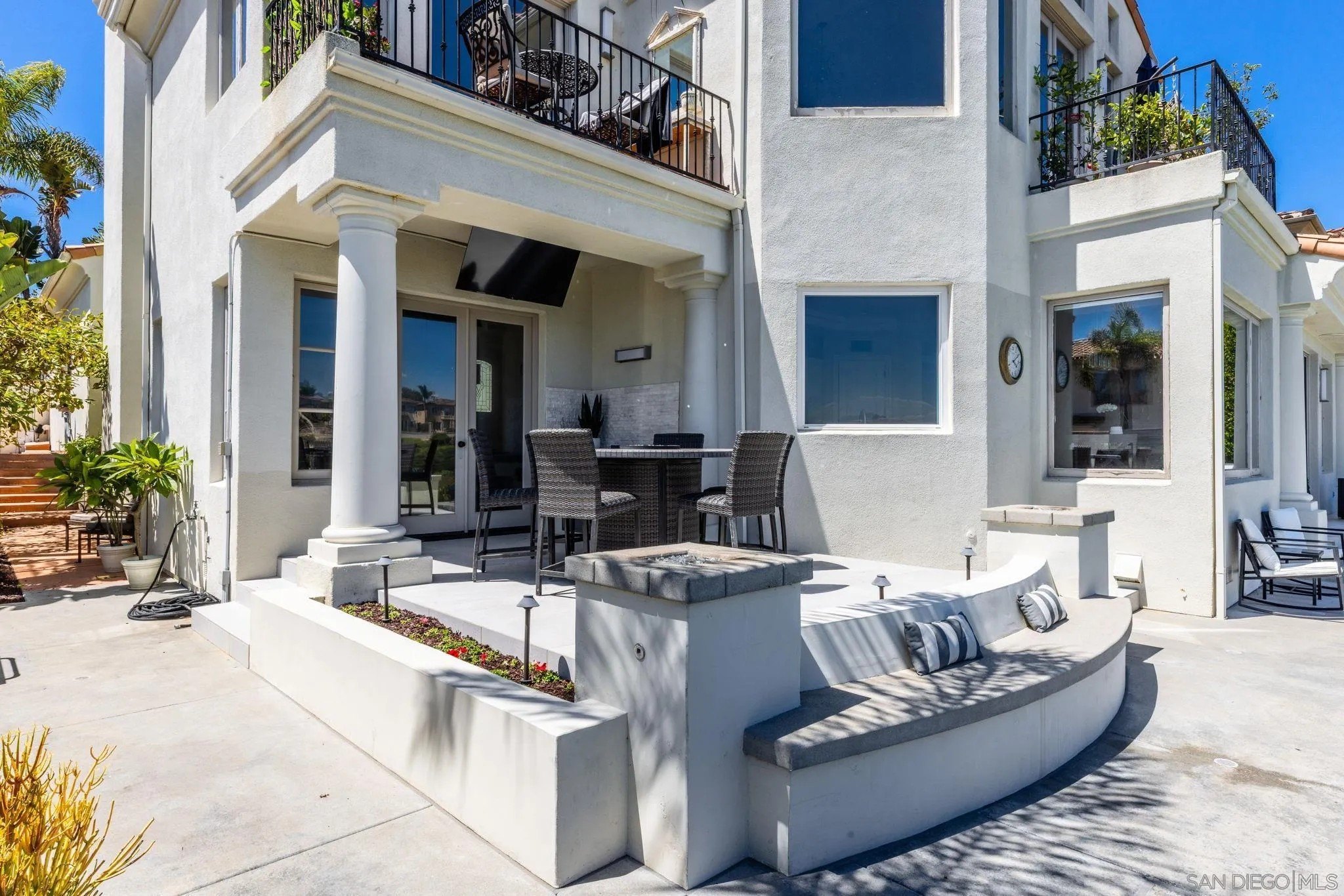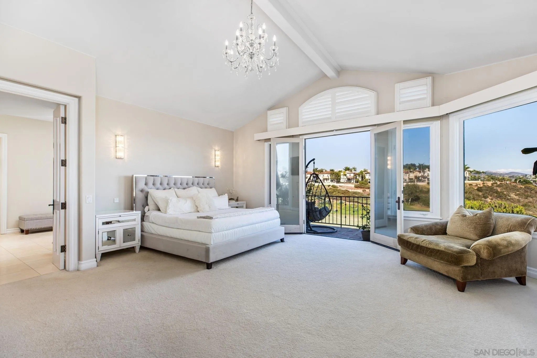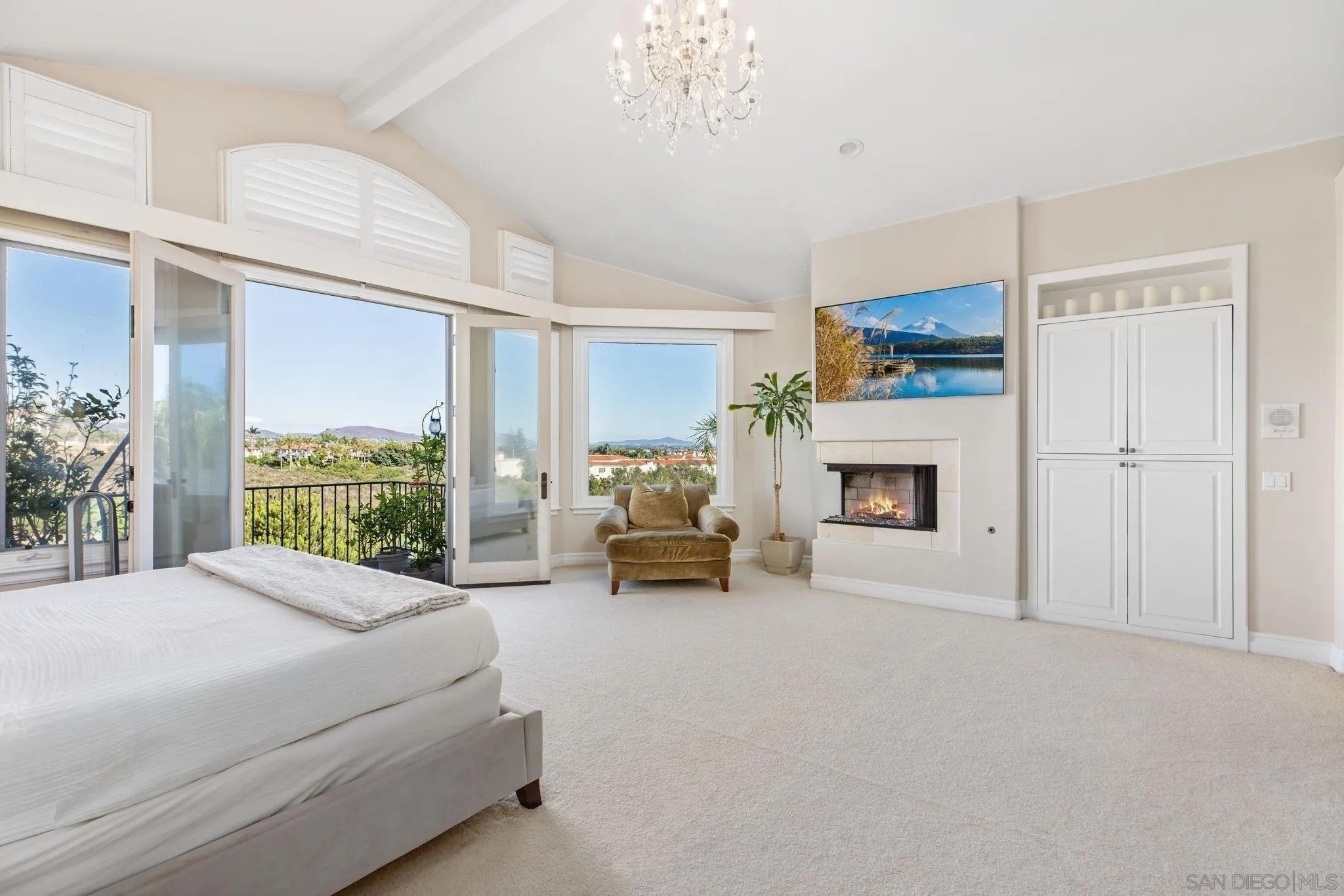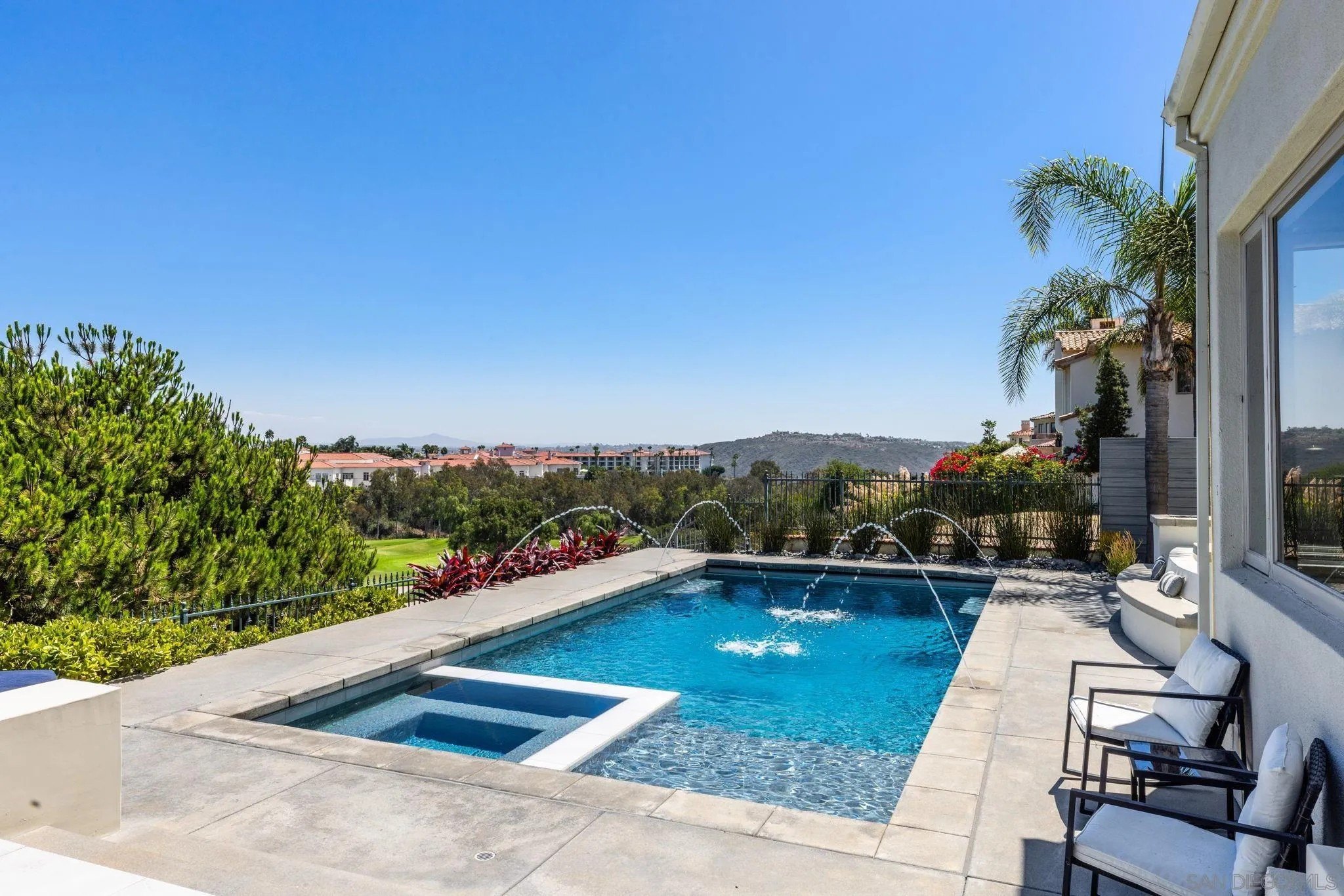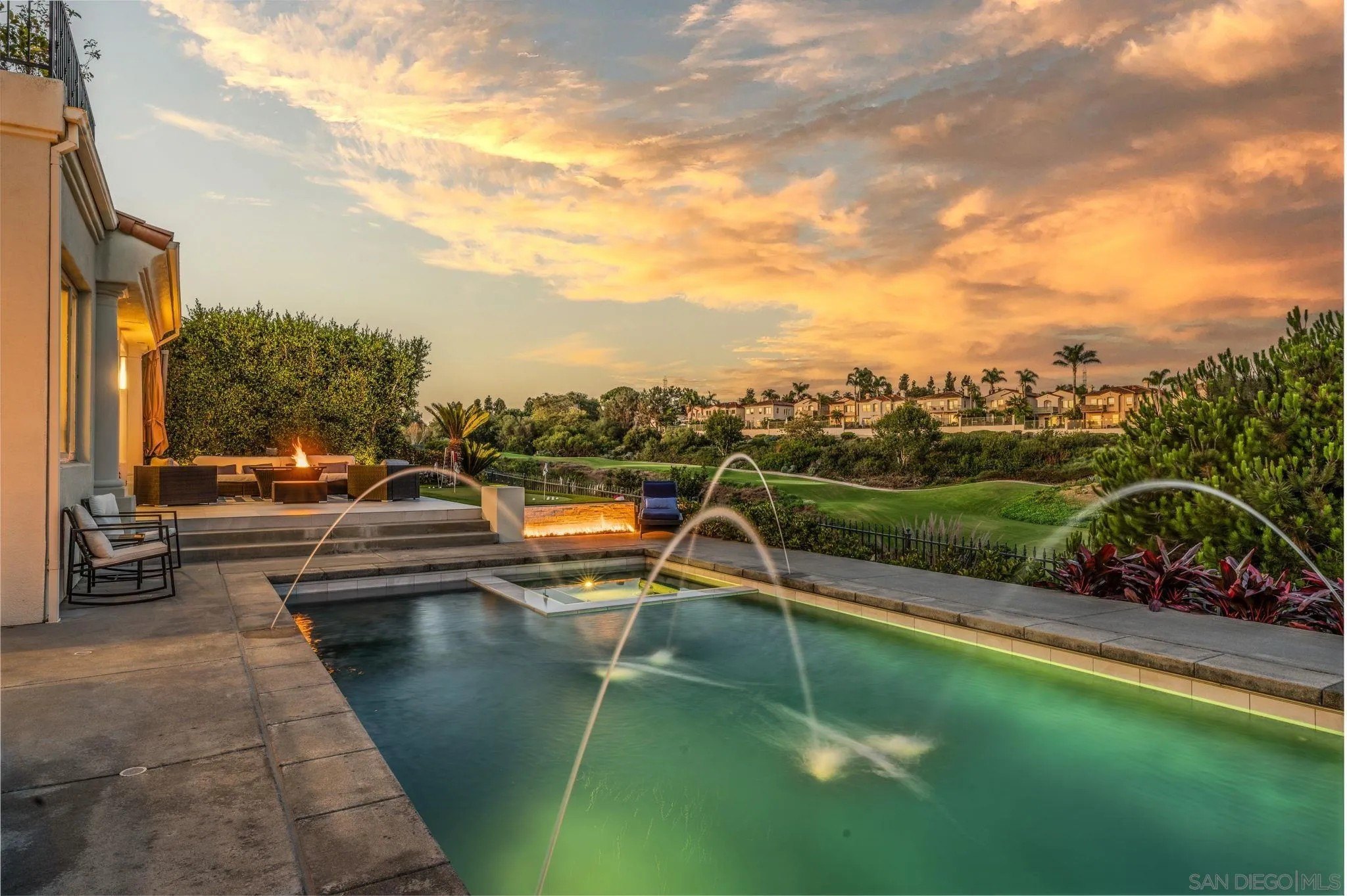 Located in the highly sought out gated community of Aviara Point, this custom-built home offers incredible 180 degrees views of the Aviara Golf Course and surrounding mountains! The home blends comfort, privacy, and functionality in a peaceful and scenic setting. The private backyard is an entertainers dream that includes a pool with electric cover, spa, fire pit, putting green, built-in BBQ, and even an outdoor shower -all surrounded by lush landscaping and open views of the 7th hole. Enjoy California's indoor/outdoor living at its finest! As you step inside the home, you're welcomed by a light-filled entry with high ceilings and a sweeping staircase. The open-concept great room features large windows that frame spectacular views, while the gourmet kitchen is fully equipped with stainless steel appliances, double ovens, built-in fridge, and a large center island -ideal for both everyday living and grand entertaining. The layout includes two spacious downstairs suites with private entrances-perfect for guests, multi-generational living, or private maid's quarters. Upstairs, the luxurious primary suite offers a sitting area with fireplace, spa-inspired bath with Jacuzzi tub, large walk-in shower, dual walk-in closets, and beautiful wood french doors opening to a private balcony with endless views. Three additional en-suite bedrooms down the hall ensure comfort and privacy for all.