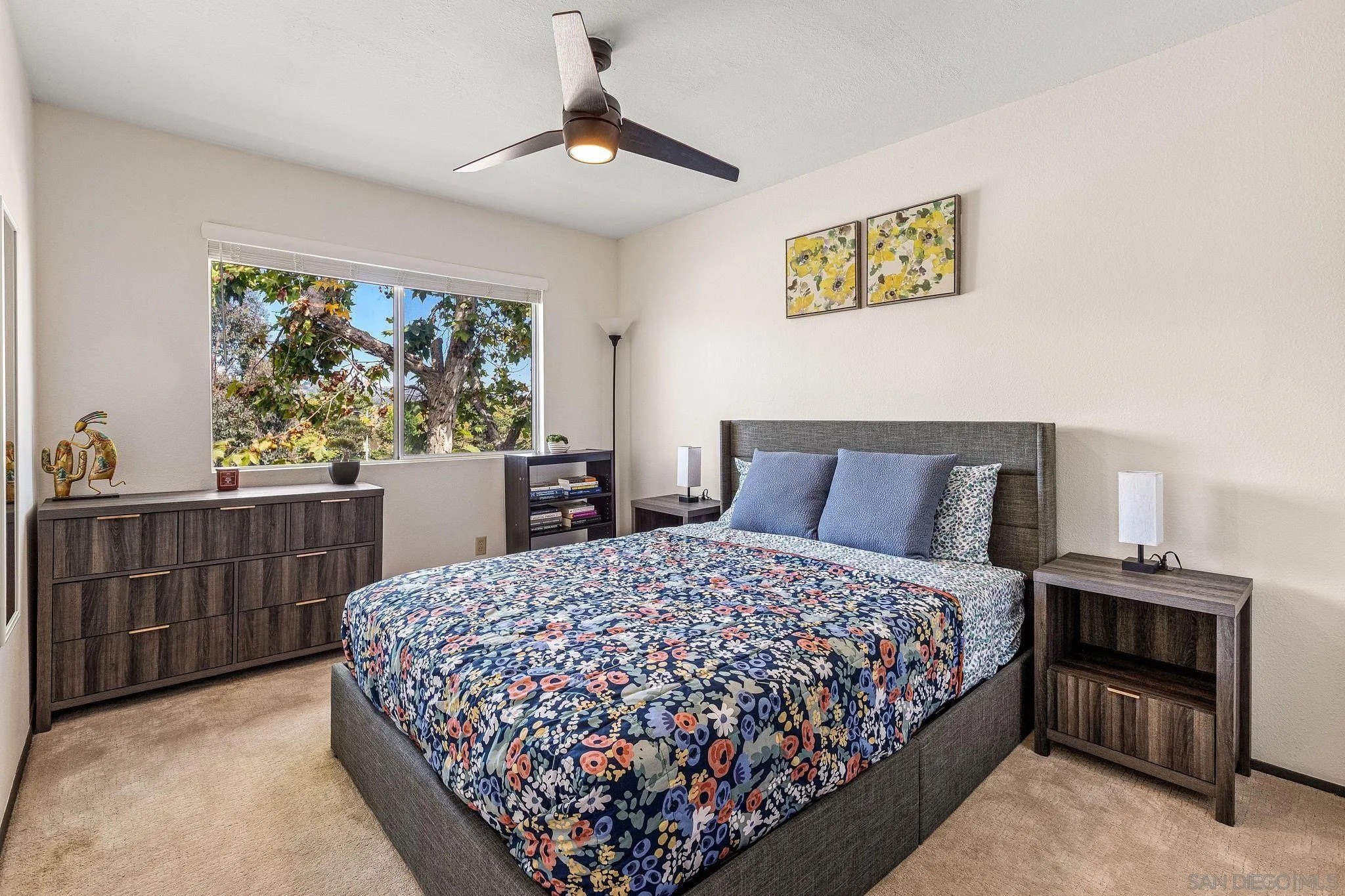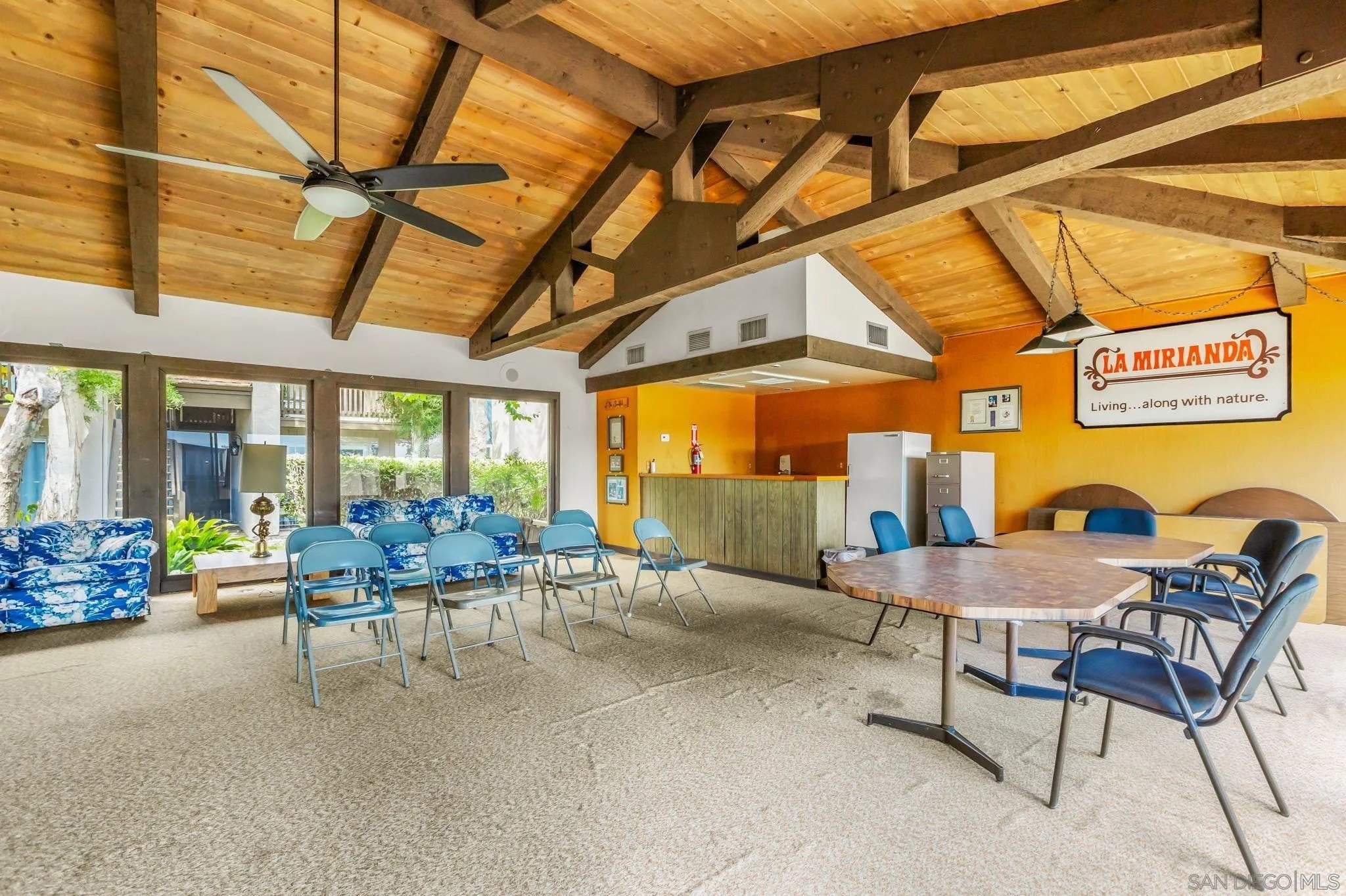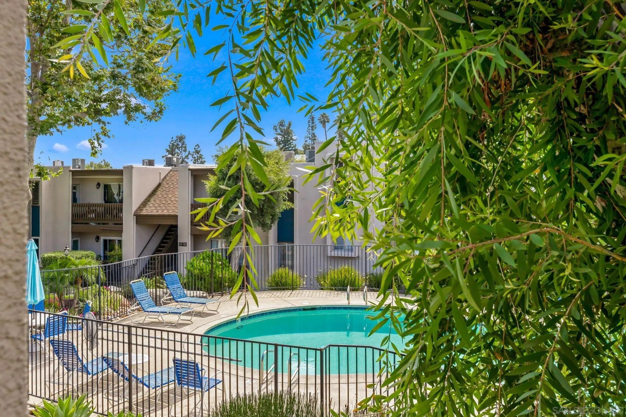 Welcome to the desirable garden community of La Miranda, known for its lush landscaping, tranquil water features, resort-style pool, and inviting clubhouse. Ideally positioned on the second floor, it boasts two private patios-one with sweeping views of the mountains to the east and another overlooking the serene gardens and pool. Inside, the cozy living room opens to a patio through sliding glass doors, creating the perfect spot to enjoy your morning coffee or the gentle breeze. The kitchen, which flows seamlessly into the living area, features a pass-through window to the patio-ideal for entertaining. Don't miss the stunning beamed accented ceiling in the dining area, adding elegance to all your gatherings and meals. The spacious primary bedroom offers a walk-in closet, an upgraded en suite bathroom, and its own patio with mountain views. The secondary bedroom also enjoys mountain vistas and ample closet space. The secondary bathroom has also been upgraded with modern flair. Additional features include an assigned parking space, plenty of storage space, and access to the community's sparkling pool and spa, barbecue area, laundry facilities, and clubhouse complete with a pool table and fitness equipment. Conveniently located near shopping, Costco, restaurants, I-8, Lake Murray, and SDSU, this well-maintained community combines comfort, convenience, and charm.