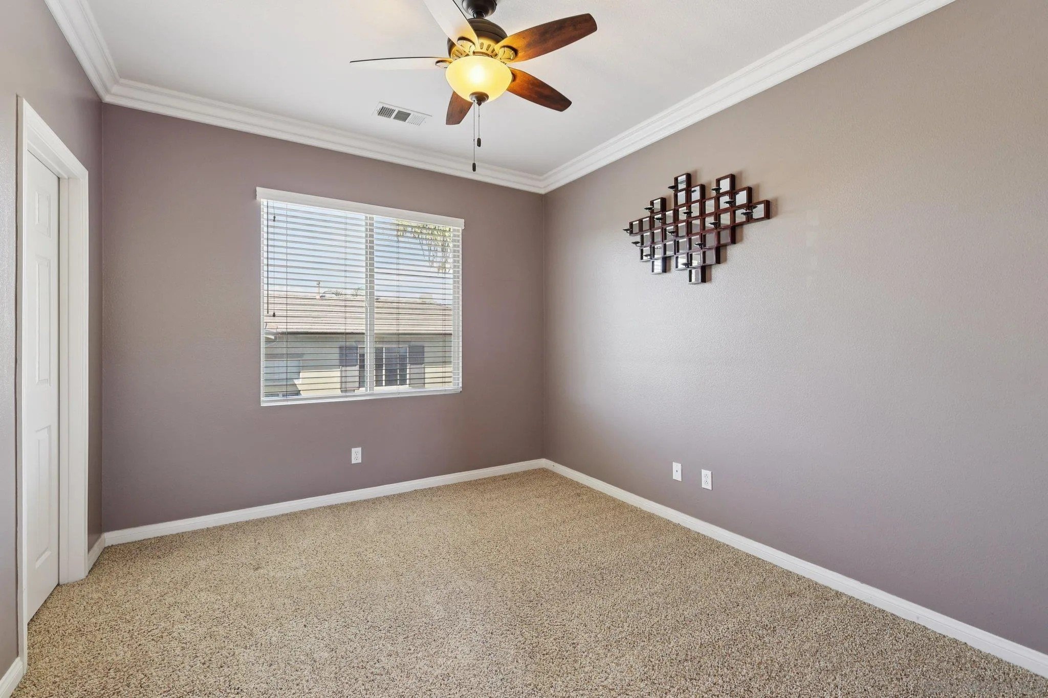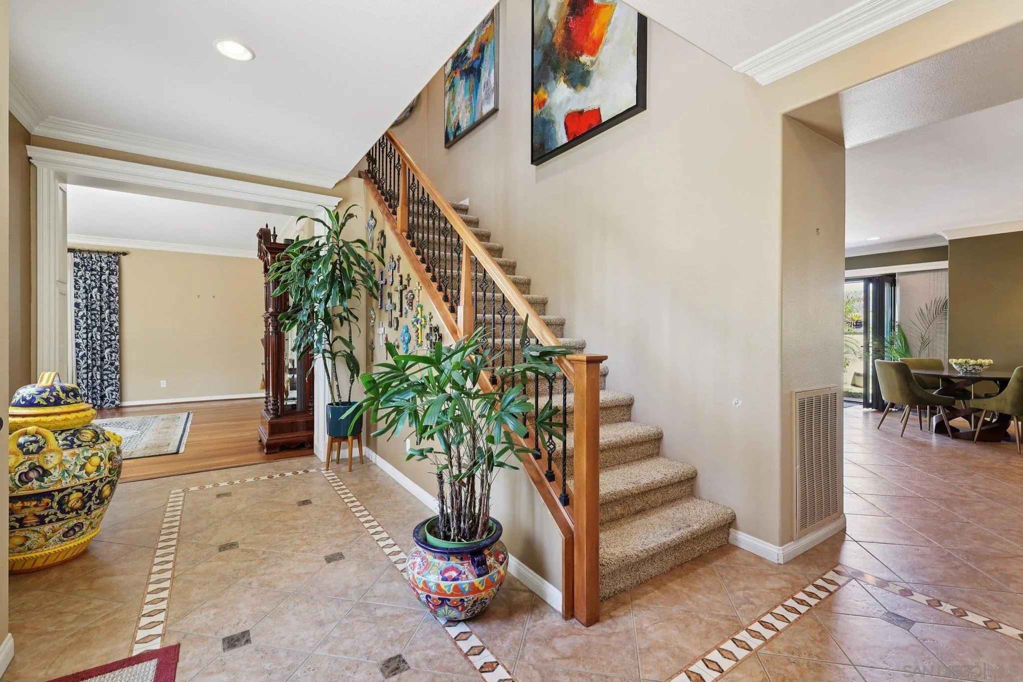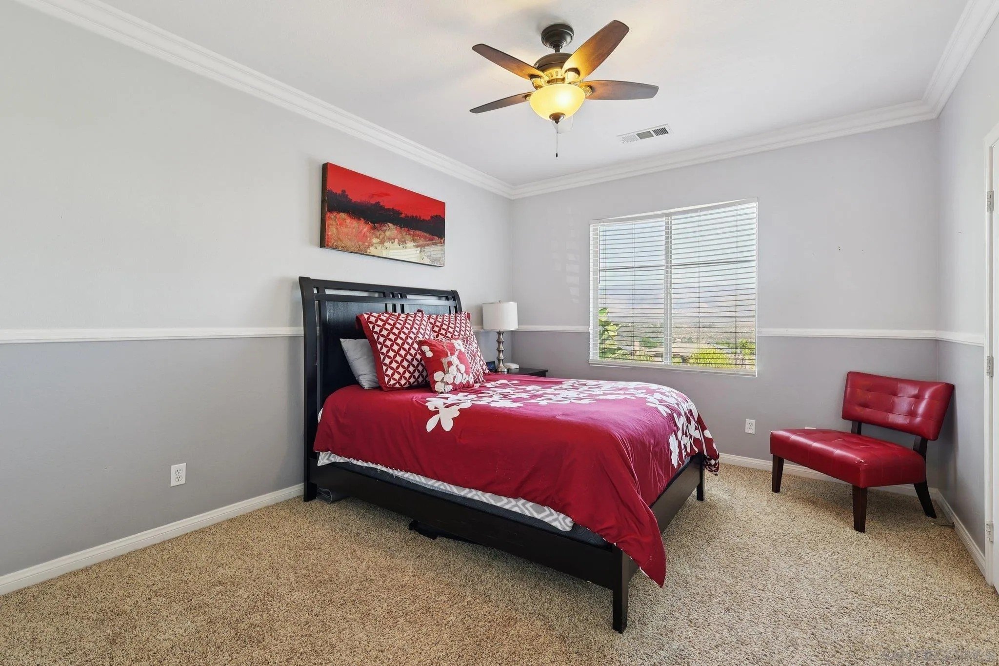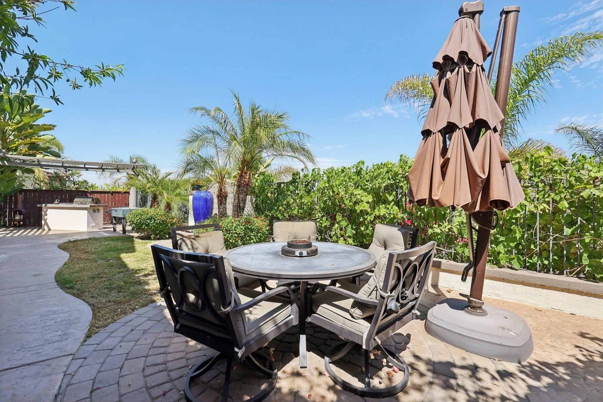 Spectacular Winding Walk Home | 5 Bedrooms + Bonus Room | 4 Baths | 3-Car Garage | Panoramic Mountain Views | Backyard Paradise Welcome to this stunning, upgraded residence located in the highly desirable Winding Walk community. This expansive home features five spacious bedrooms, four full bathrooms, an entertainment/media room that can be easily converted into a sixth bedroom, and a flexible floor plan ideal for multigenerational living. With a full bedroom and bathroom on the ground floor and extensive high-end upgrades throughout, this property exemplifies luxury living. As you arrive, the curb appeal is immediately impressive with mature palm trees, a beautifully designed stamped concrete driveway and walkway, and a charming fenced front patio surrounded by lush landscaping. Inside, the grand foyer features elegant ceramic tile with inlaid marble accents, setting the tone for the refined design seen throughout the home. The remodeled gourmet kitchen, updated just 2.5 years ago, is a chef’s dream. It features rich wood cabinetry, sleek granite countertops and backsplash, double ovens, stainless steel appliances, and a walk-in pantry. High-end three-panel accordion doors connect the kitchen and family room to the backyard, allowing for seamless indoor-outdoor entertaining.