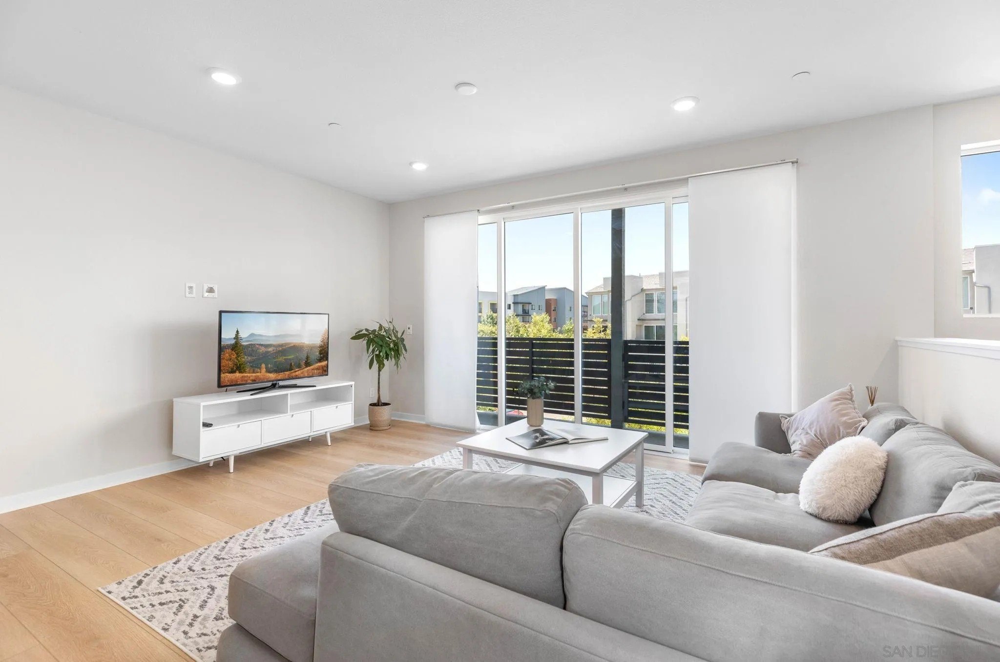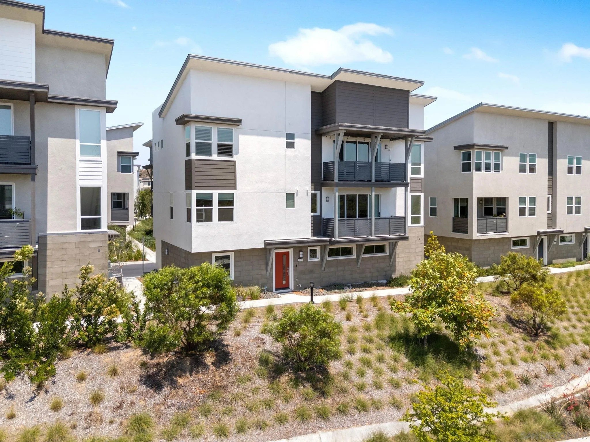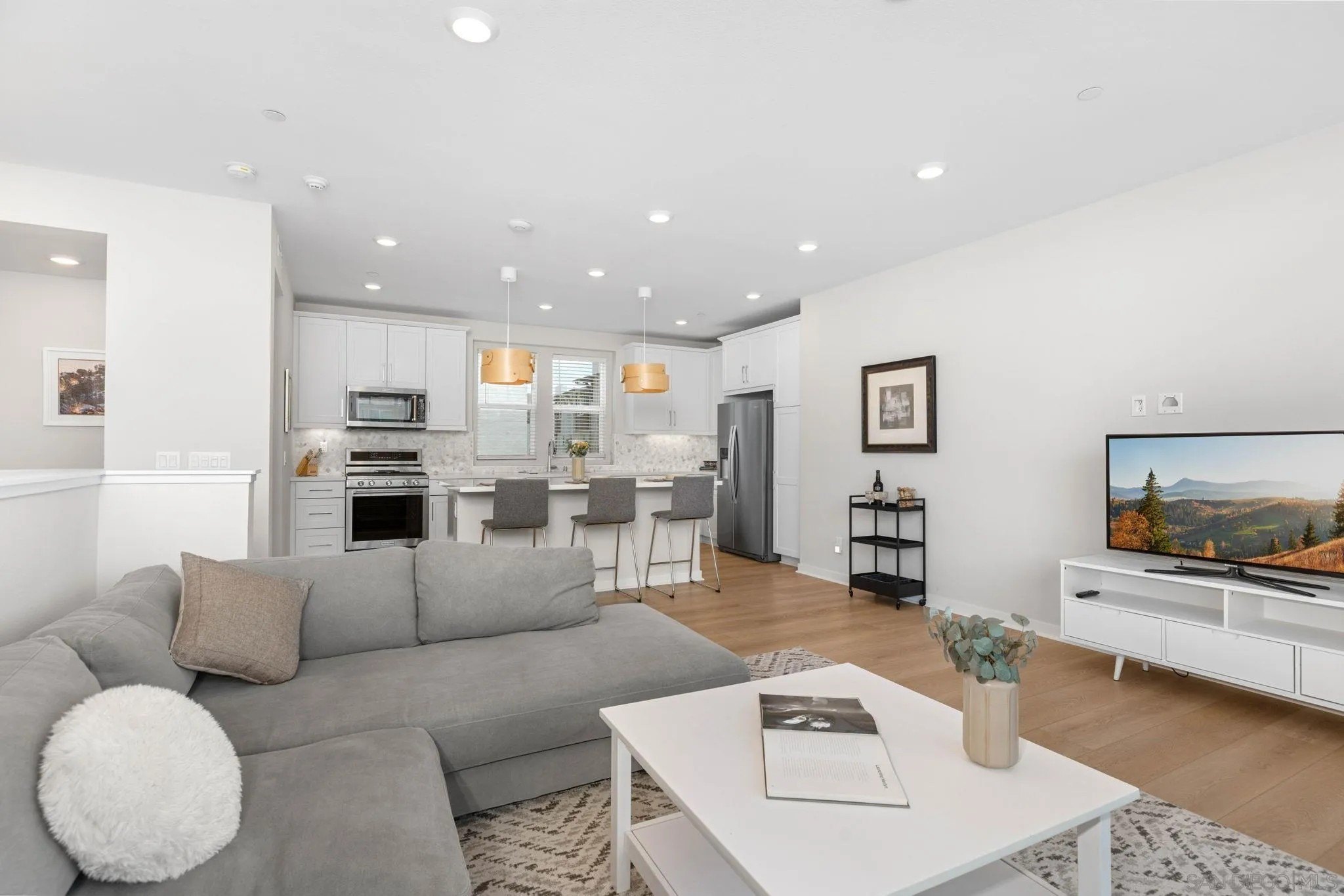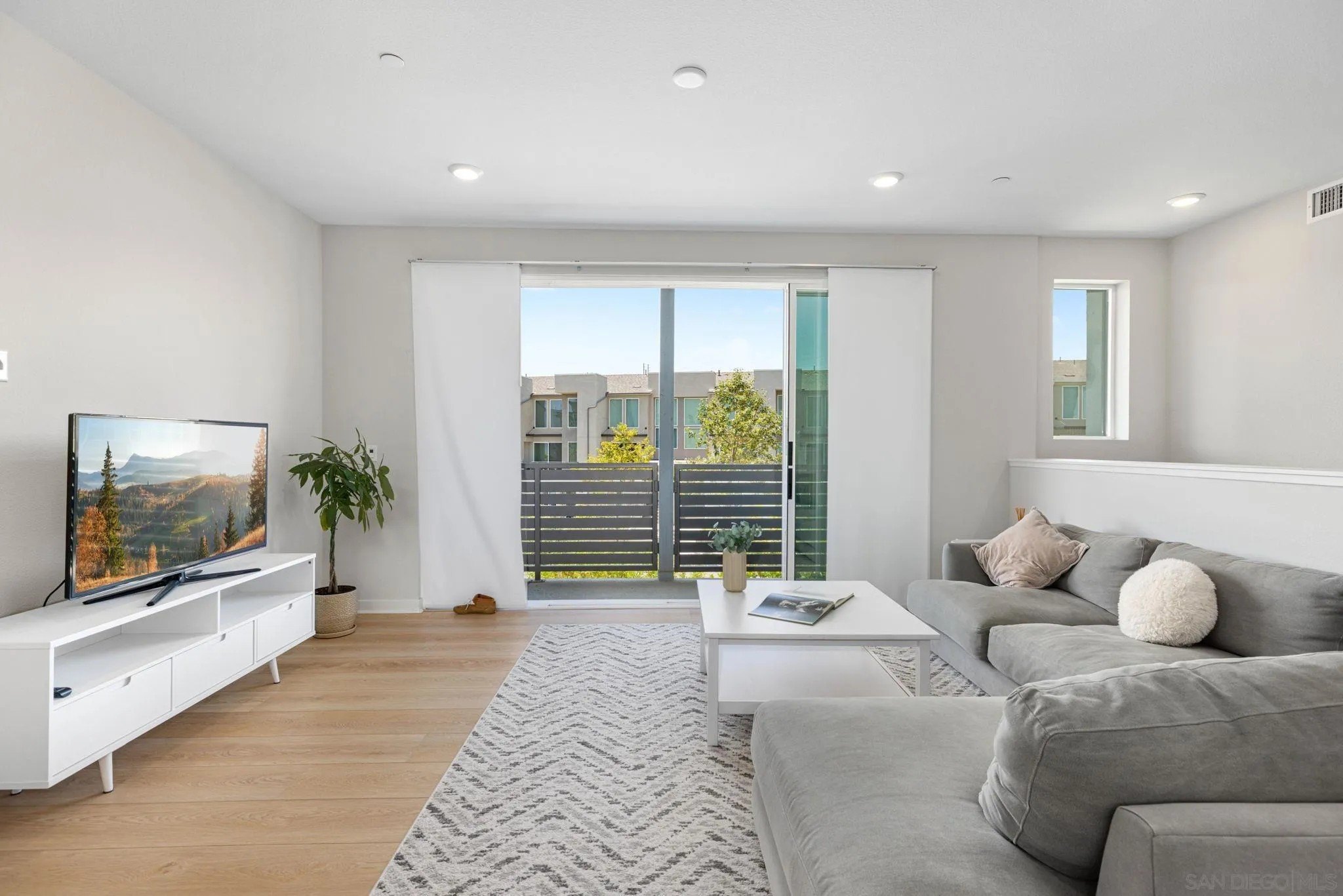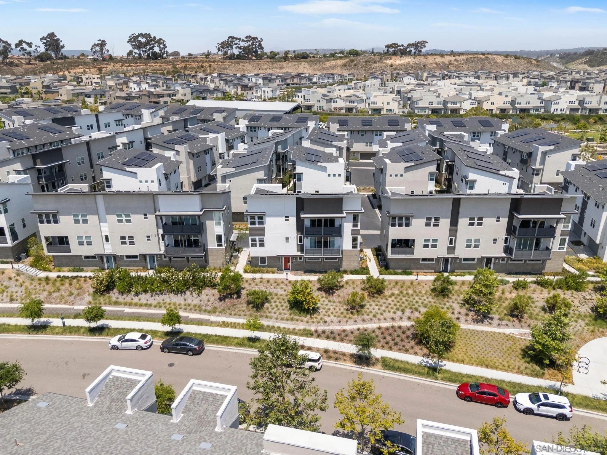 Tucked into one of San Diego’s most thoughtfully designed wellness communities, this beautifully upgraded 2 bed, 2 bath end-unit townhome offers 1,230 sq. ft. of elevated living in the heart of 3Roots, Sorrento Mesa. Completed in 2022, this nearly new home combines sleek, modern finishes with energy-efficient upgrades and a layout designed for both comfort and connection. Step inside and feel the difference. The open-concept layout is bright and airy, anchored by a stunning multi-slide patio door that opens to your private outdoor space—perfect for entertaining or unwinding. From here, enjoy an elevated view of the vibrant, modern 3Roots community, with open sightlines and lush tree-lined streets that highlight the thoughtful design of this one-of-a-kind neighborhood. The gourmet kitchen shines with European quartz countertops, under-cabinet lighting, Whirlpool® stainless steel appliances, and sleek chrome finishes. The primary suite features a generous walk-in closet, upgraded shower hutch, and refined fixtures that elevate everyday routines. Energy efficiency comes standard, with SunPower solar panels, a tankless water heater, and a Wi-Fi-enabled smart thermostat. The spacious two-car garage includes an EV-ready outlet for added convenience.