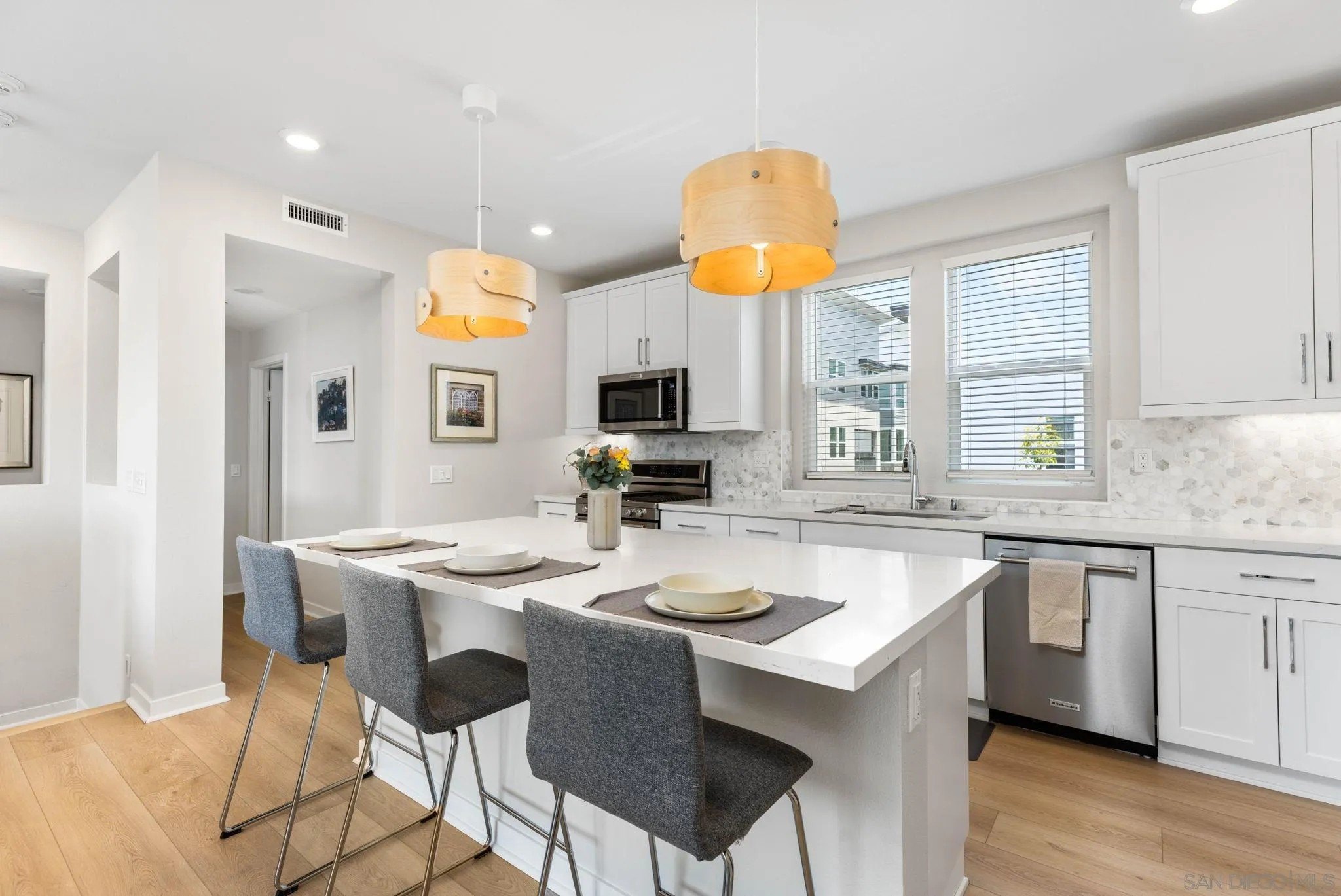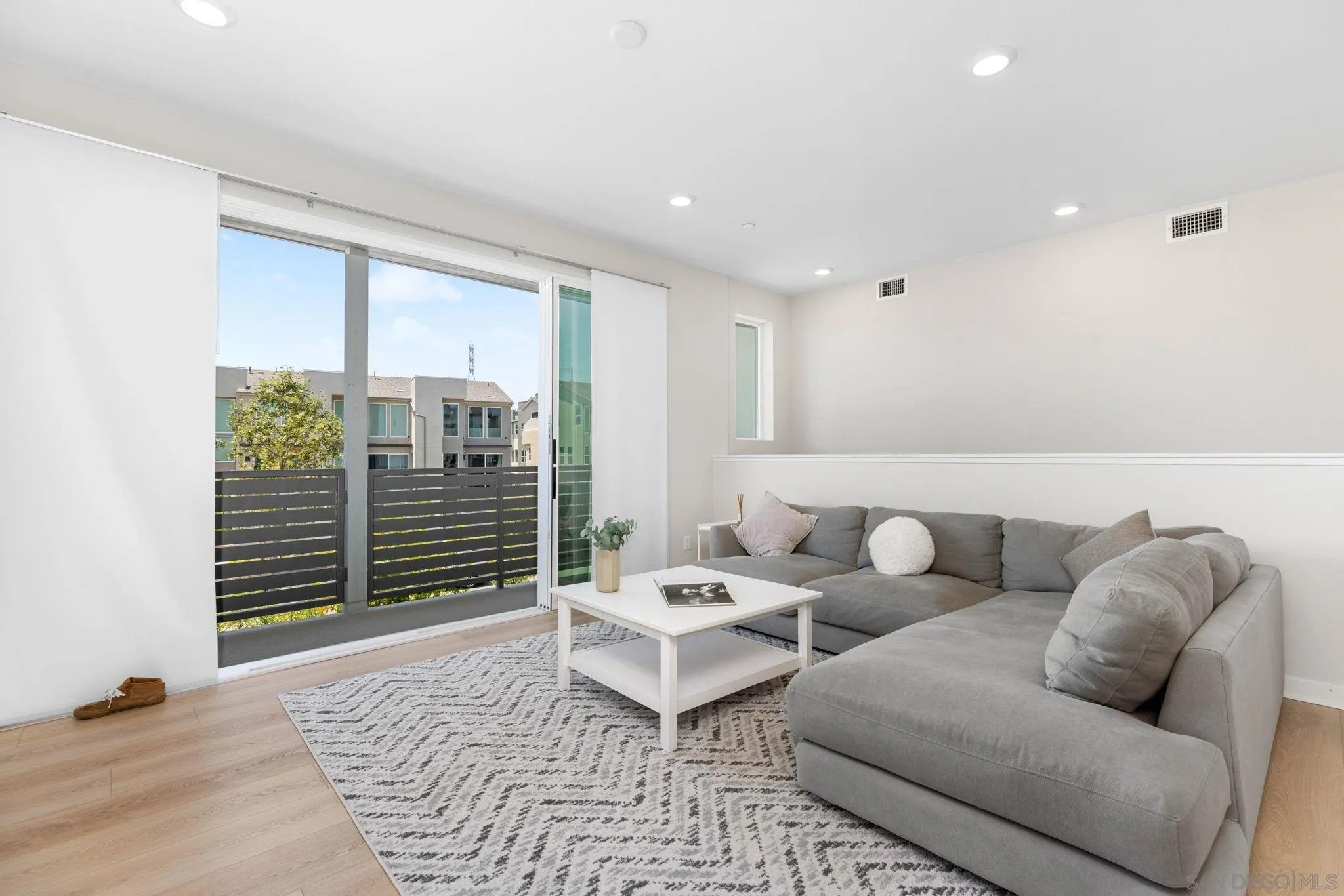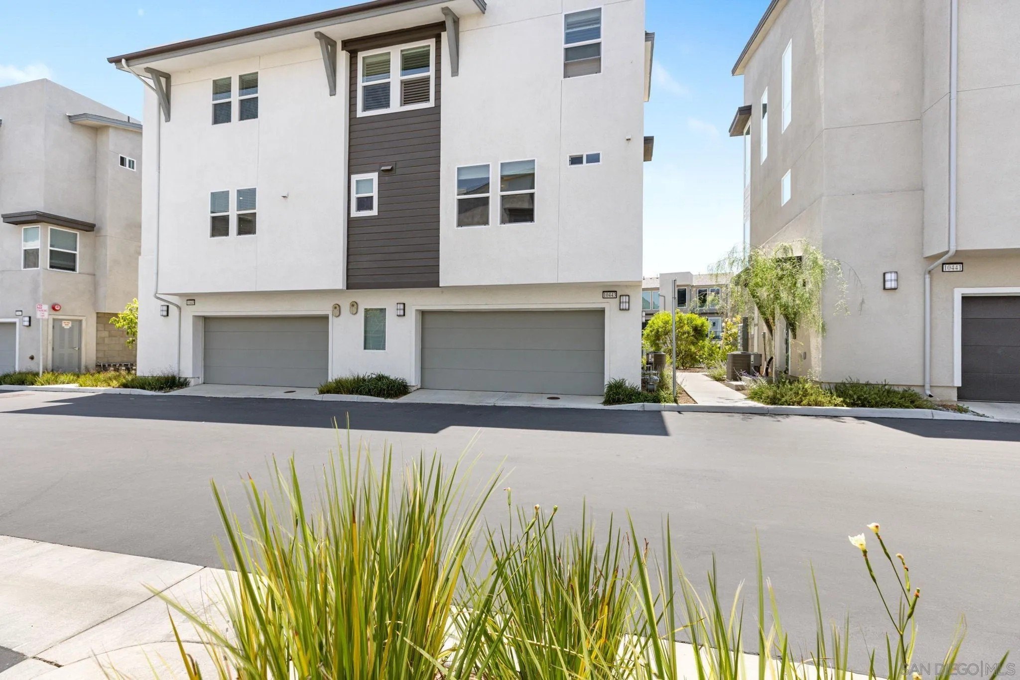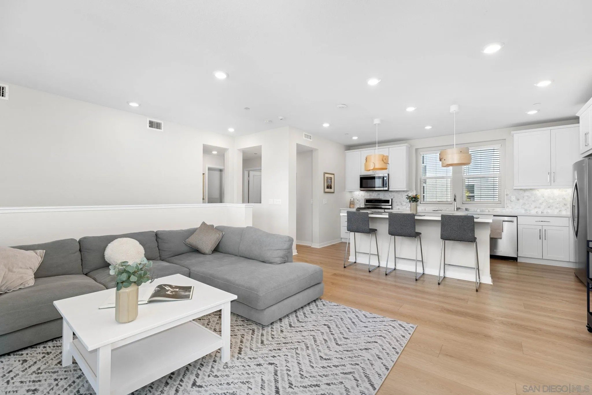 Tucked into one of San Diego’s most thoughtfully designed wellness communities, this beautifully upgraded 2 bed, 2 bath end-unit townhome offers 1,230 sq. ft. of elevated living in the heart of 3Roots, Sorrento Mesa. Completed in 2022, this nearly new home combines sleek, modern finishes with energy-efficient upgrades and a layout designed for both comfort and connection. Step inside and feel the difference. The open-concept layout is bright and airy, anchored by a stunning multi-slide patio door that opens to your private outdoor space—perfect for entertaining or unwinding. From here, enjoy an elevated view of the vibrant, modern 3Roots community, with open sightlines and lush tree-lined streets that highlight the thoughtful design of this one-of-a-kind neighborhood. The gourmet kitchen shines with European quartz countertops, under-cabinet lighting, Whirlpool® stainless steel appliances, and sleek chrome finishes. The primary suite features a generous walk-in closet, upgraded shower hutch, and refined fixtures that elevate everyday routines. Energy efficiency comes standard, with SunPower solar panels, a tankless water heater, and a Wi-Fi-enabled smart thermostat. The spacious two-car garage includes an EV-ready outlet for added convenience.