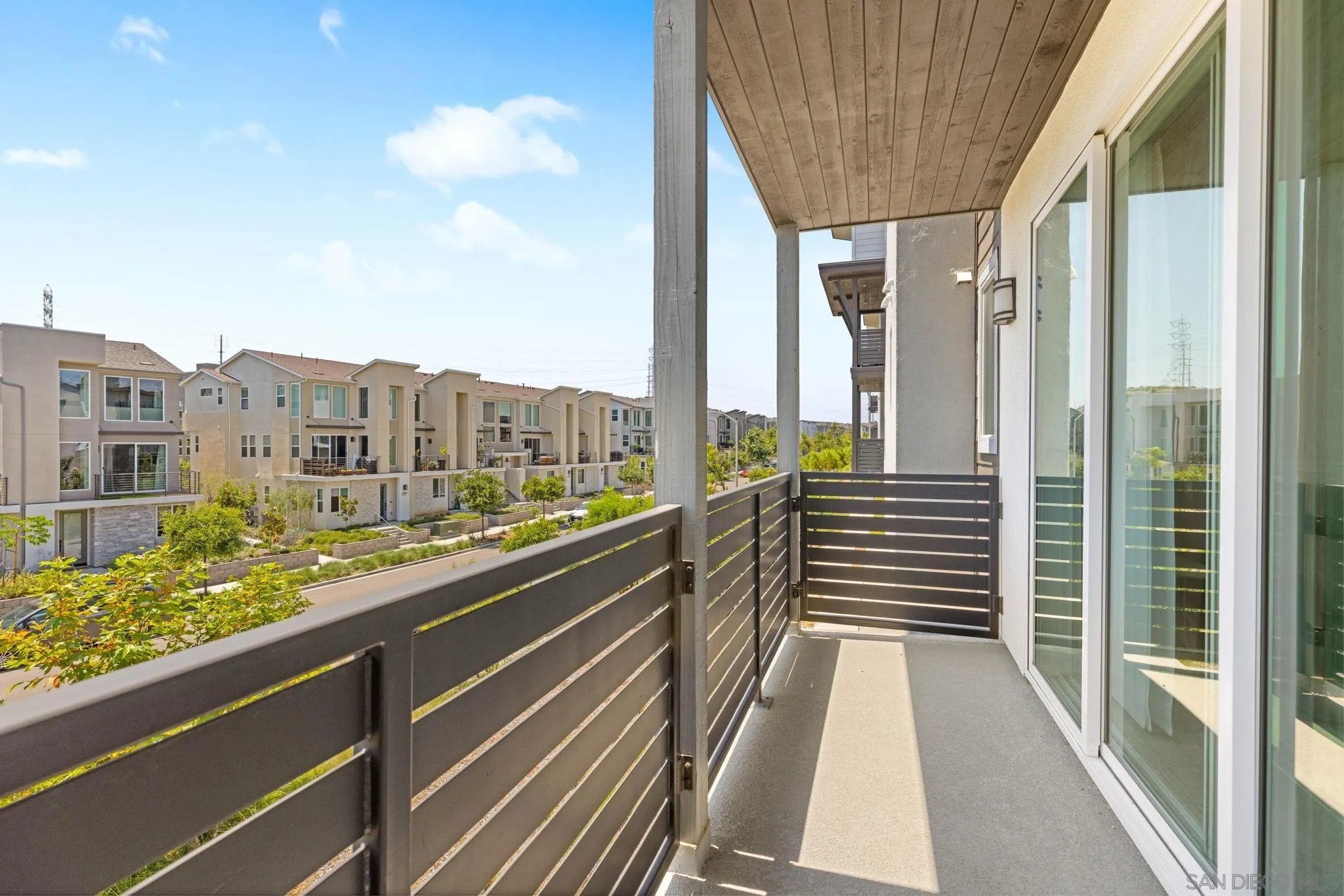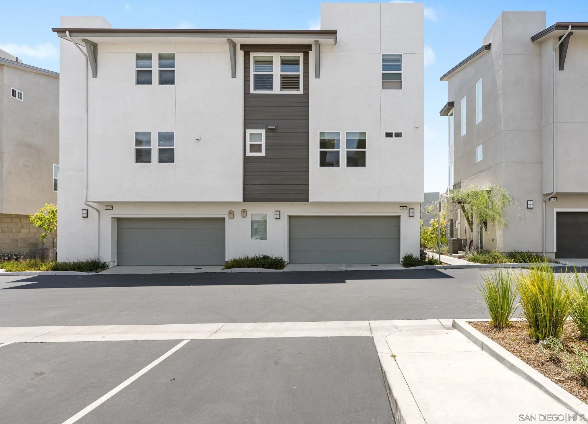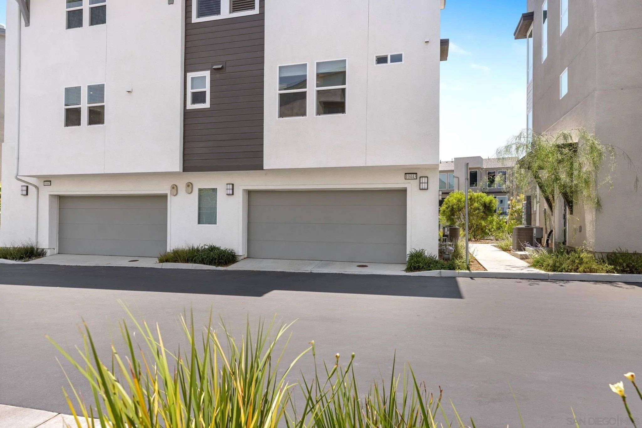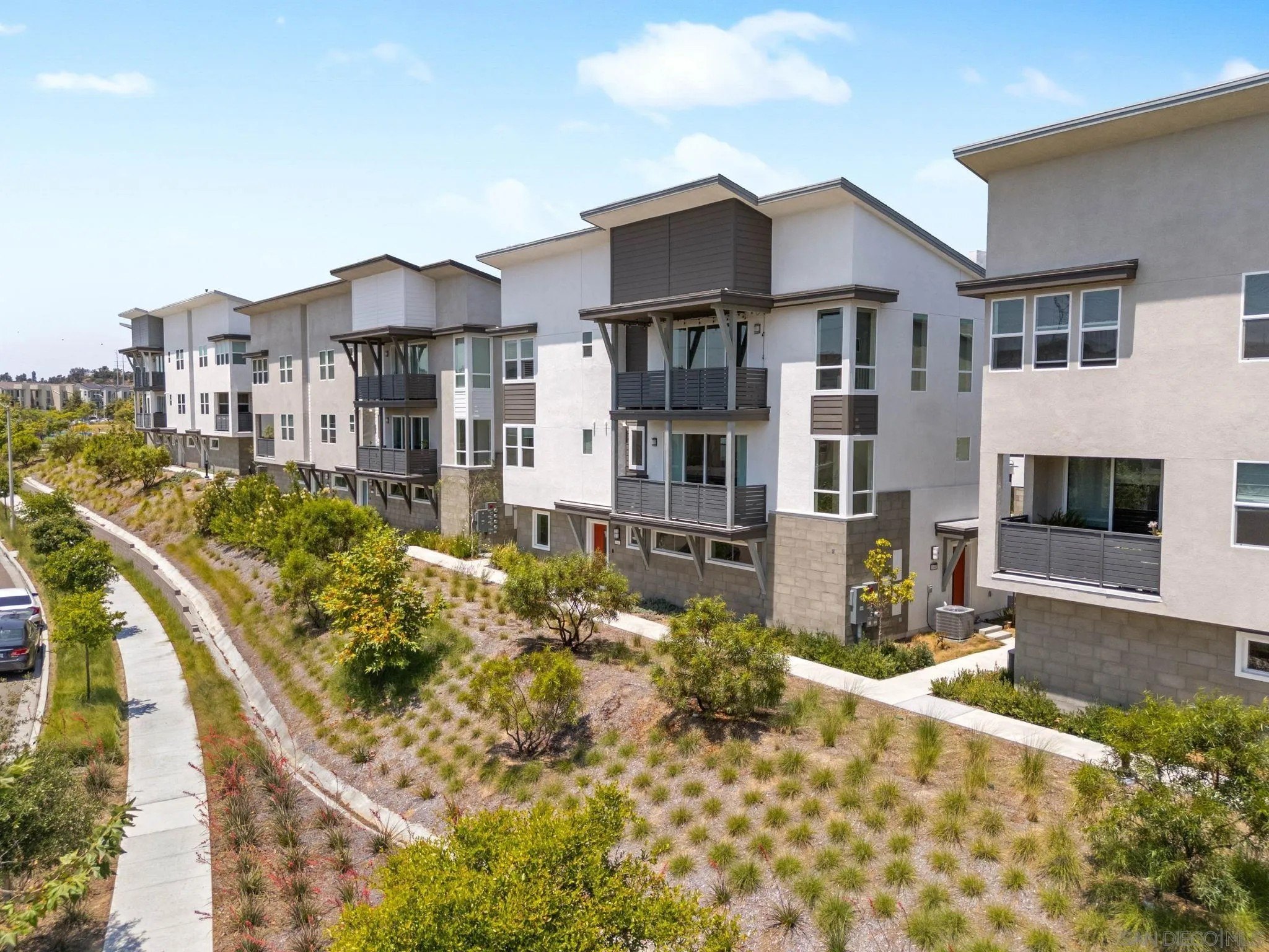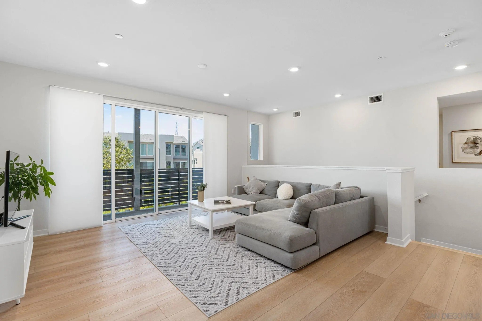 Tucked into one of San Diego’s most thoughtfully designed wellness communities, this beautifully upgraded 2 bed, 2 bath end-unit townhome offers 1,230 sq. ft. of elevated living in the heart of 3Roots, Sorrento Mesa. Completed in 2022, this nearly new home combines sleek, modern finishes with energy-efficient upgrades and a layout designed for both comfort and connection. Step inside and feel the difference. The open-concept layout is bright and airy, anchored by a stunning multi-slide patio door that opens to your private outdoor space—perfect for entertaining or unwinding. From here, enjoy an elevated view of the vibrant, modern 3Roots community, with open sightlines and lush tree-lined streets that highlight the thoughtful design of this one-of-a-kind neighborhood. The gourmet kitchen shines with European quartz countertops, under-cabinet lighting, Whirlpool® stainless steel appliances, and sleek chrome finishes. The primary suite features a generous walk-in closet, upgraded shower hutch, and refined fixtures that elevate everyday routines. Energy efficiency comes standard, with SunPower solar panels, a tankless water heater, and a Wi-Fi-enabled smart thermostat. The spacious two-car garage includes an EV-ready outlet for added convenience.