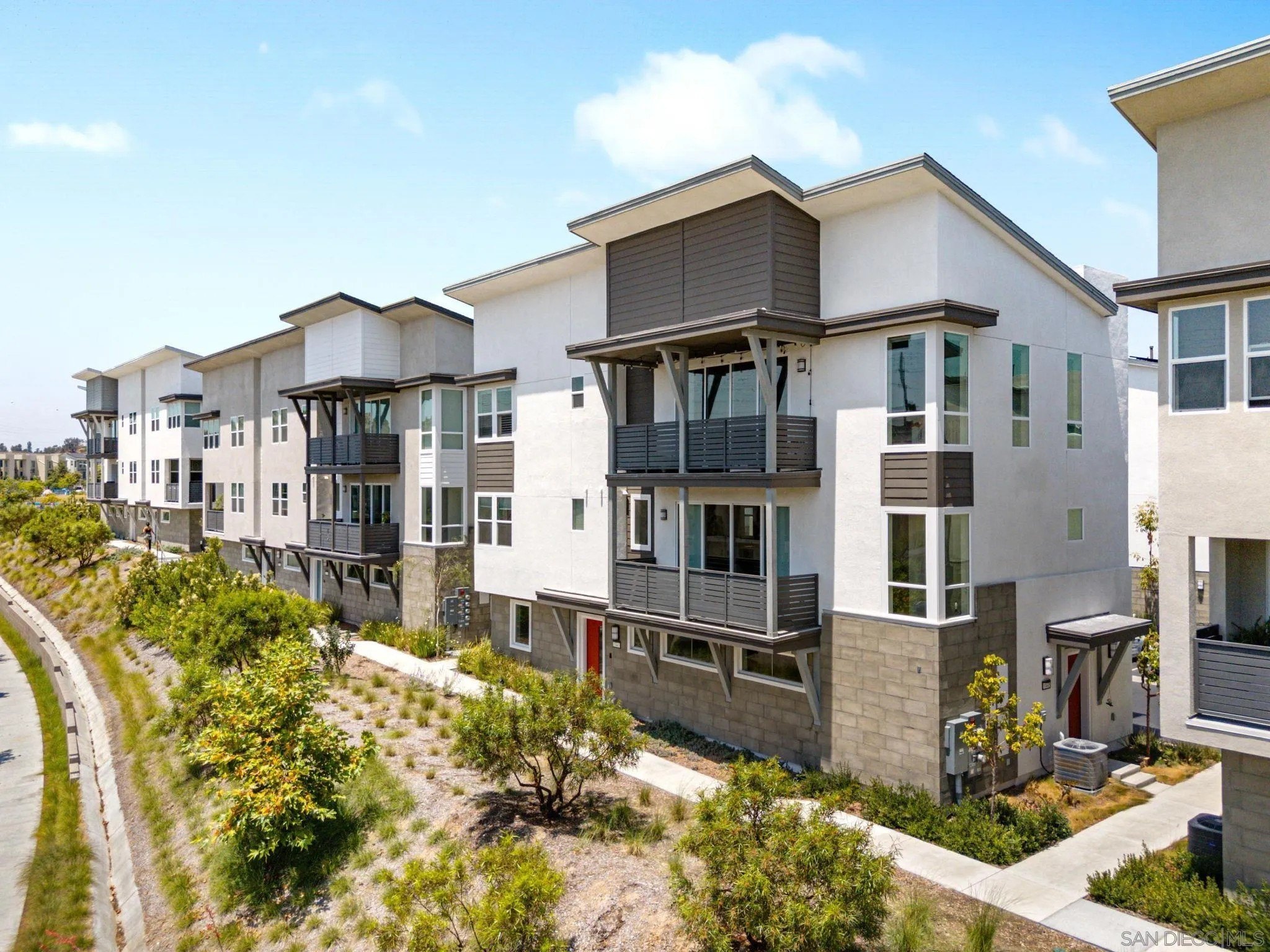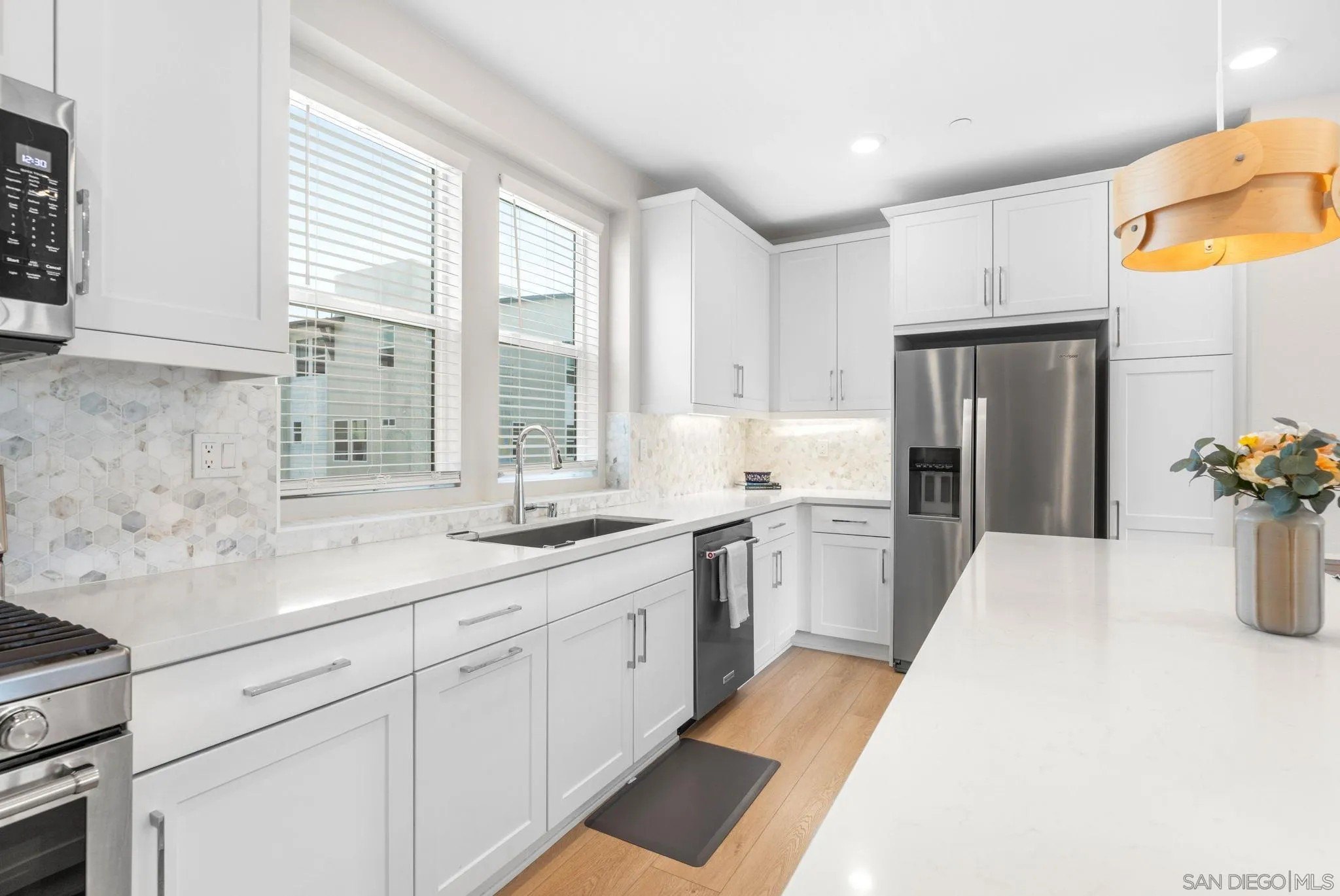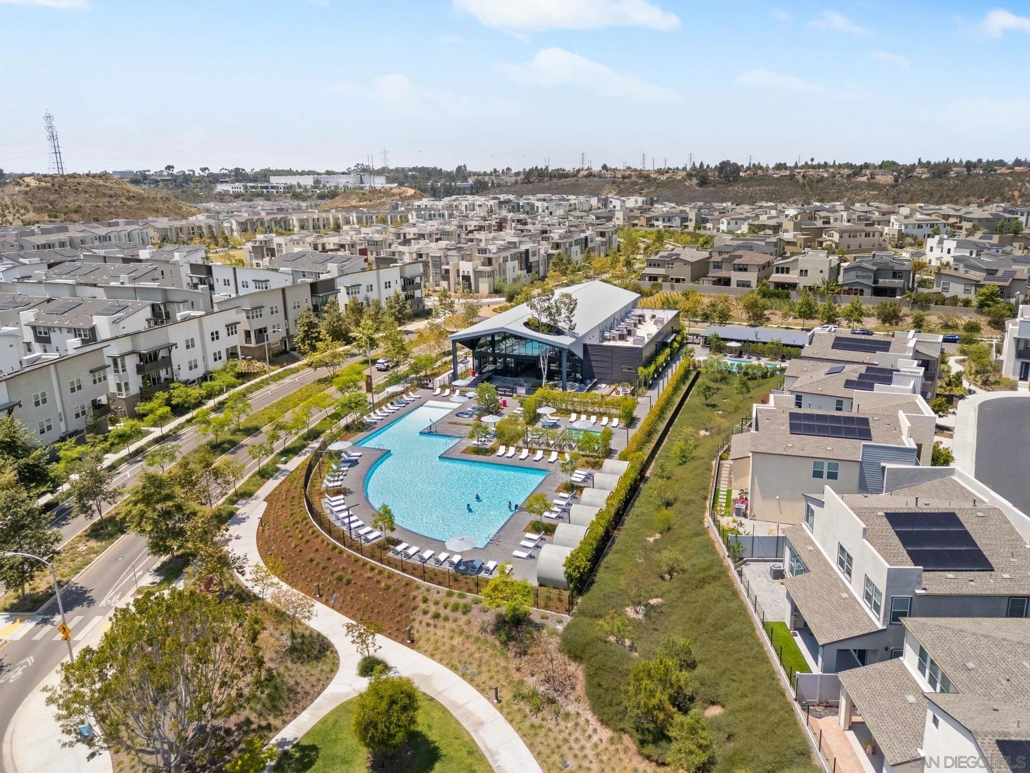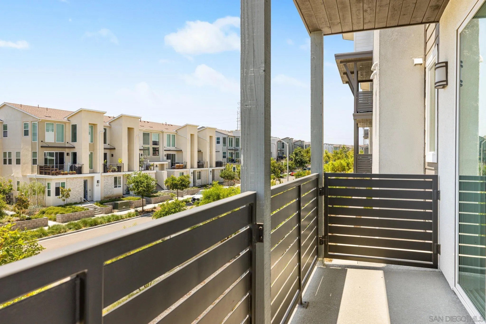 Tucked into one of San Diego’s most thoughtfully designed wellness communities, this beautifully upgraded 2 bed, 2 bath end-unit townhome offers 1,230 sq. ft. of elevated living in the heart of 3Roots, Sorrento Mesa. Completed in 2022, this nearly new home combines sleek, modern finishes with energy-efficient upgrades and a layout designed for both comfort and connection. Step inside and feel the difference. The open-concept layout is bright and airy, anchored by a stunning multi-slide patio door that opens to your private outdoor space—perfect for entertaining or unwinding. From here, enjoy an elevated view of the vibrant, modern 3Roots community, with open sightlines and lush tree-lined streets that highlight the thoughtful design of this one-of-a-kind neighborhood. The gourmet kitchen shines with European quartz countertops, under-cabinet lighting, Whirlpool® stainless steel appliances, and sleek chrome finishes. The primary suite features a generous walk-in closet, upgraded shower hutch, and refined fixtures that elevate everyday routines. Energy efficiency comes standard, with SunPower solar panels, a tankless water heater, and a Wi-Fi-enabled smart thermostat. The spacious two-car garage includes an EV-ready outlet for added convenience.