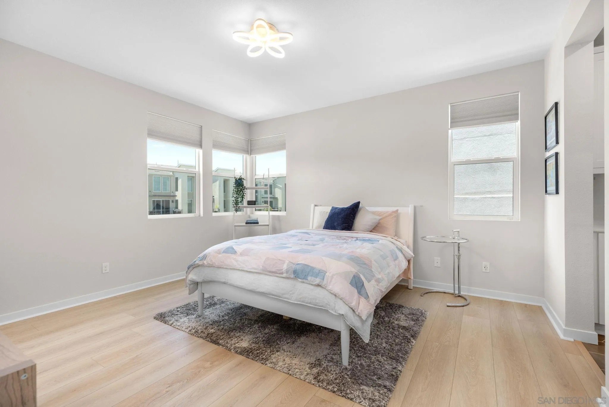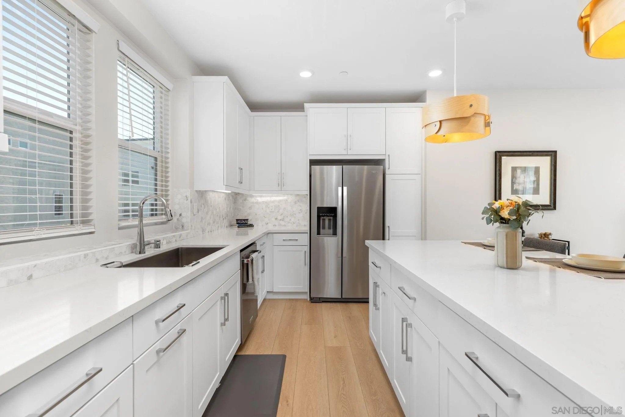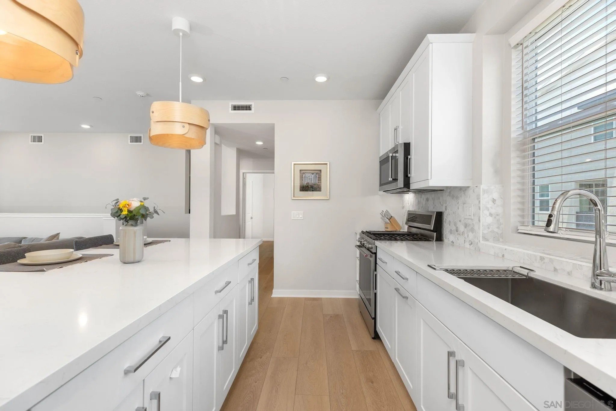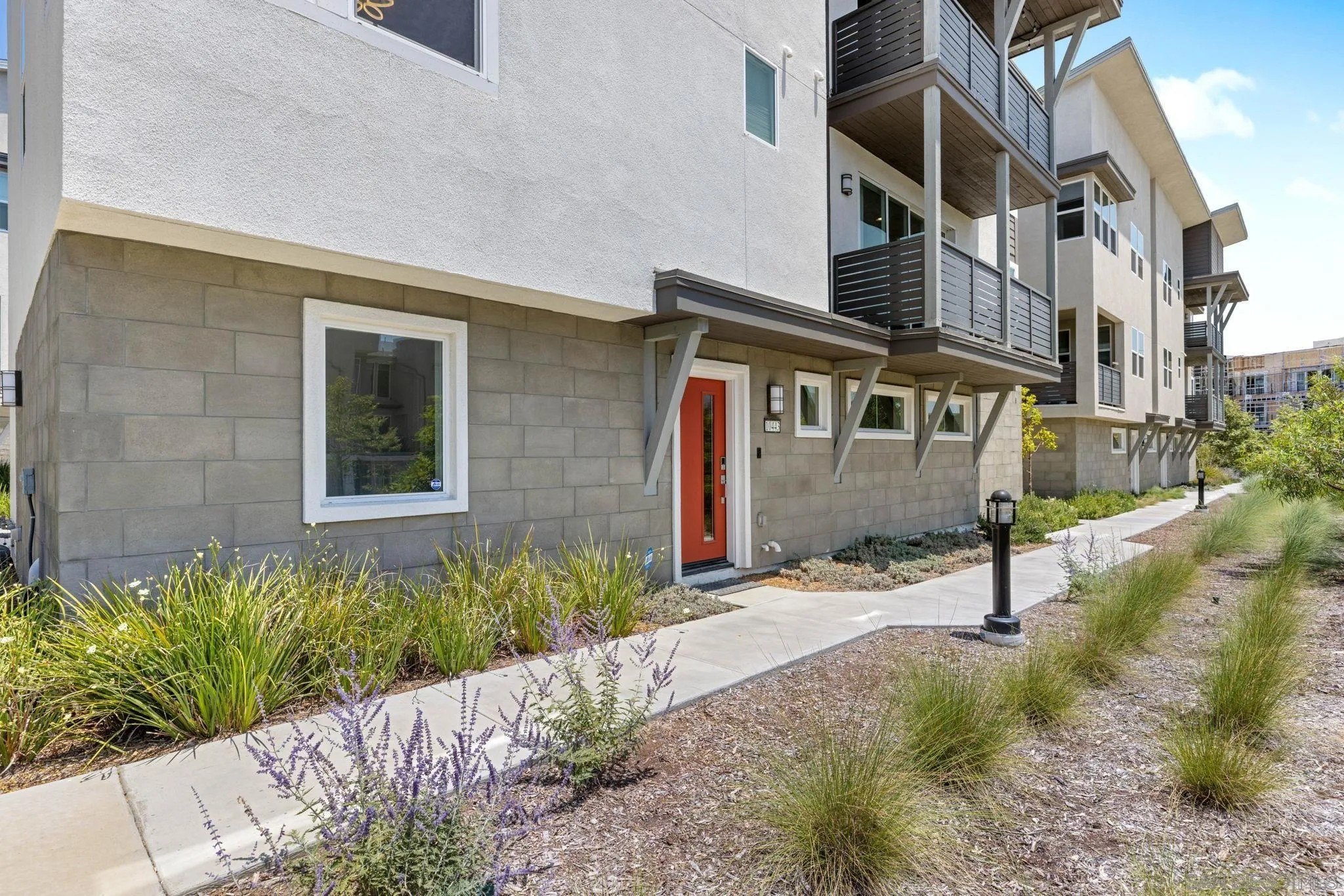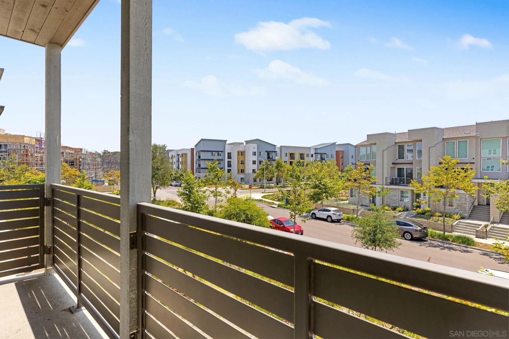 Tucked into one of San Diego’s most thoughtfully designed wellness communities, this beautifully upgraded 2 bed, 2 bath end-unit townhome offers 1,230 sq. ft. of elevated living in the heart of 3Roots, Sorrento Mesa. Completed in 2022, this nearly new home combines sleek, modern finishes with energy-efficient upgrades and a layout designed for both comfort and connection. Step inside and feel the difference. The open-concept layout is bright and airy, anchored by a stunning multi-slide patio door that opens to your private outdoor space—perfect for entertaining or unwinding. From here, enjoy an elevated view of the vibrant, modern 3Roots community, with open sightlines and lush tree-lined streets that highlight the thoughtful design of this one-of-a-kind neighborhood. The gourmet kitchen shines with European quartz countertops, under-cabinet lighting, Whirlpool® stainless steel appliances, and sleek chrome finishes. The primary suite features a generous walk-in closet, upgraded shower hutch, and refined fixtures that elevate everyday routines. Energy efficiency comes standard, with SunPower solar panels, a tankless water heater, and a Wi-Fi-enabled smart thermostat. The spacious two-car garage includes an EV-ready outlet for added convenience.