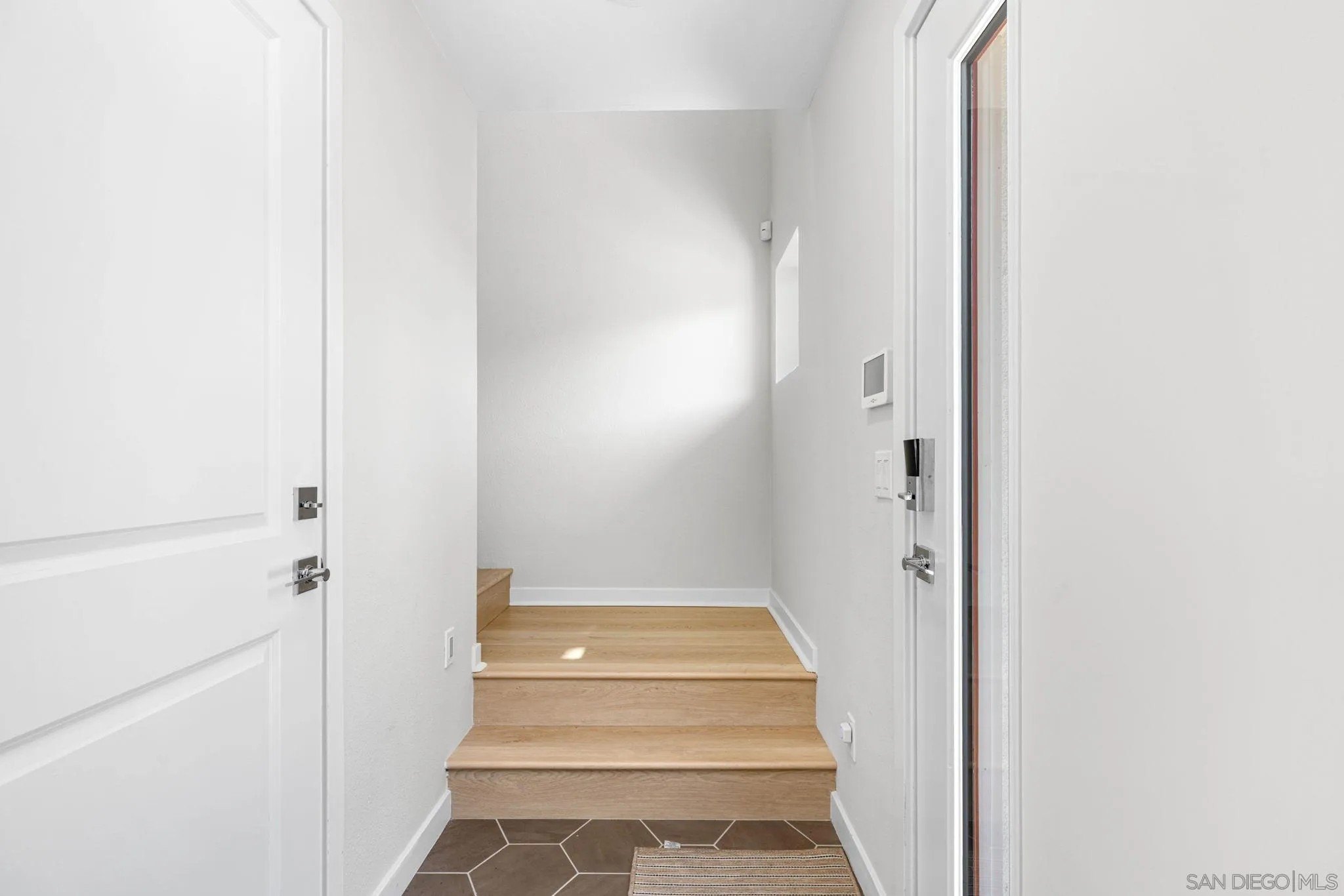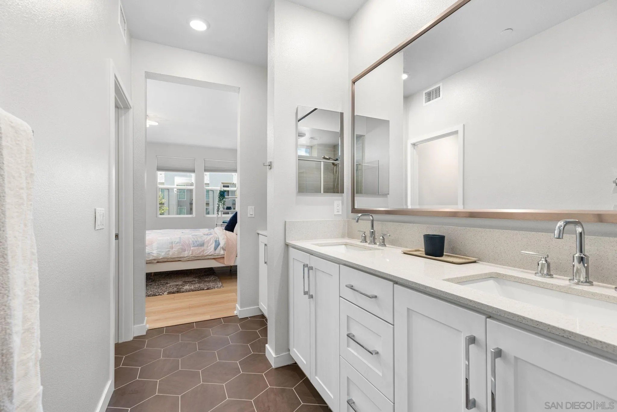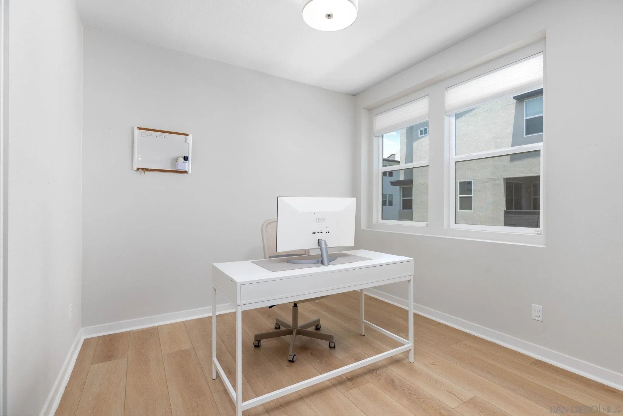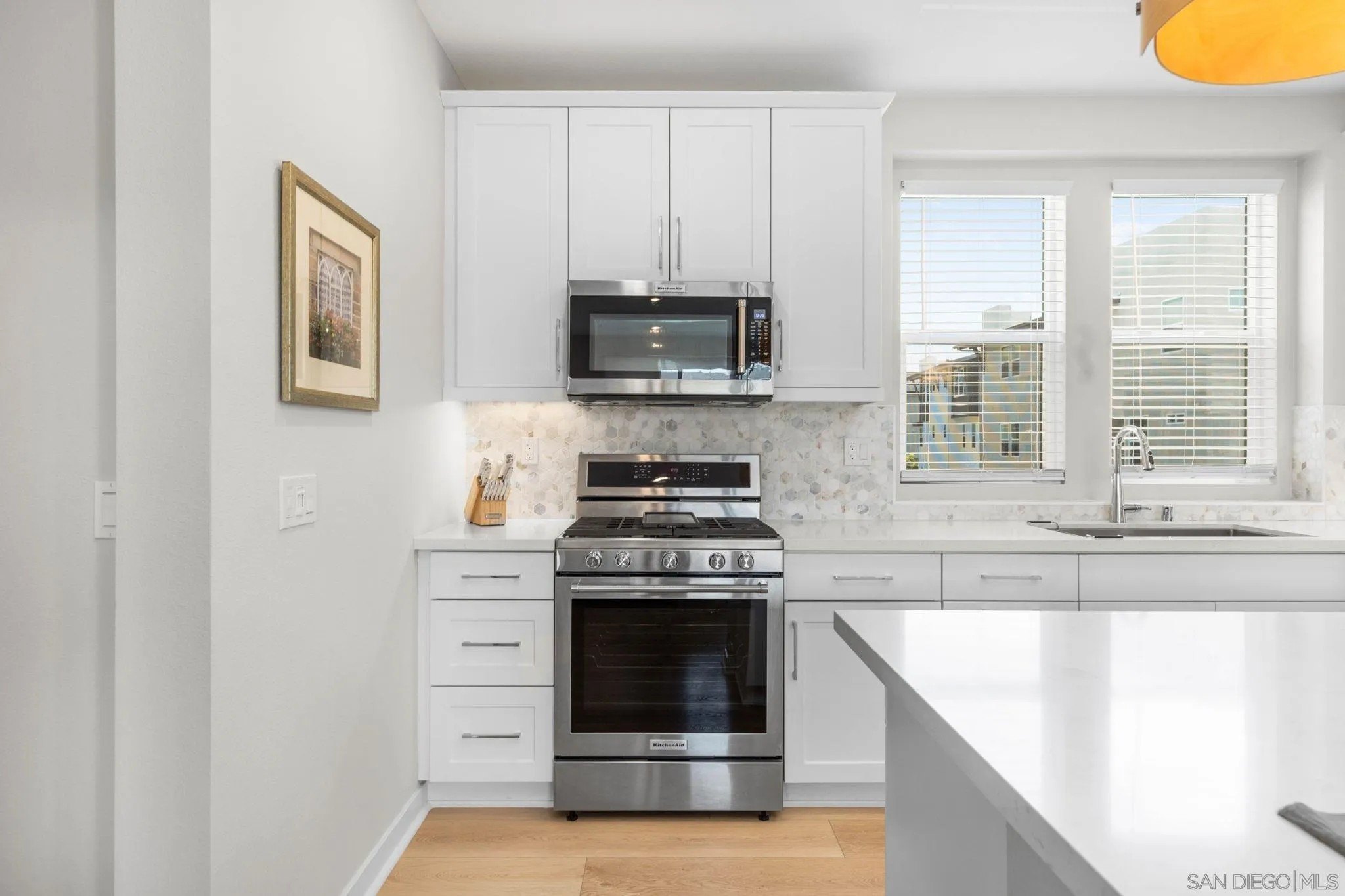 Tucked into one of San Diego’s most thoughtfully designed wellness communities, this beautifully upgraded 2 bed, 2 bath end-unit townhome offers 1,230 sq. ft. of elevated living in the heart of 3Roots, Sorrento Mesa. Completed in 2022, this nearly new home combines sleek, modern finishes with energy-efficient upgrades and a layout designed for both comfort and connection. Step inside and feel the difference. The open-concept layout is bright and airy, anchored by a stunning multi-slide patio door that opens to your private outdoor space—perfect for entertaining or unwinding. From here, enjoy an elevated view of the vibrant, modern 3Roots community, with open sightlines and lush tree-lined streets that highlight the thoughtful design of this one-of-a-kind neighborhood. The gourmet kitchen shines with European quartz countertops, under-cabinet lighting, Whirlpool® stainless steel appliances, and sleek chrome finishes. The primary suite features a generous walk-in closet, upgraded shower hutch, and refined fixtures that elevate everyday routines. Energy efficiency comes standard, with SunPower solar panels, a tankless water heater, and a Wi-Fi-enabled smart thermostat. The spacious two-car garage includes an EV-ready outlet for added convenience.