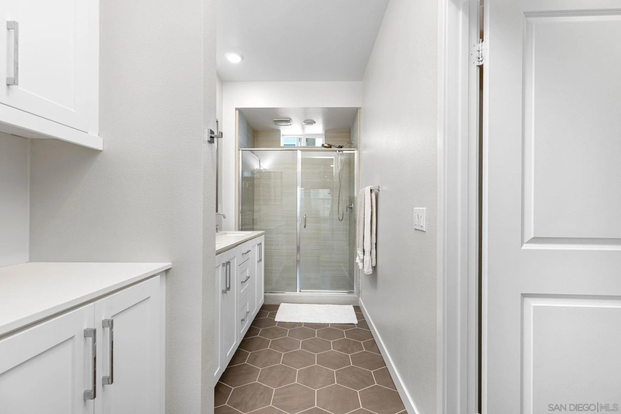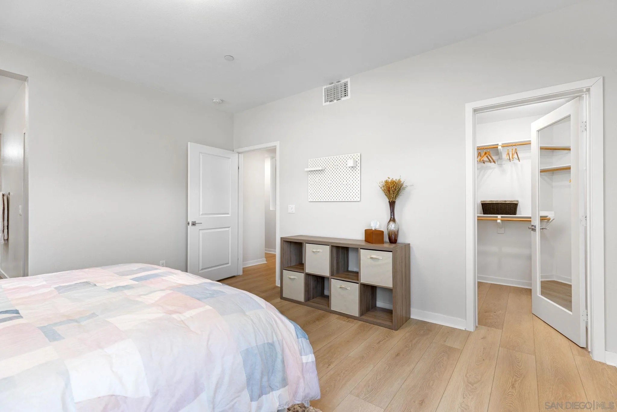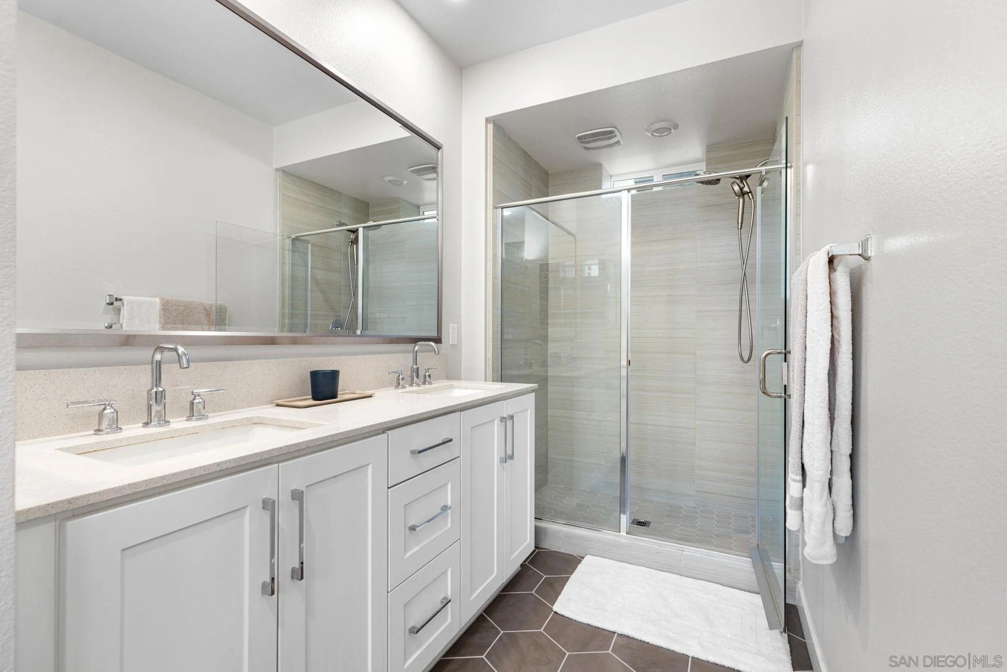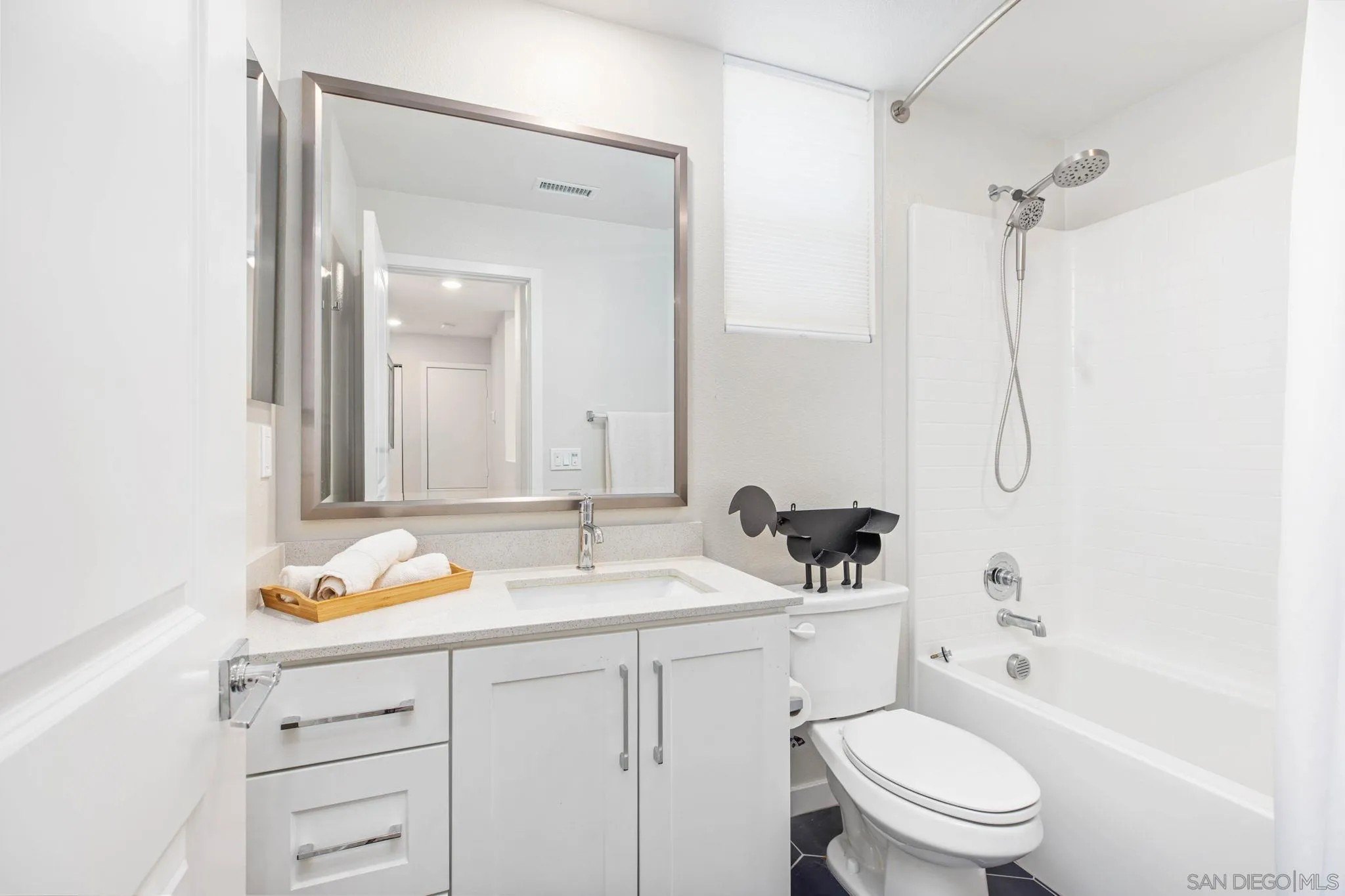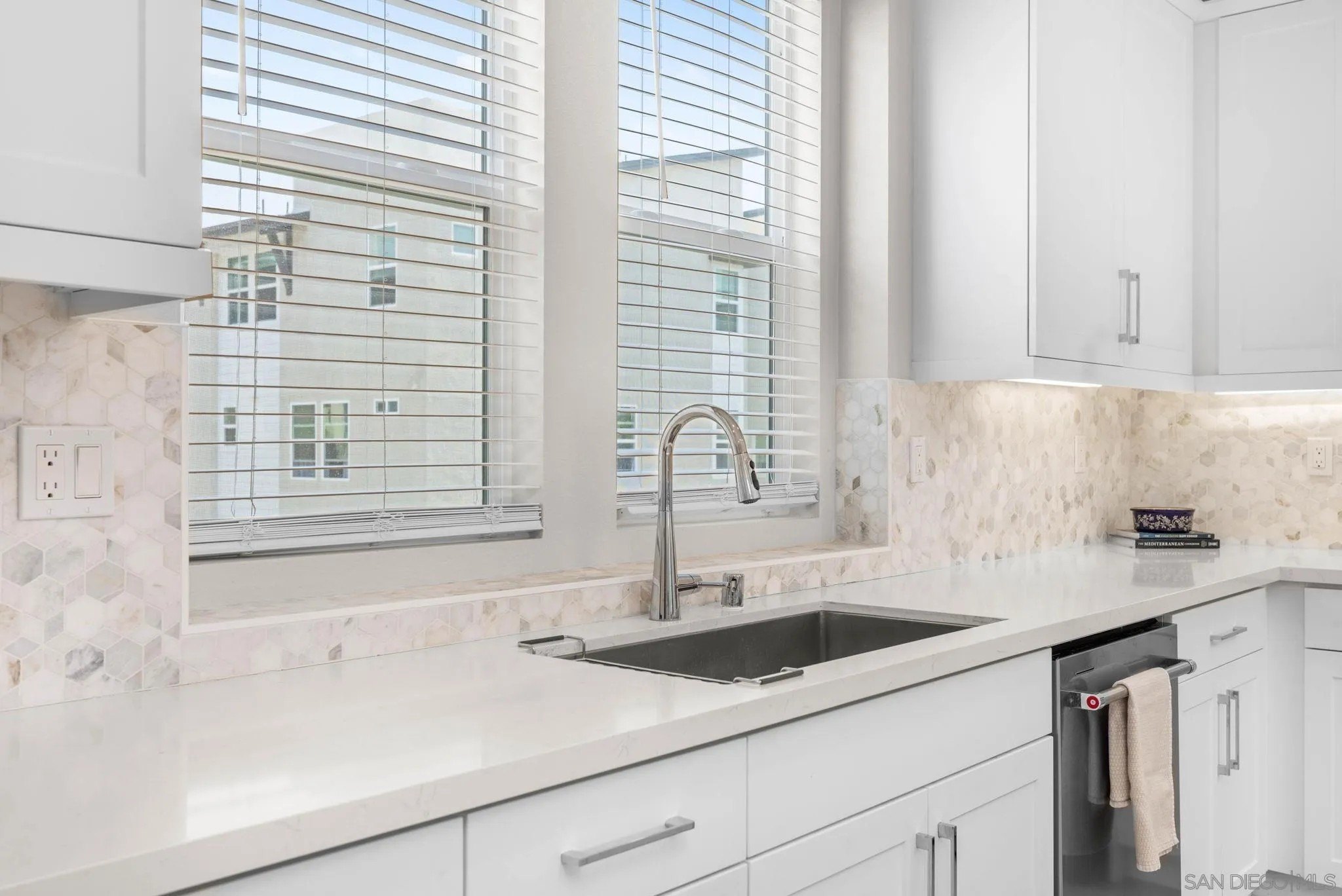 Tucked into one of San Diego’s most thoughtfully designed wellness communities, this beautifully upgraded 2 bed, 2 bath end-unit townhome offers 1,230 sq. ft. of elevated living in the heart of 3Roots, Sorrento Mesa. Completed in 2022, this nearly new home combines sleek, modern finishes with energy-efficient upgrades and a layout designed for both comfort and connection. Step inside and feel the difference. The open-concept layout is bright and airy, anchored by a stunning multi-slide patio door that opens to your private outdoor space—perfect for entertaining or unwinding. From here, enjoy an elevated view of the vibrant, modern 3Roots community, with open sightlines and lush tree-lined streets that highlight the thoughtful design of this one-of-a-kind neighborhood. The gourmet kitchen shines with European quartz countertops, under-cabinet lighting, Whirlpool® stainless steel appliances, and sleek chrome finishes. The primary suite features a generous walk-in closet, upgraded shower hutch, and refined fixtures that elevate everyday routines. Energy efficiency comes standard, with SunPower solar panels, a tankless water heater, and a Wi-Fi-enabled smart thermostat. The spacious two-car garage includes an EV-ready outlet for added convenience.