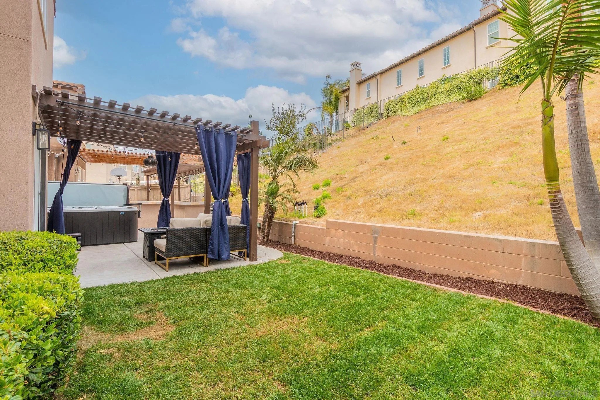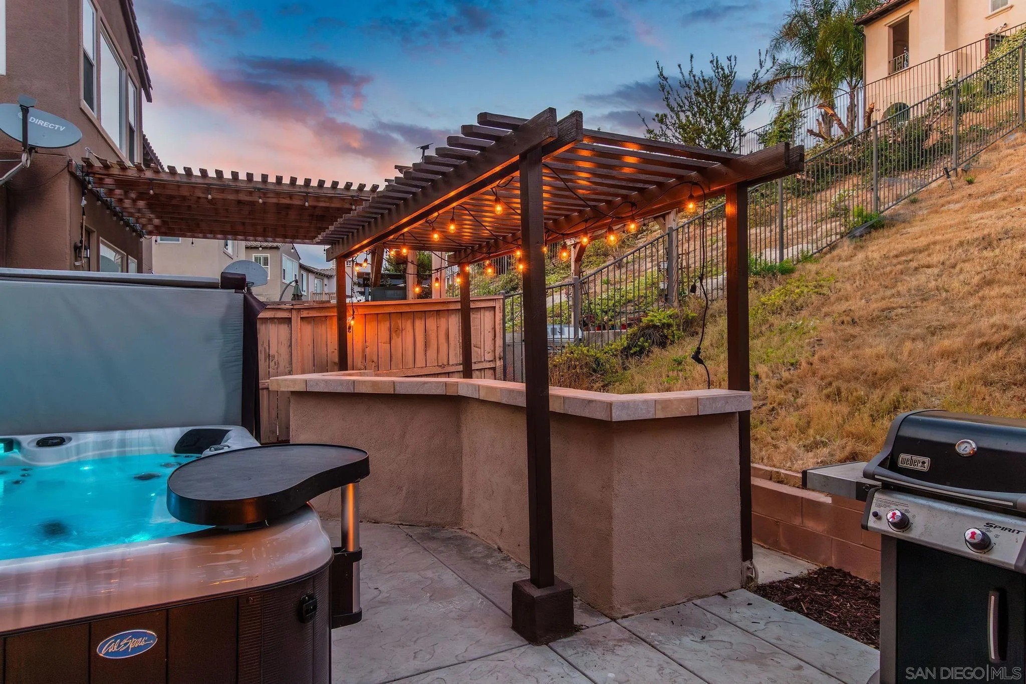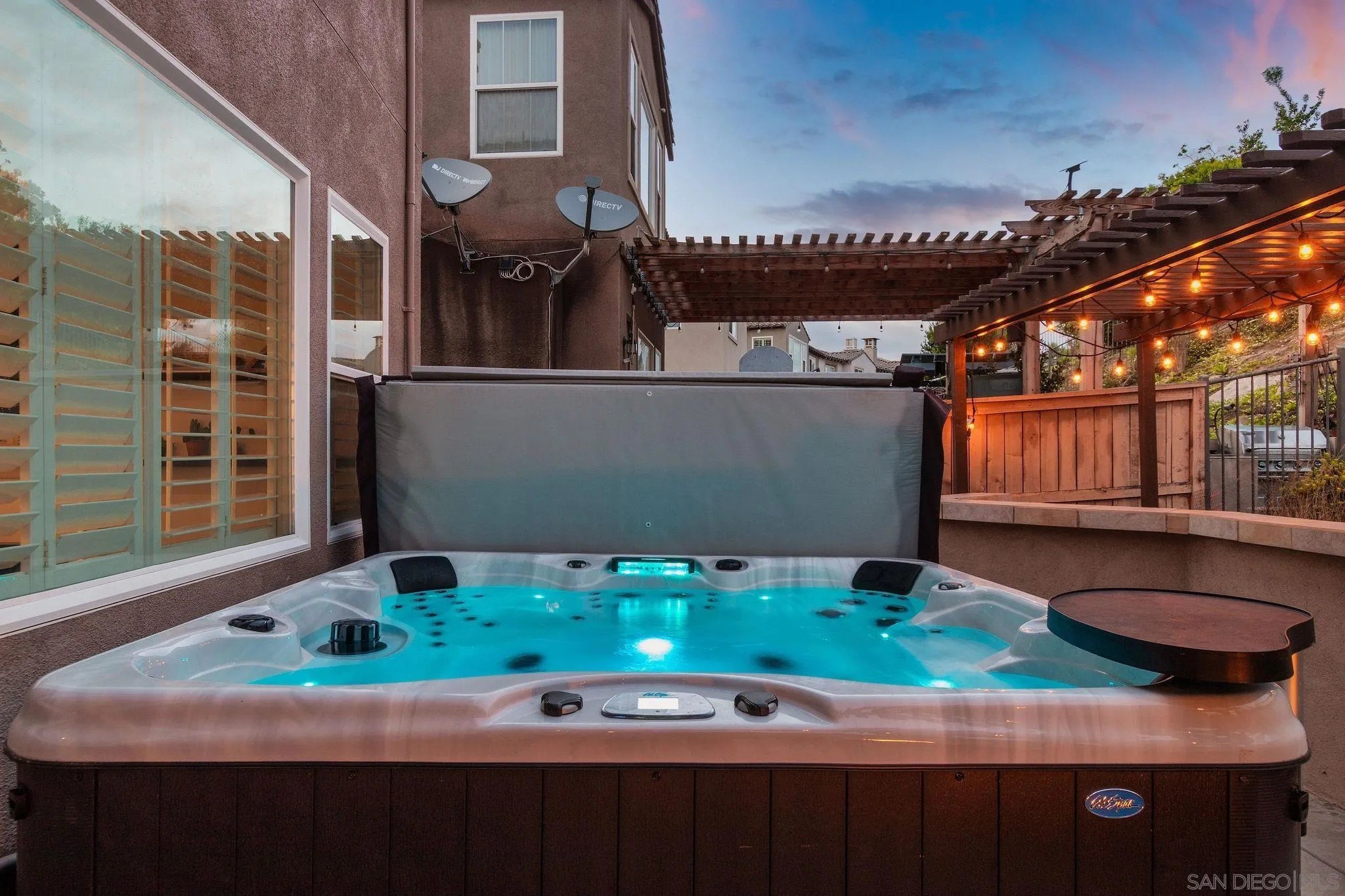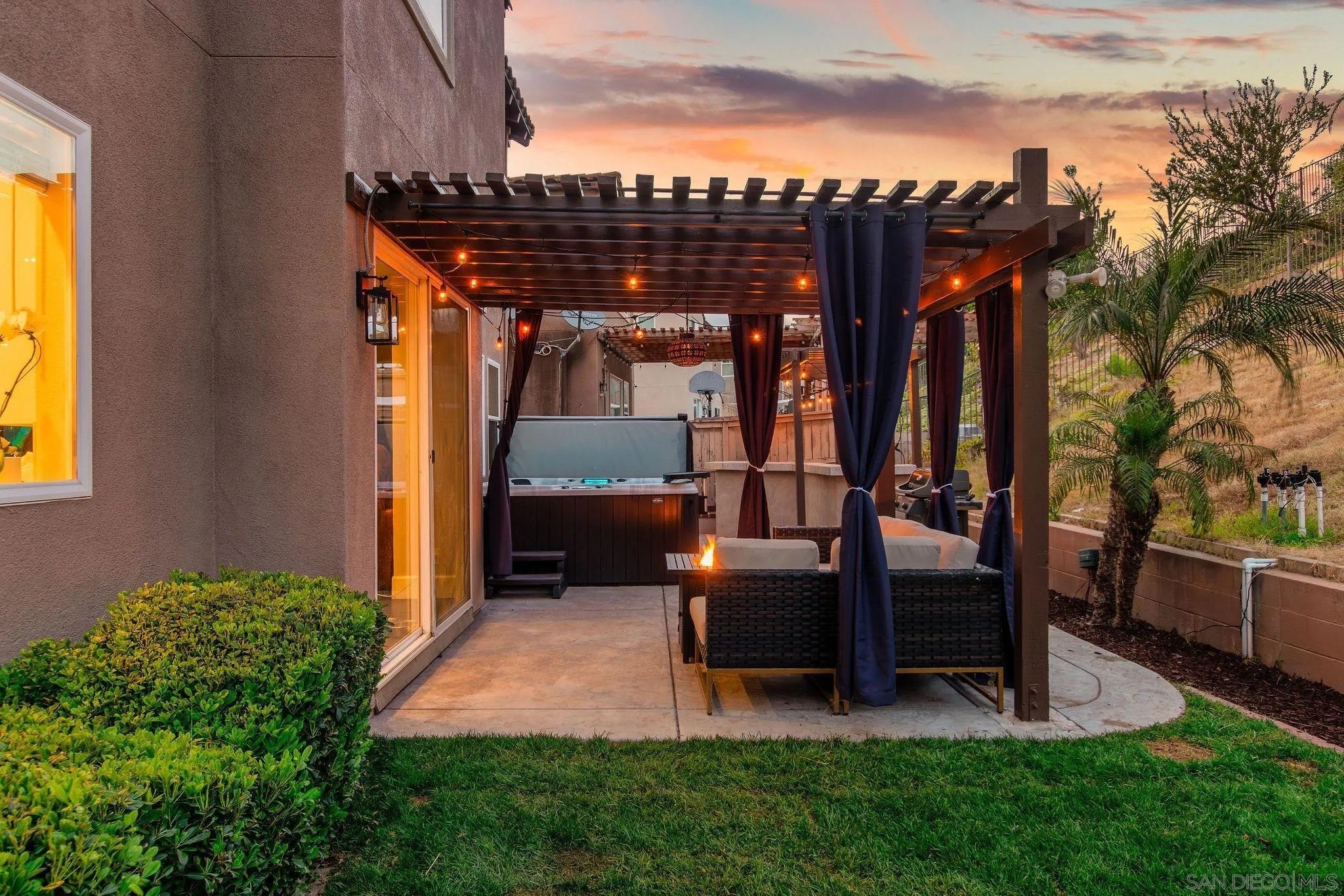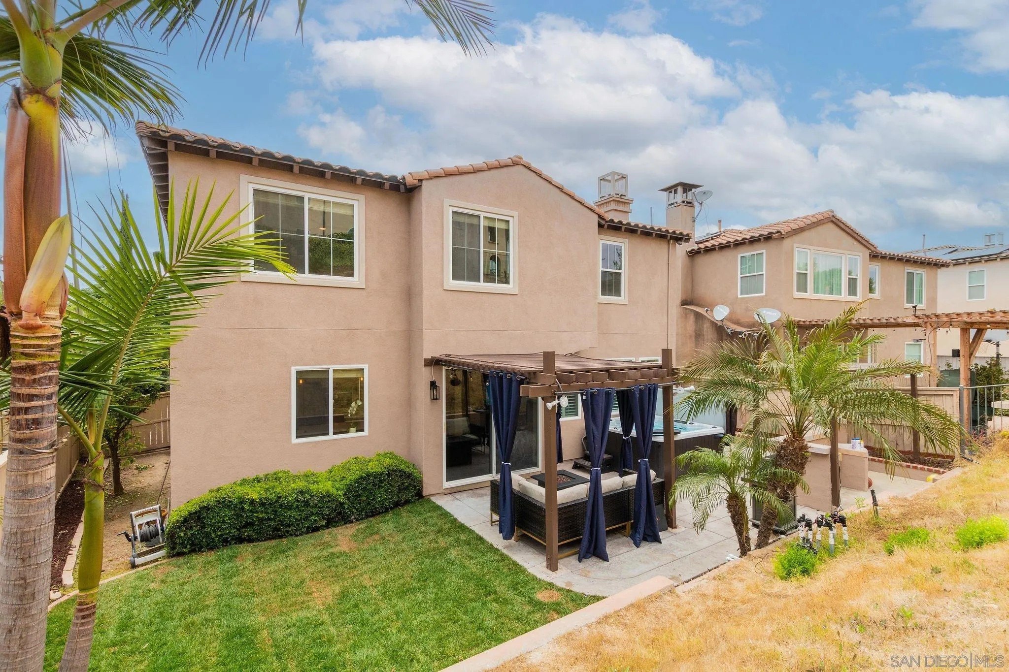 Live Your Best Life in Eastlake Vistas! This exquisite residence perfectly blends modern comfort with the relaxed, outdoor lifestyle San Diego is famous for. Enter through the gated courtyard and feel instantly welcomed—imagine sipping your favorite drink on the flagstone patio as the sun sets. Inside, you’re greeted by soaring two-story ceilings in the spacious formal living room, where dual French doors open wide for seamless indoor-outdoor living. A bedroom and full bathroom on the main level offer convenience and flexibility, while architectural details and shuttered windows allow soft, natural light to fill each room. The formal dining room sets the stage for elegant dinners and memorable gatherings. At the heart of the home, the kitchen connects formal and casual living spaces, designed for both style and function. It features crisp white cabinetry, quartz countertops, a decorative tile backsplash, a walk-in pantry, 5-burner gas cooktop, double ovens, and a large center island with pendant lighting and bar seating. Upstairs, a spacious loft offers easy potential for a 5th bedroom. You'll also find a convenient laundry room, two generously sized bedrooms, a full hallway bath, and a serene primary suite. Your personal retreat includes a flexible bonus space—perfect for a Peloton, home office, or reading nook—and a luxurious en suite bath with a walk-in closet, deep soaking tub, frameless glass shower, dual sinks, and seated vanity. The backyard is a private oasis with a pergola-covered patio, soothing hot tub, outdoor bar with seating, and lush grass for play or pets.