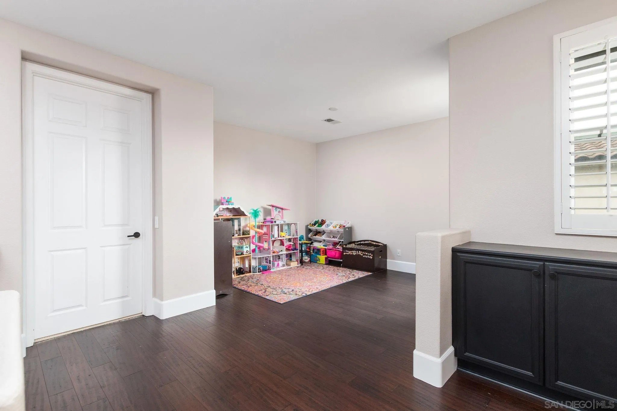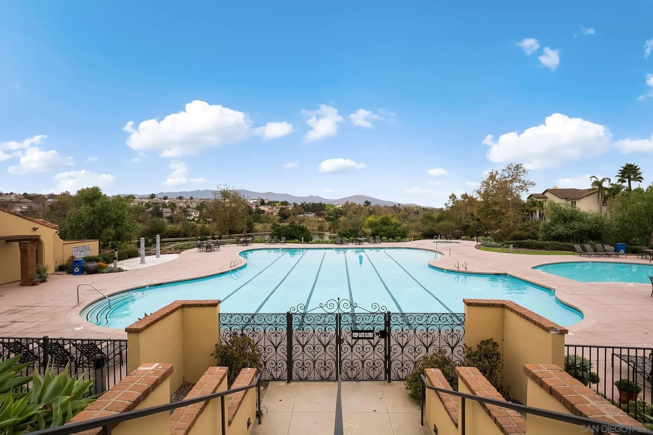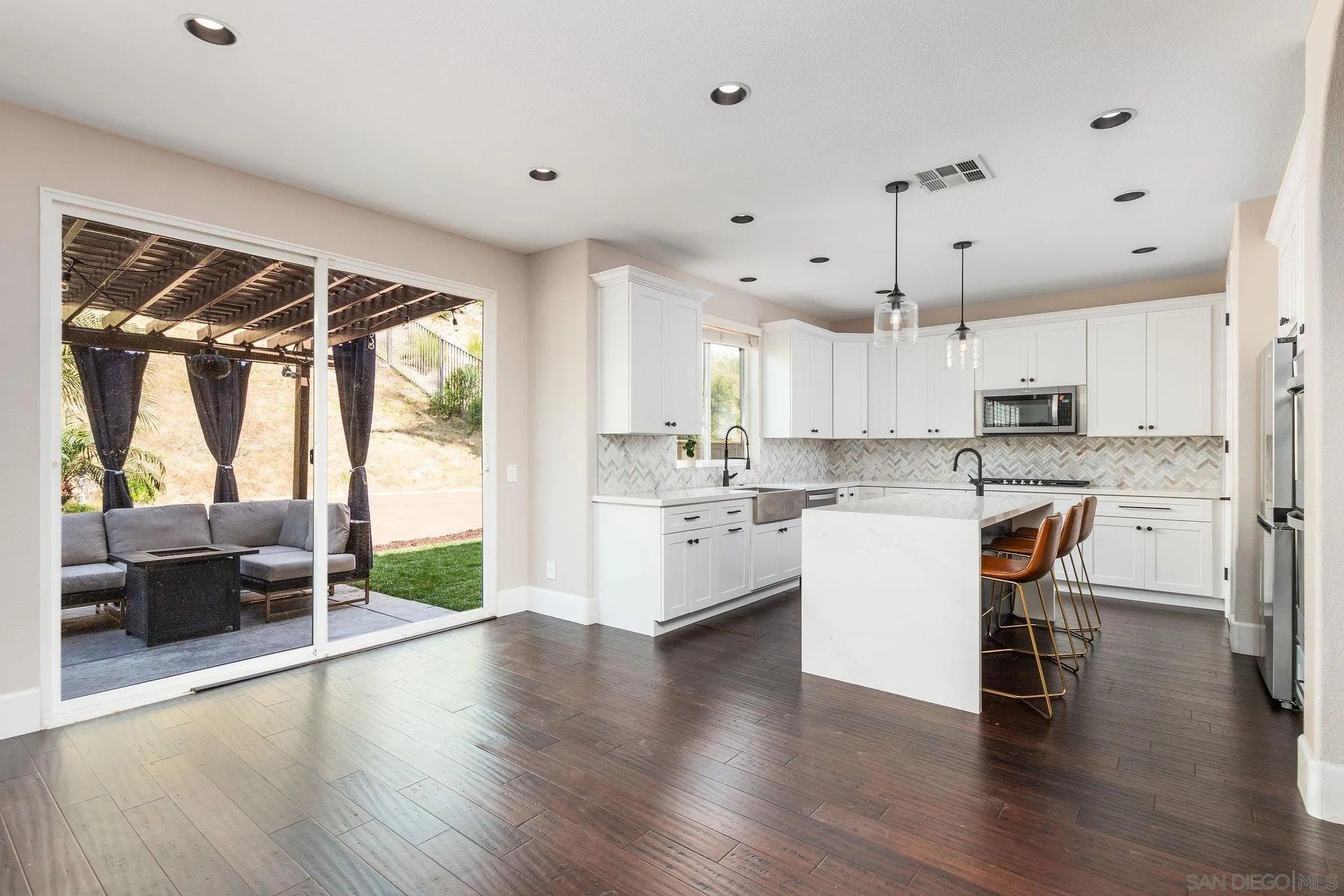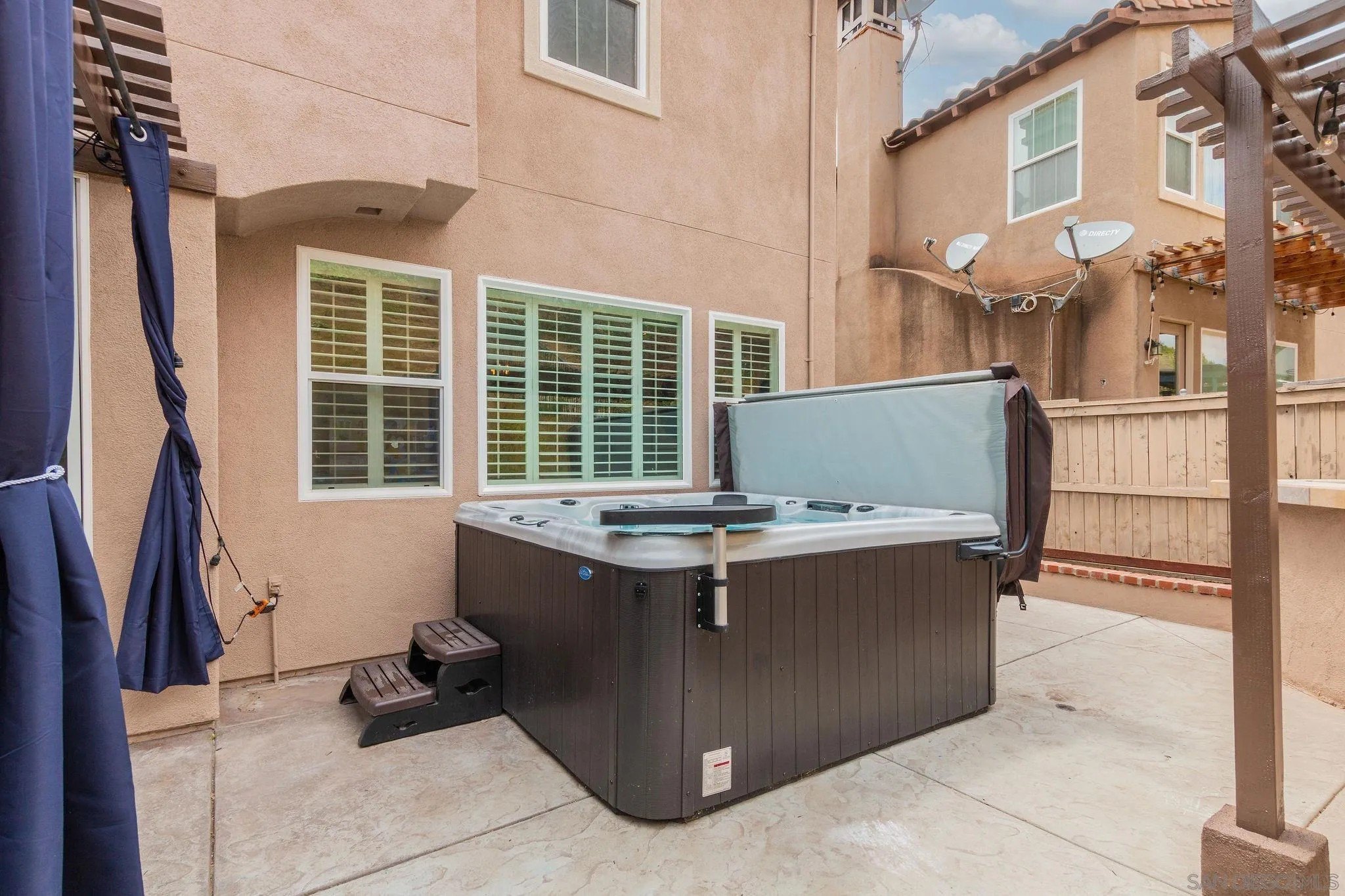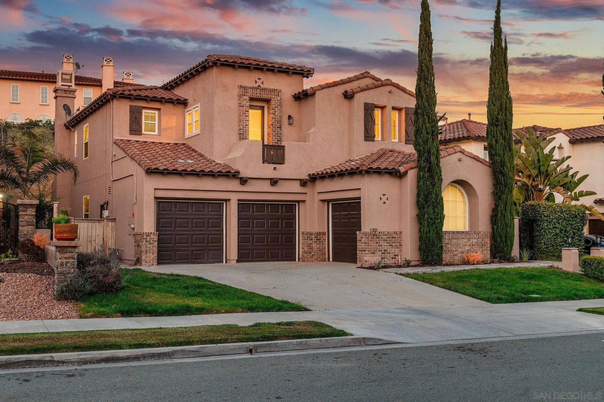 Live Your Best Life in Eastlake Vistas! This exquisite residence perfectly blends modern comfort with the relaxed, outdoor lifestyle San Diego is famous for. Enter through the gated courtyard and feel instantly welcomed—imagine sipping your favorite drink on the flagstone patio as the sun sets. Inside, you’re greeted by soaring two-story ceilings in the spacious formal living room, where dual French doors open wide for seamless indoor-outdoor living. A bedroom and full bathroom on the main level offer convenience and flexibility, while architectural details and shuttered windows allow soft, natural light to fill each room. The formal dining room sets the stage for elegant dinners and memorable gatherings. At the heart of the home, the kitchen connects formal and casual living spaces, designed for both style and function. It features crisp white cabinetry, quartz countertops, a decorative tile backsplash, a walk-in pantry, 5-burner gas cooktop, double ovens, and a large center island with pendant lighting and bar seating. Upstairs, a spacious loft offers easy potential for a 5th bedroom. You'll also find a convenient laundry room, two generously sized bedrooms, a full hallway bath, and a serene primary suite. Your personal retreat includes a flexible bonus space—perfect for a Peloton, home office, or reading nook—and a luxurious en suite bath with a walk-in closet, deep soaking tub, frameless glass shower, dual sinks, and seated vanity. The backyard is a private oasis with a pergola-covered patio, soothing hot tub, outdoor bar with seating, and lush grass for play or pets.