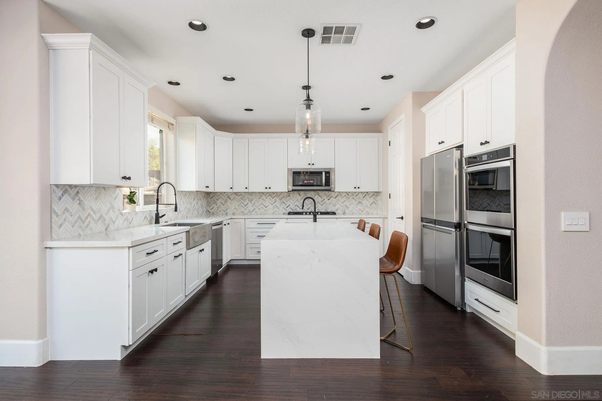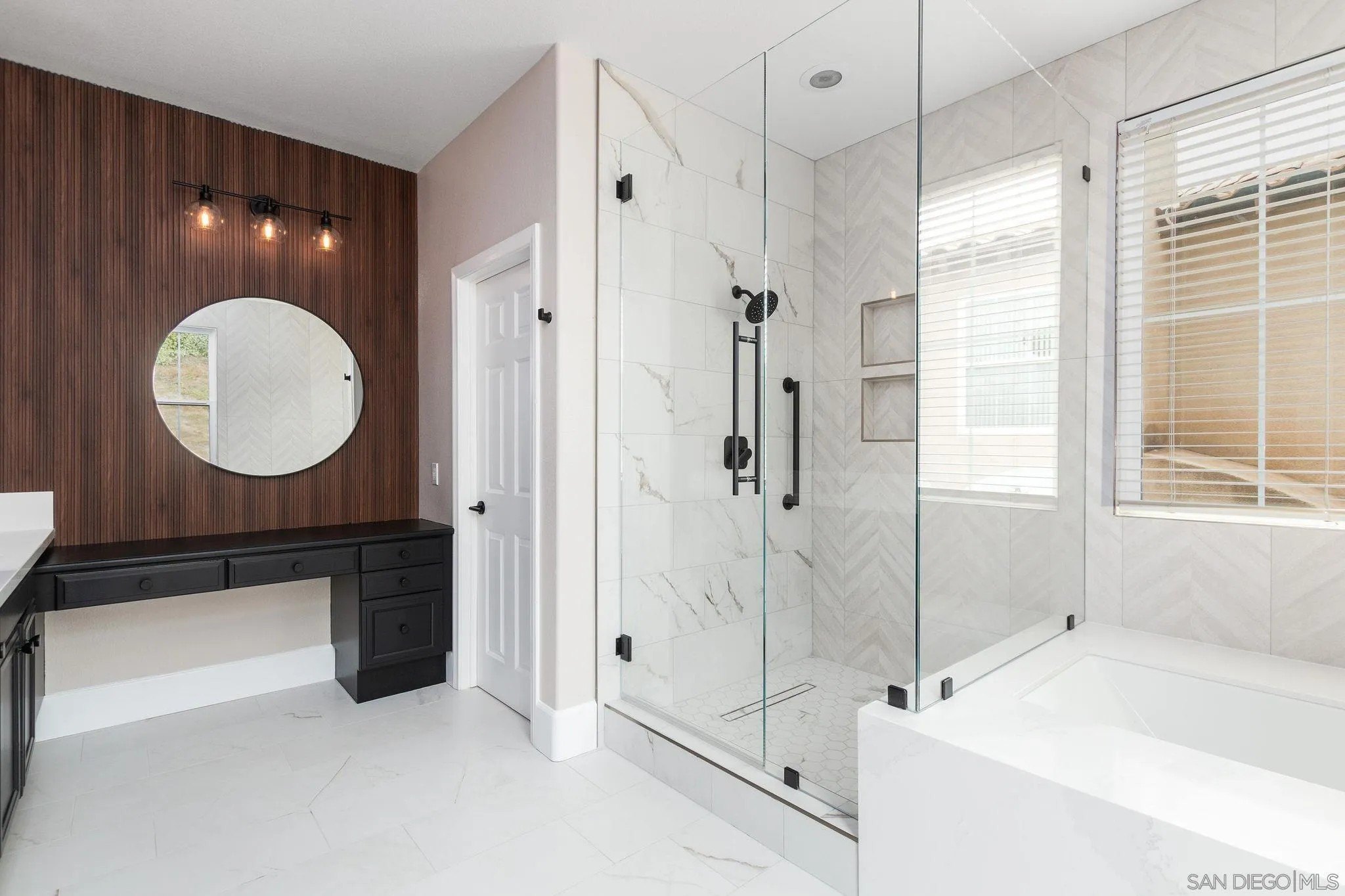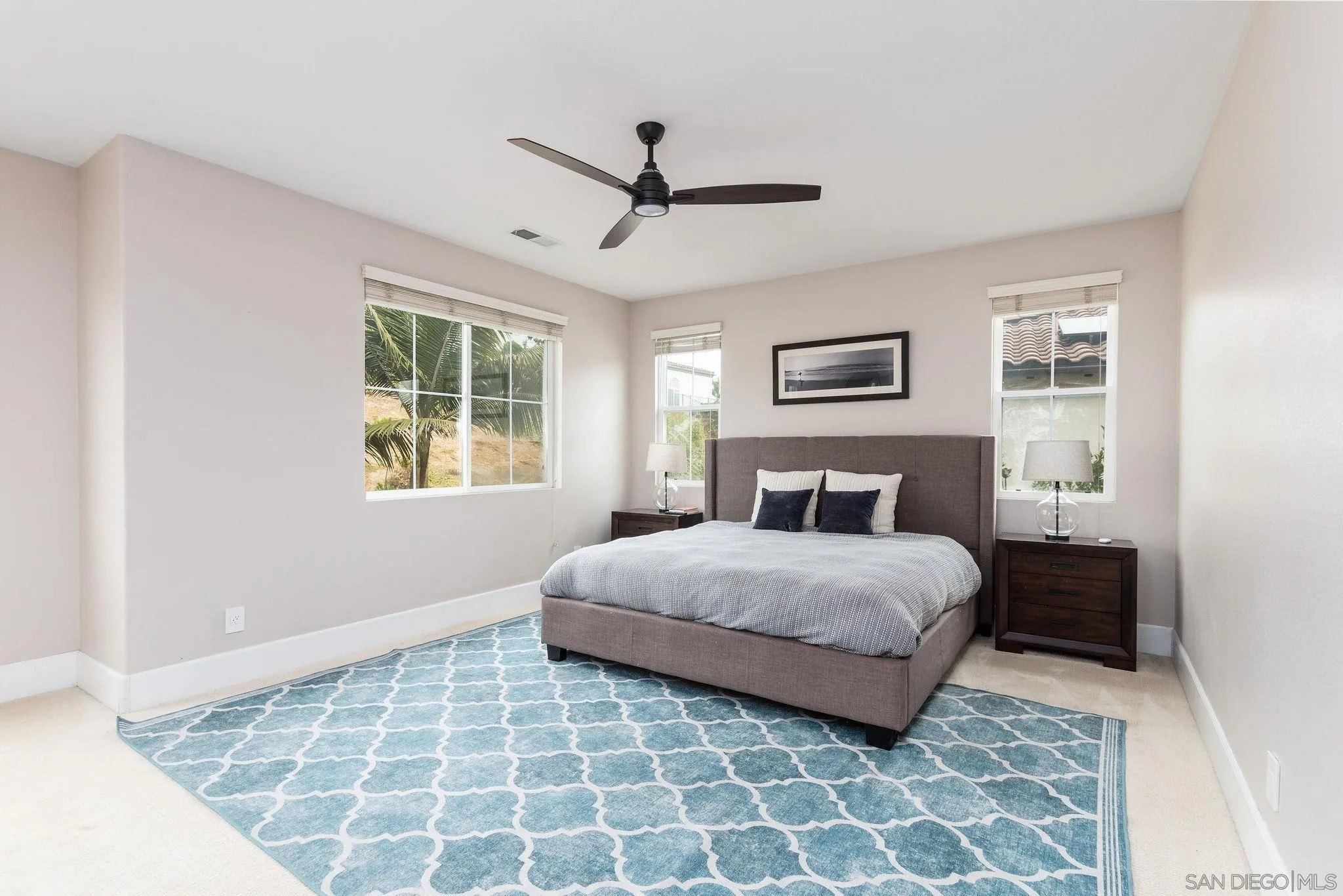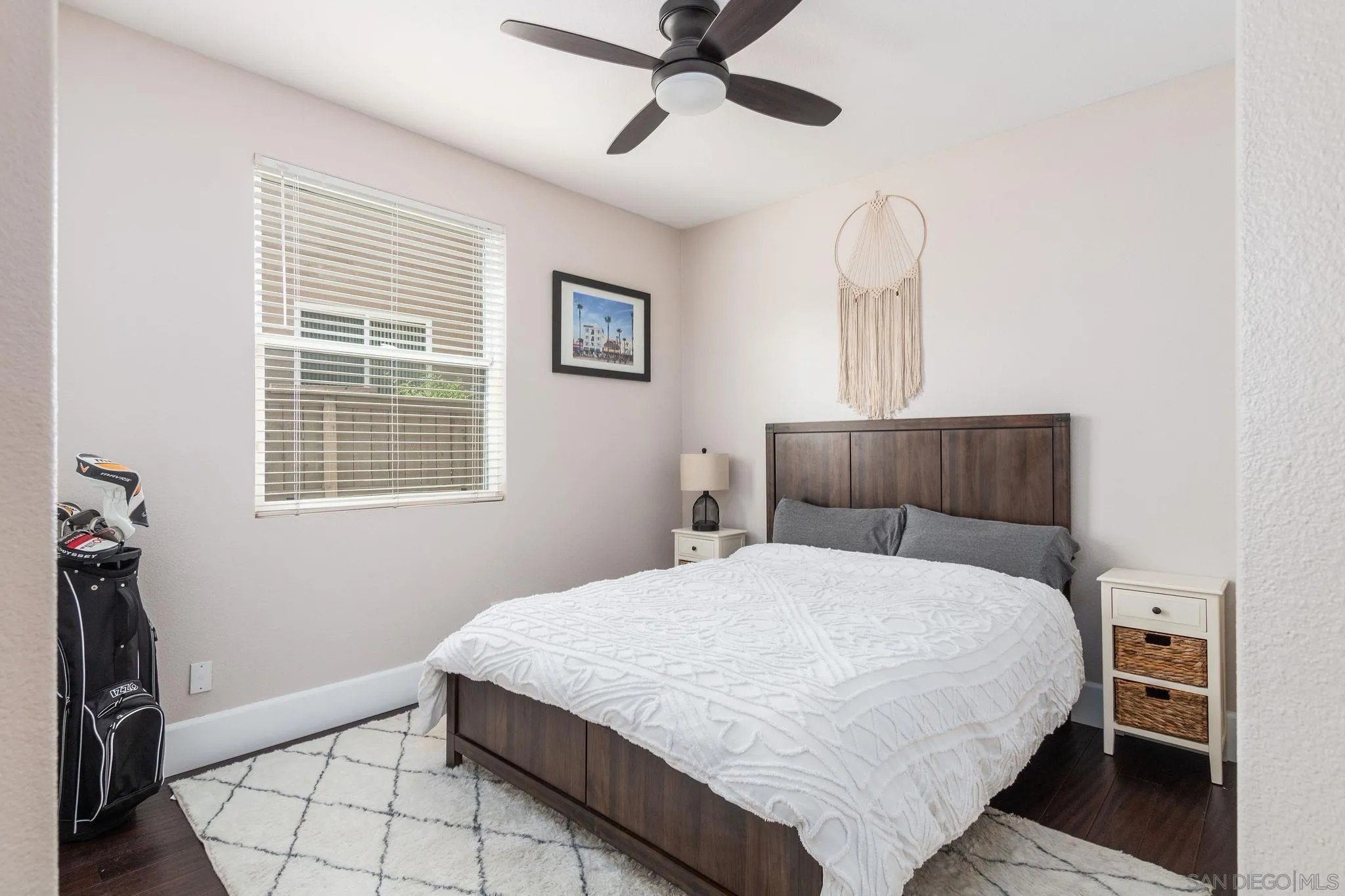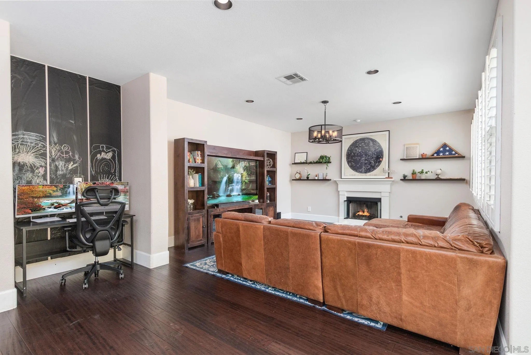 Live Your Best Life in Eastlake Vistas! This exquisite residence perfectly blends modern comfort with the relaxed, outdoor lifestyle San Diego is famous for. Enter through the gated courtyard and feel instantly welcomed—imagine sipping your favorite drink on the flagstone patio as the sun sets. Inside, you’re greeted by soaring two-story ceilings in the spacious formal living room, where dual French doors open wide for seamless indoor-outdoor living. A bedroom and full bathroom on the main level offer convenience and flexibility, while architectural details and shuttered windows allow soft, natural light to fill each room. The formal dining room sets the stage for elegant dinners and memorable gatherings. At the heart of the home, the kitchen connects formal and casual living spaces, designed for both style and function. It features crisp white cabinetry, quartz countertops, a decorative tile backsplash, a walk-in pantry, 5-burner gas cooktop, double ovens, and a large center island with pendant lighting and bar seating. Upstairs, a spacious loft offers easy potential for a 5th bedroom. You'll also find a convenient laundry room, two generously sized bedrooms, a full hallway bath, and a serene primary suite. Your personal retreat includes a flexible bonus space—perfect for a Peloton, home office, or reading nook—and a luxurious en suite bath with a walk-in closet, deep soaking tub, frameless glass shower, dual sinks, and seated vanity. The backyard is a private oasis with a pergola-covered patio, soothing hot tub, outdoor bar with seating, and lush grass for play or pets.