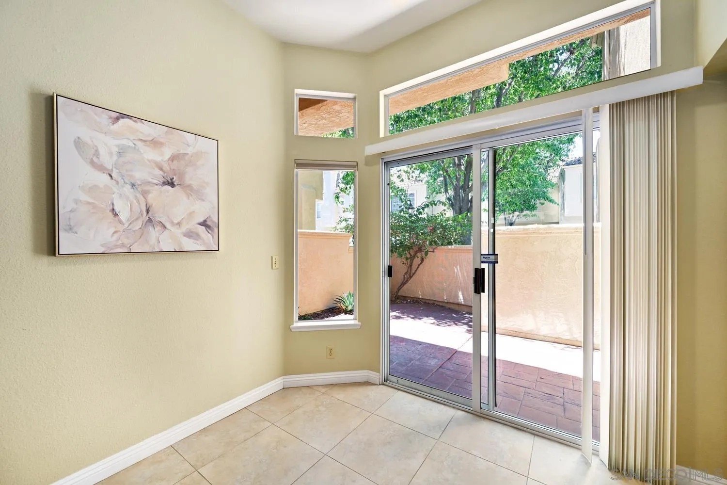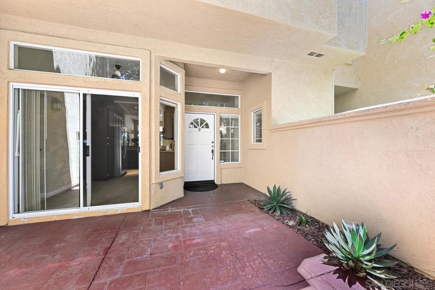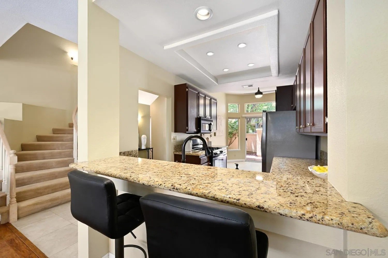 Spacious Plan Five Townhome in the Coveted Belsera Community of Tierrasanta! Welcome to this beautifully maintained two-story luxury townhome-the largest floor plan in the sought-after Belsera complex! This spacious 3-bedroom, 2.5-bath residence offers 1,528 sq. ft. of stylish living with soaring ceilings, tasteful upgrades, and a thoughtful layout. Enjoy high ceilings on the main level and vaulted ceilings upstairs, creating a bright and open atmosphere throughout. The great room features a cozy gas fireplace, while upgraded carpeting and wood laminate flooring add warmth and sophistication. A stunning Restoration Hardware chandelier elevates the formal dining area, perfect for entertaining. The kitchen is complete with granite countertops, a raised bar counter, and a cozy breakfast nook for casual dining. Upstairs, the family bathroom features a dual sink vanity-a rare and convenient upgrade for secondary bathrooms. Two private outdoor spaces-a gated entry courtyard and a large rear patio-offer multiple areas to relax and unwind. This townhome includes two single-car garages, both with panel roll-up doors-one with direct access through the kitchen, and the other nearby for added convenience. In addition, there are non-assigned outdoor parking spaces designated for residents, with each unit receiving a parking permit for shared use. Belsera residents enjoy exceptional amenities including two pools and spas, a sand volleyball court, picnic areas, and ample guest parking.
