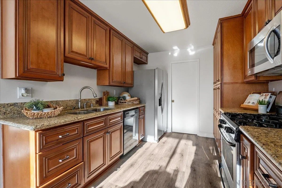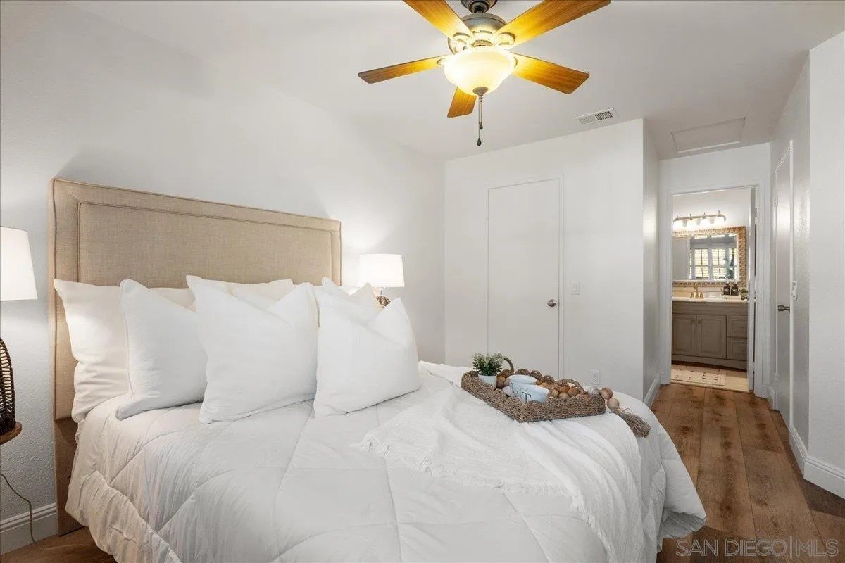 VA approved and move-in ready, this bright and breezy 2 bed, 2 bath upstairs condo offers peaceful west-facing views overlooking the greenbelt, with no neighbors above or behind. The open and airy floor plan features wide-plank luxury vinyl flooring throughout, fresh paint, and an updated kitchen that flows seamlessly into the living and dining areas, filled with natural light. The home includes a private 1-car garage and is located in a well-maintained community with lush landscaping, walking paths, and a sparkling pool and spa. HOA dues cover water, sewer, trash, exterior maintenance, and access to all community amenities. Ideally situated just 6 miles from the beach with easy access to Hwy 76, I-5, and 78, this location is perfect for commuters, first-time buyers, or anyone looking to enjoy the best of Oceanside living. Zoned for highly rated schools including Ivey Ranch Elementary, Martin Luther King Jr. Middle School, and El Camino High School.