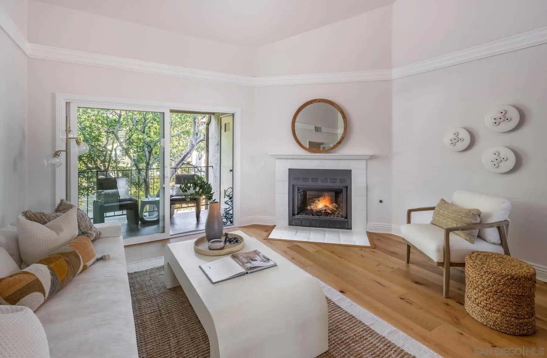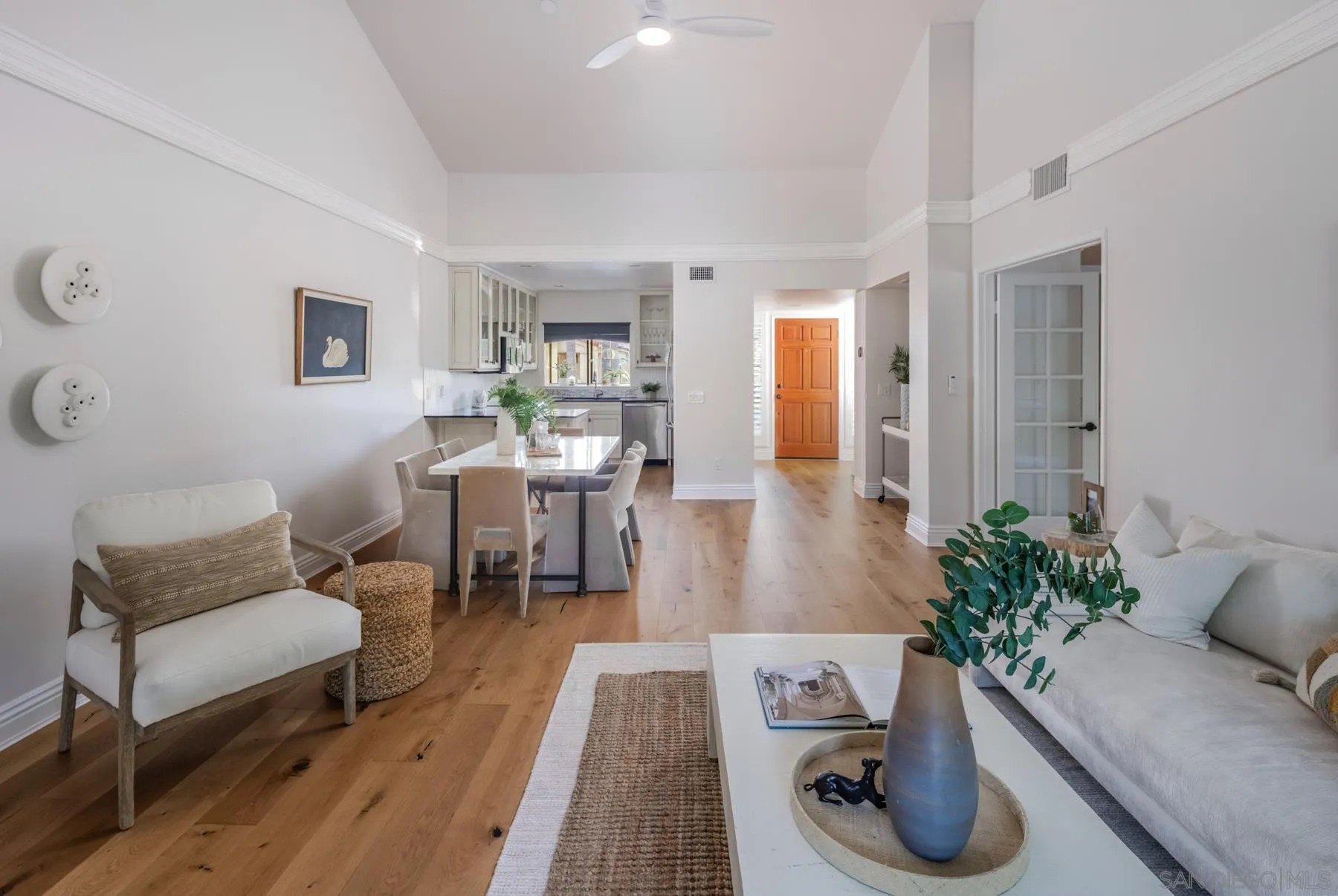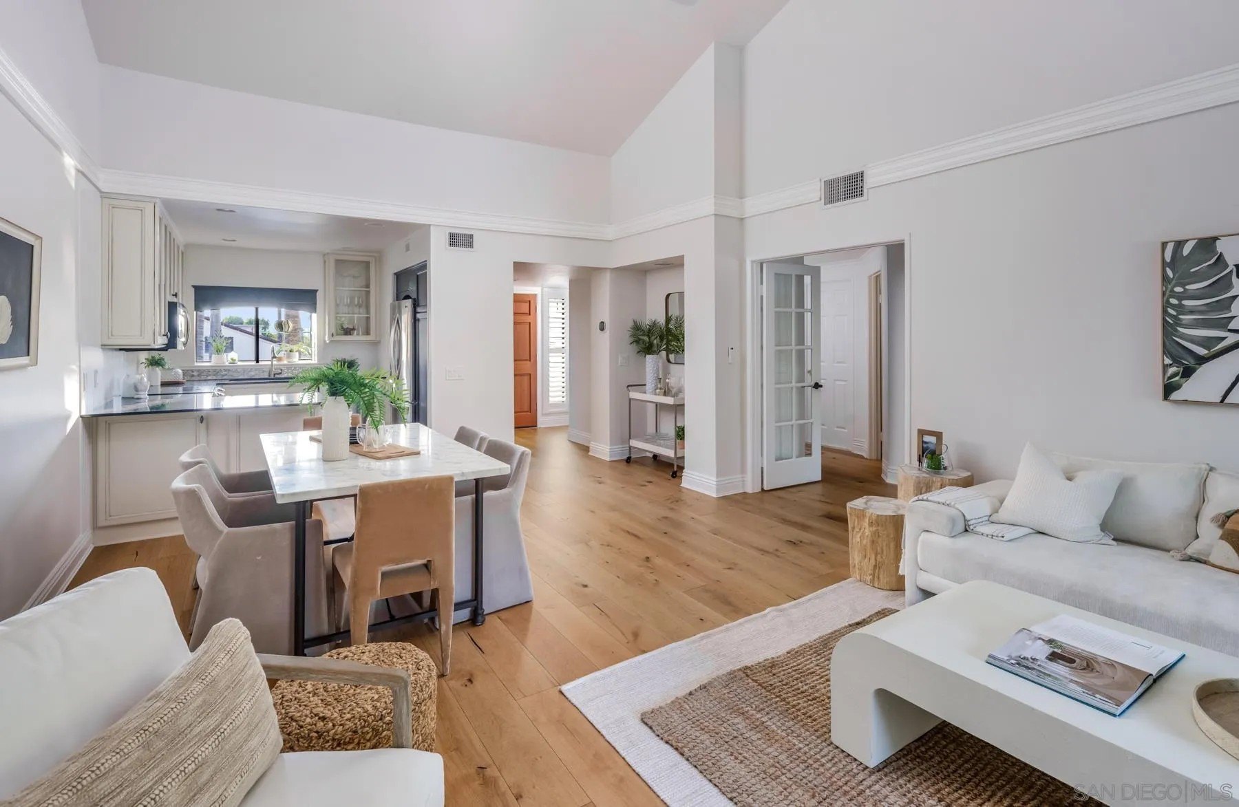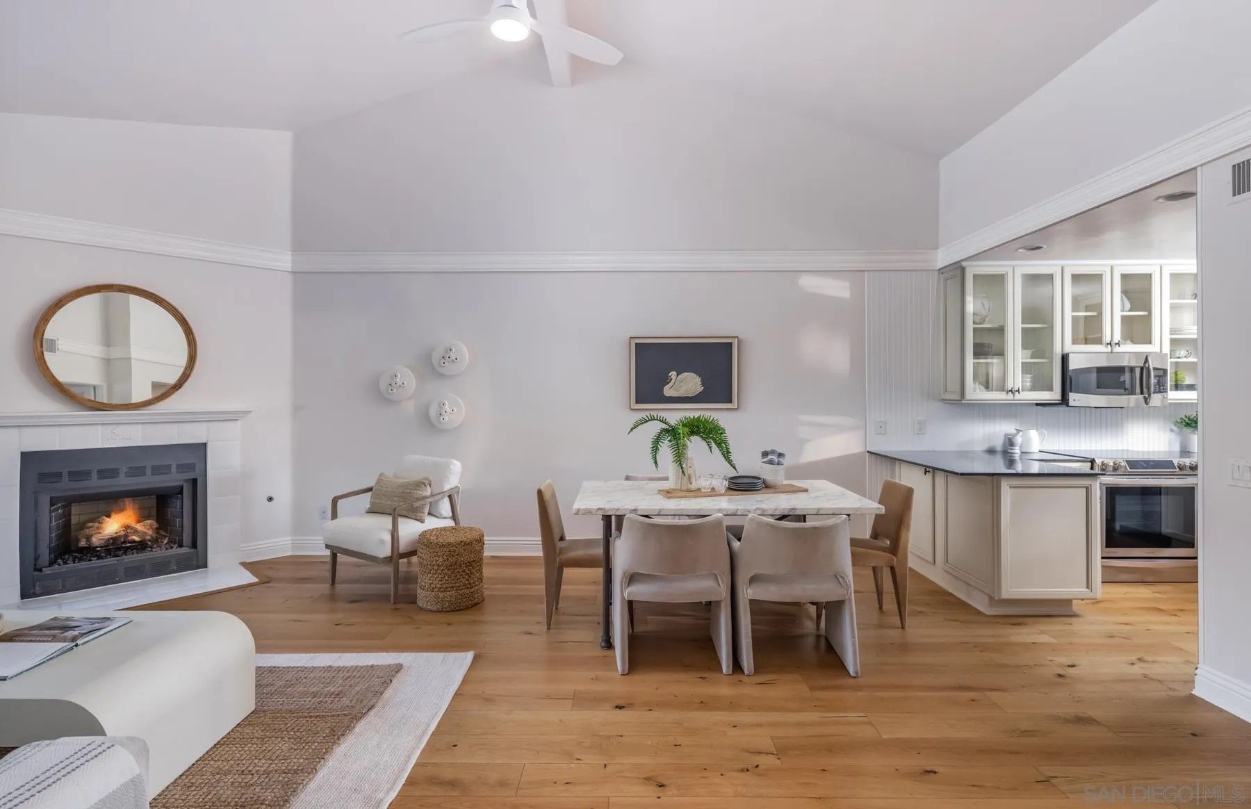 Modern La Costa Retreat! First time on the market, this 2 bed, 2 bath upstairs residence shows true pride of ownership and has been extensively updated over time to create a modern, move-in ready home. The open floor plan features vaulted ceilings, wide-plank white oak wood floors, and a sleek fireplace, with seamless access to an oversized patio from the main living areas. The primary suite offers a walk-in closet with custom built-ins and a skylit bathroom with wainscoting and polished nickel finishes, blending functionality with timeless style. A well-separated secondary bedroom and full bath complete the layout, providing privacy for both suites. Upgrades include dual-pane windows, new LG French door refrigerator, stackable LG washer and dryer, new A/C condenser and ceiling fans, an induction cooktop, convection oven with warming drawer, and smart thermostat. The home also comes with a one-car garage and a dedicated parking space. Sea Point Tennis Club offers resort-style amenities with two pools, three spas, and four tennis courts, all within a beautifully maintained community. Just minutes from top-rated schools, golf, shopping, dining, hiking trails, and the beach. This home blends modern living with the best of La Costa's coastal lifestyle!
