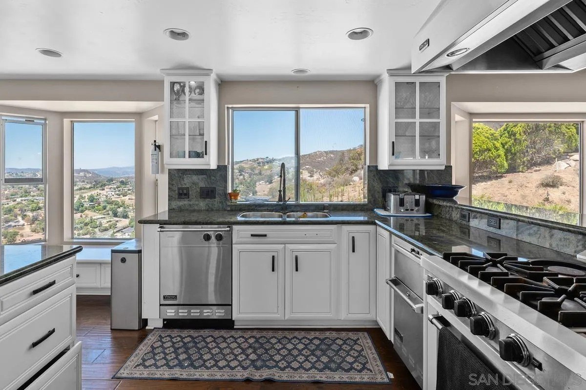 Granite Hills entertainer's oasis! This 1.25-acre estate offers panoramic views, 4 bedrooms, 4 baths, and abundant living space. Garages for 5 vehicles, RV parking, and owned solar add convenience and value. Inside, rich wood floors flow through the great room to walls of windows framing forever views. The gourmet kitchen features dramatic granite counters, Viking appliances, a 60" six-burner range, and 48" Sub-Zero refrigerator. The formal dining area doubles as a game room, while the sunken living room and two balconies create ideal gathering spaces. The primary suite showcases sweeping vistas, a walk-in closet, and spa bath with dual vanities, separate shower, and Jacuzzi tub. Downstairs includes 2 bedrooms, 2 full baths, laundry room, bonus space, and family area. Detached garage converted into a 2 bed 1 bath ADU with Kitchen. Great value for extended family or rental. Resort-style living with privacy, parking, and panoramic views-welcome home!