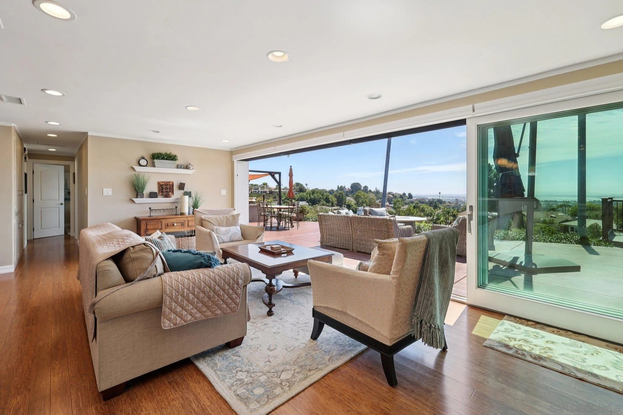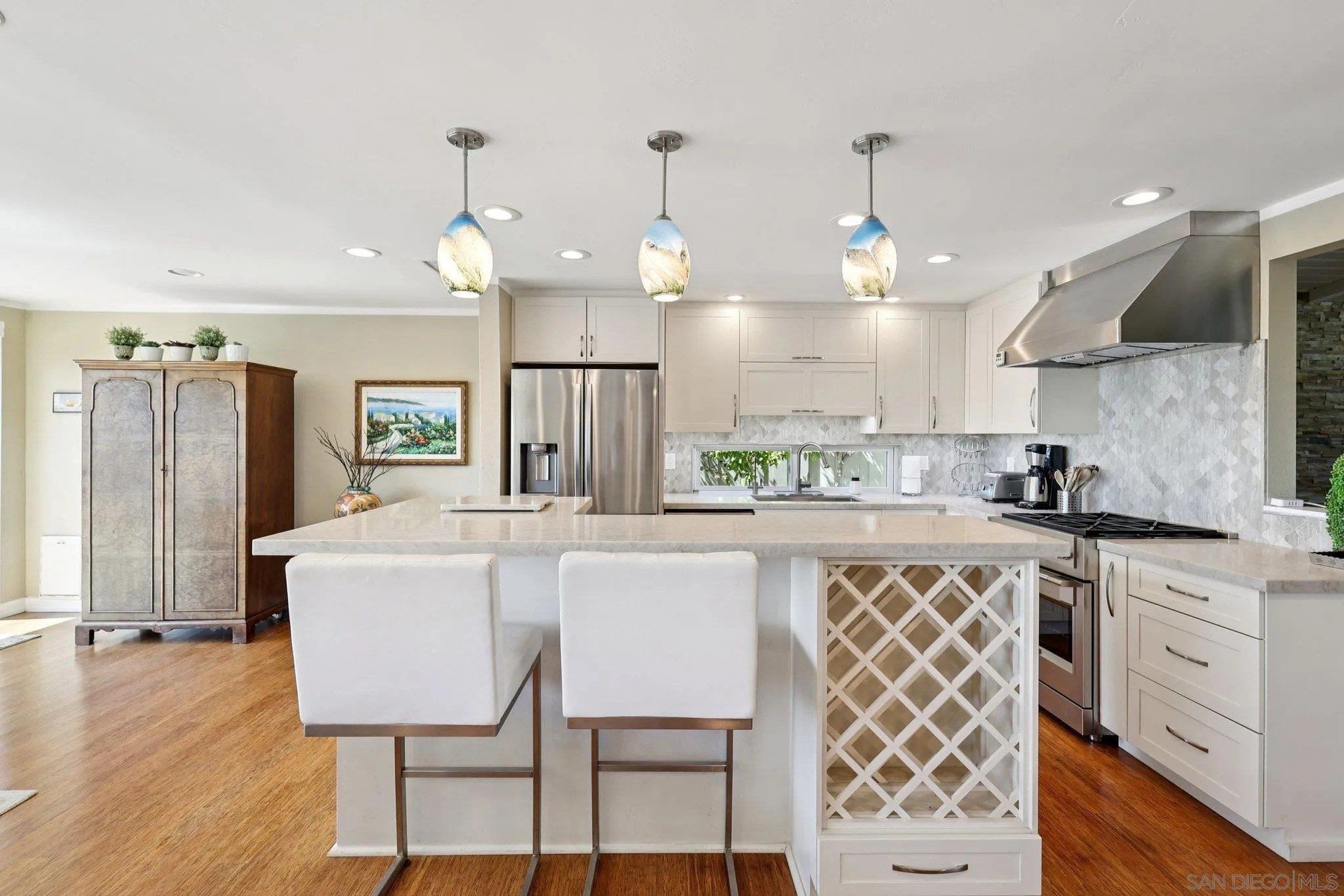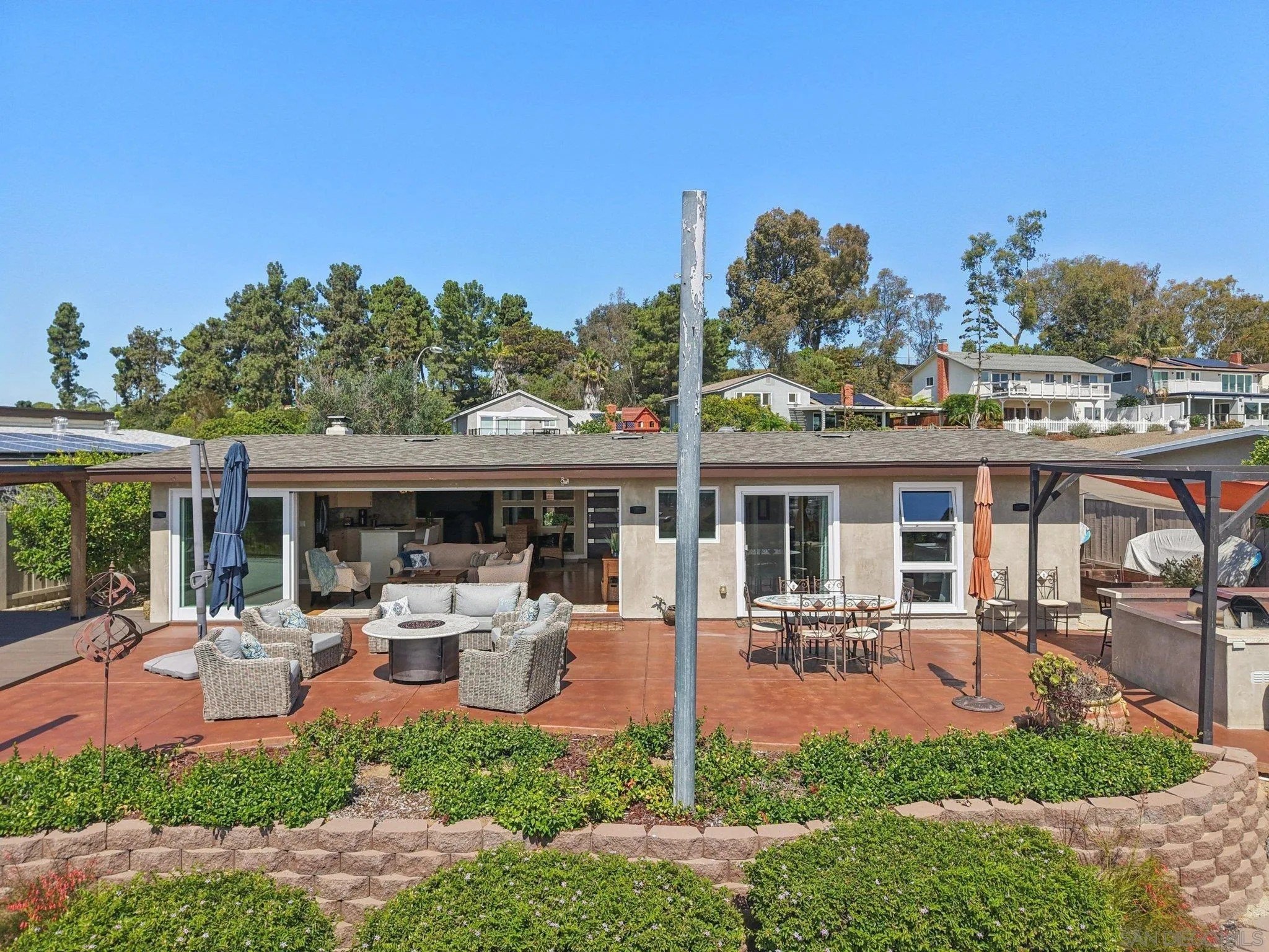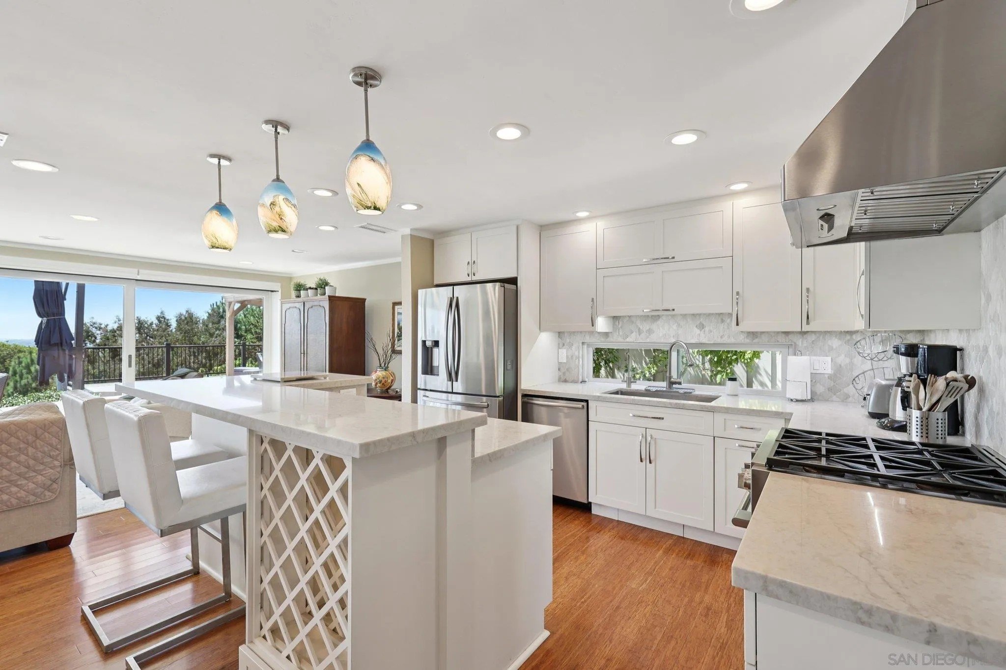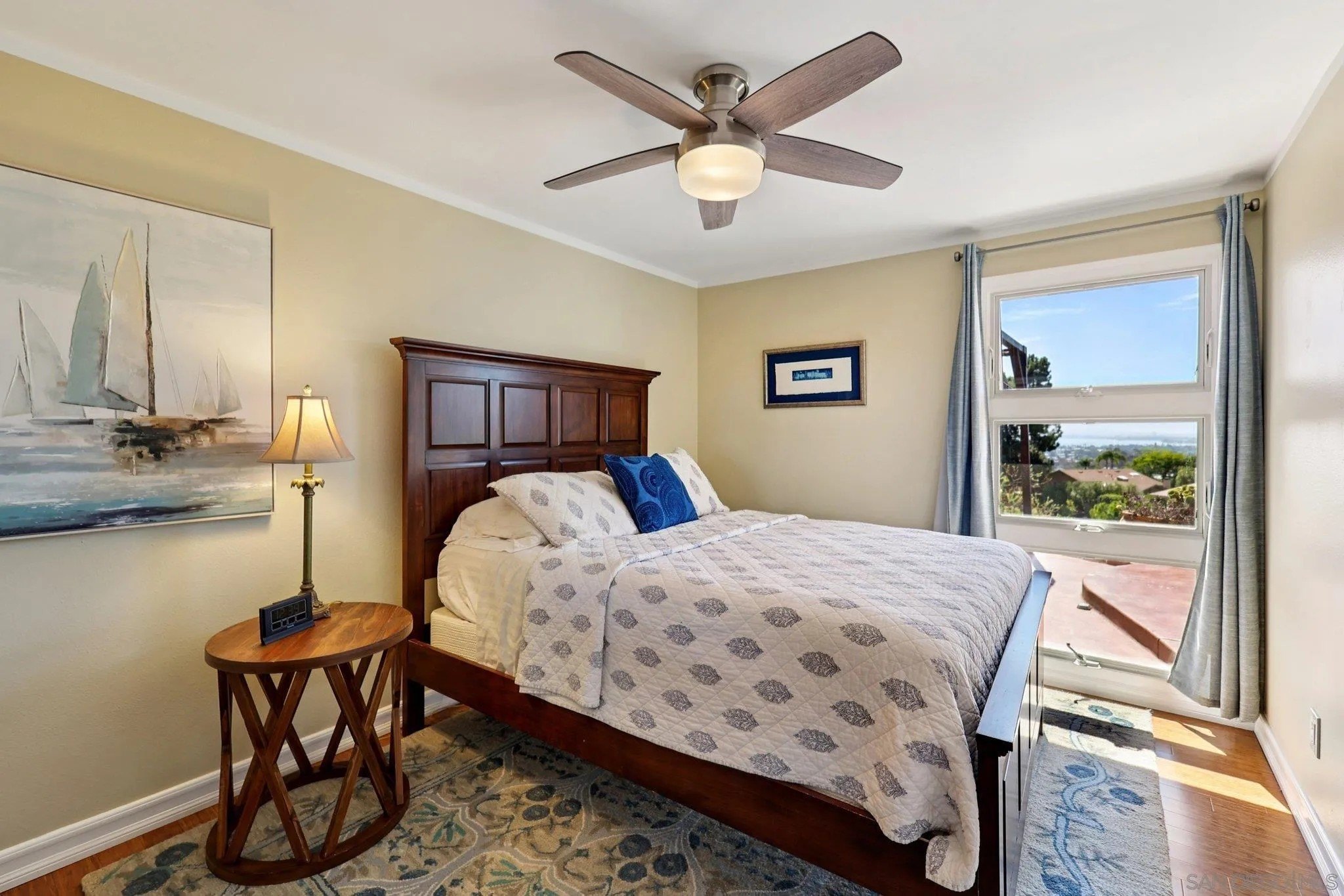 Welcome to this one-of-a-kind Bay Ho residence, a single-story retreat showcasing custom upgrades and breathtaking sit-down views of Mission Bay. Homes of this caliber rarely come to market. From the moment you step inside, you'll be impressed by the open floor plan, the beautifully remodeled kitchen, and the seamless connection between indoor and outdoor living. The kitchen is a showpiece, featuring cream shaker cabinetry, quartz countertops, a designer tile backsplash, a large island with seating, and high-end stainless steel appliances, including a Fulgor Milano oven. The great room flows effortlessly to the backyard through an impressive 23-foot four-panel panoramic sliding door, opening to a private outdoor sanctuary with multiple spaces for entertaining. The backyard is truly remarkable, offering expansive bay views, a built-in BBQ island with bar seating, a synthetic deck with a covered patio, and thoughtfully designed areas for relaxation or gatherings. Fruit trees, including fig and citrus, add to the charm, while the fenced backyard provides peace of mind and privacy. Inside, engineered strand-woven bamboo floors, recessed lighting, bronze hardware, and a large brick fireplace create warmth and style. The home also includes dual-pane windows, ceiling fans in every bedroom, smooth stucco finish, and a security courtyard with a designer metal gate and custom front door. The master suite features its own private oasis, while the den offers a cozy space to unwind by the gas fireplace.