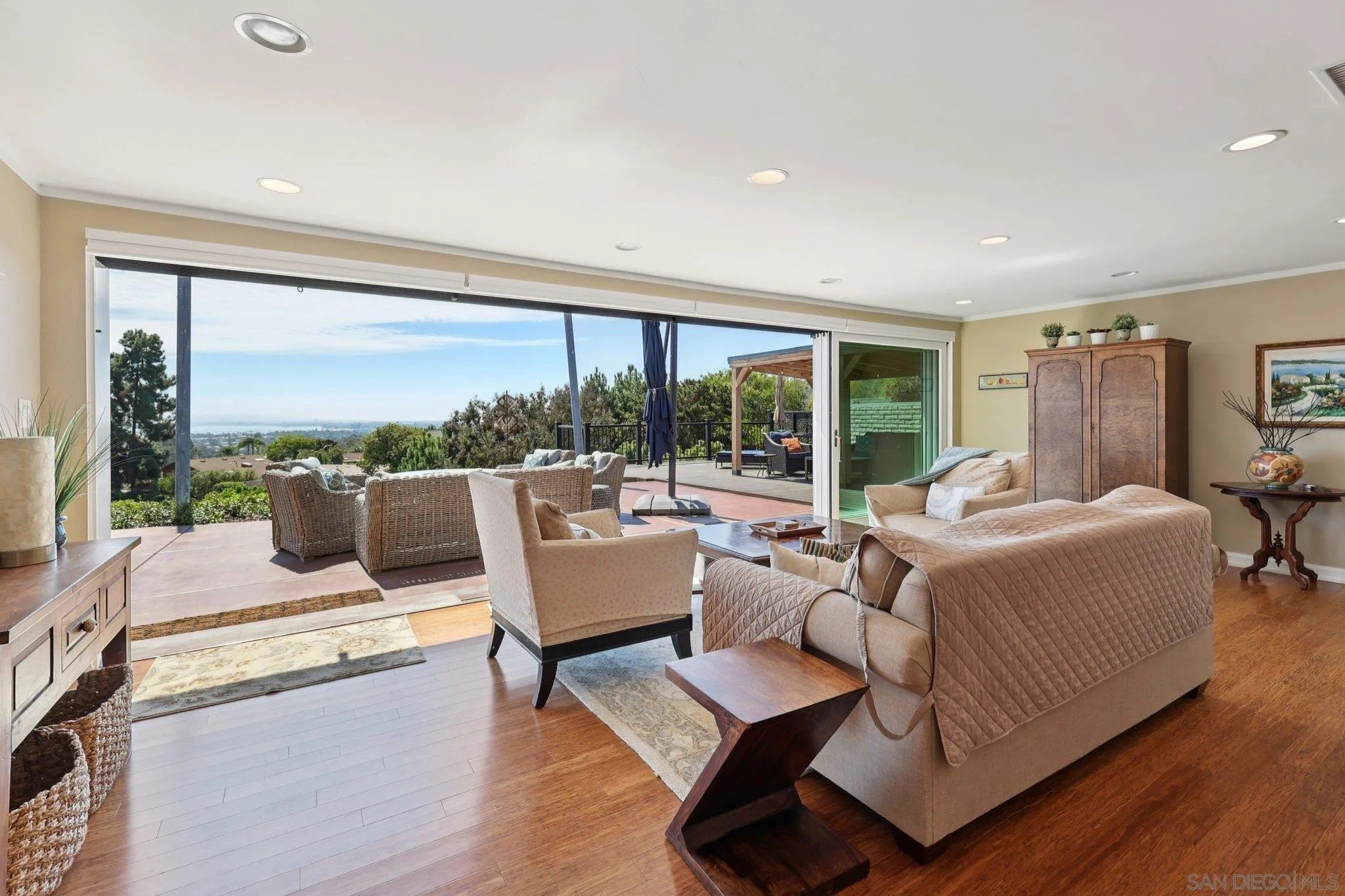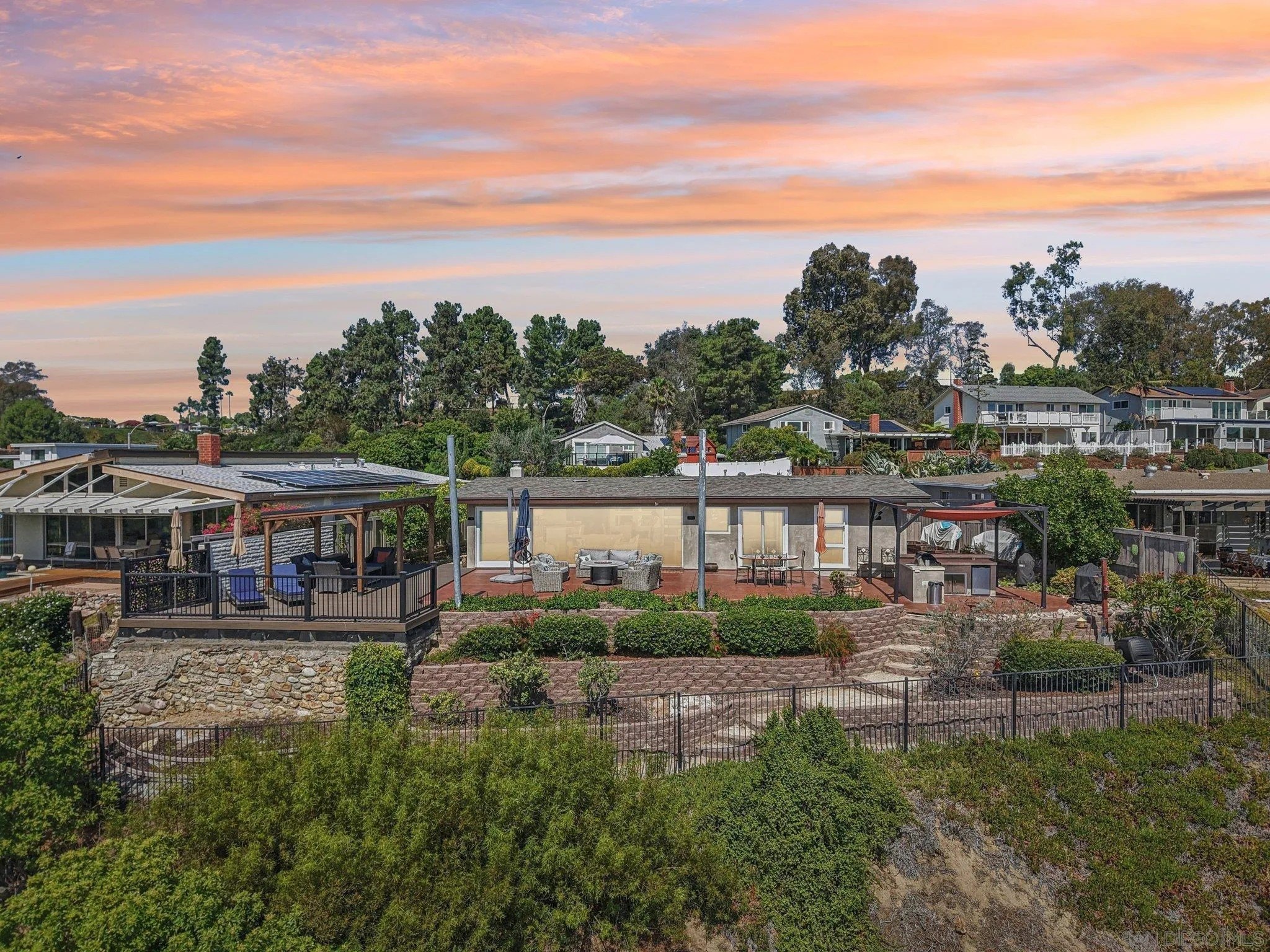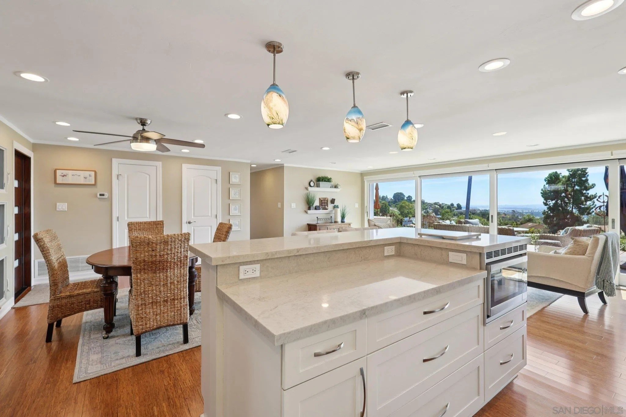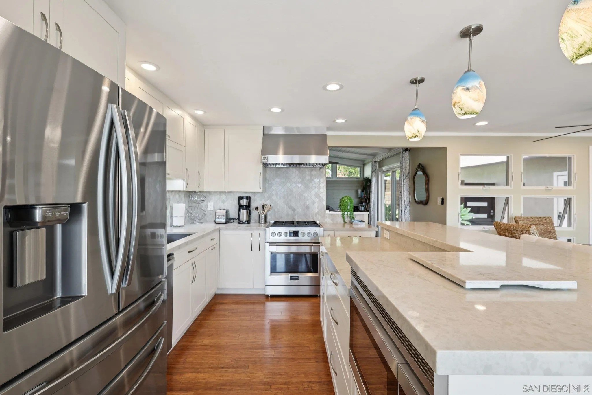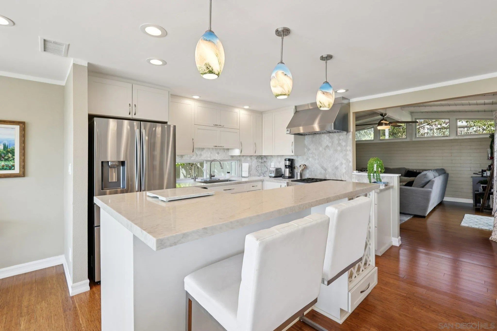 Welcome to this one-of-a-kind Bay Ho residence, a single-story retreat showcasing custom upgrades and breathtaking sit-down views of Mission Bay. Homes of this caliber rarely come to market. From the moment you step inside, you'll be impressed by the open floor plan, the beautifully remodeled kitchen, and the seamless connection between indoor and outdoor living. The kitchen is a showpiece, featuring cream shaker cabinetry, quartz countertops, a designer tile backsplash, a large island with seating, and high-end stainless steel appliances, including a Fulgor Milano oven. The great room flows effortlessly to the backyard through an impressive 23-foot four-panel panoramic sliding door, opening to a private outdoor sanctuary with multiple spaces for entertaining. The backyard is truly remarkable, offering expansive bay views, a built-in BBQ island with bar seating, a synthetic deck with a covered patio, and thoughtfully designed areas for relaxation or gatherings. Fruit trees, including fig and citrus, add to the charm, while the fenced backyard provides peace of mind and privacy. Inside, engineered strand-woven bamboo floors, recessed lighting, bronze hardware, and a large brick fireplace create warmth and style. The home also includes dual-pane windows, ceiling fans in every bedroom, smooth stucco finish, and a security courtyard with a designer metal gate and custom front door. The master suite features its own private oasis, while the den offers a cozy space to unwind by the gas fireplace.