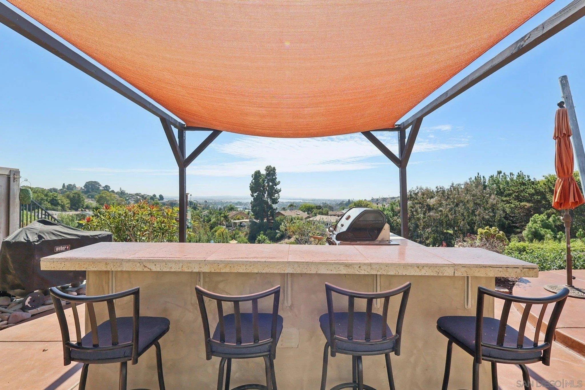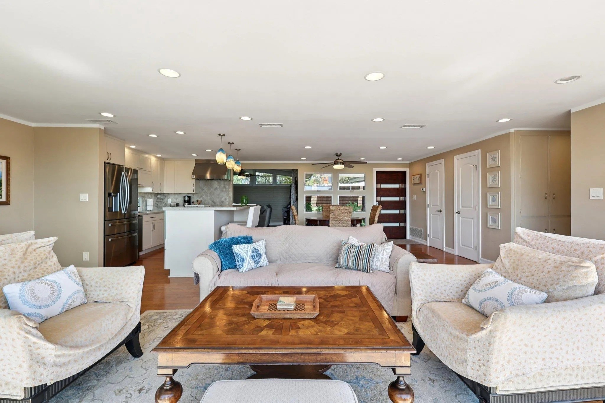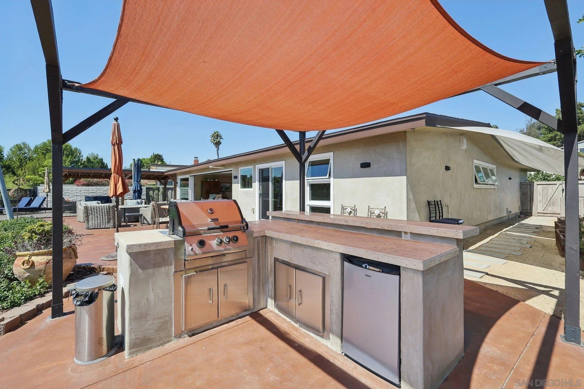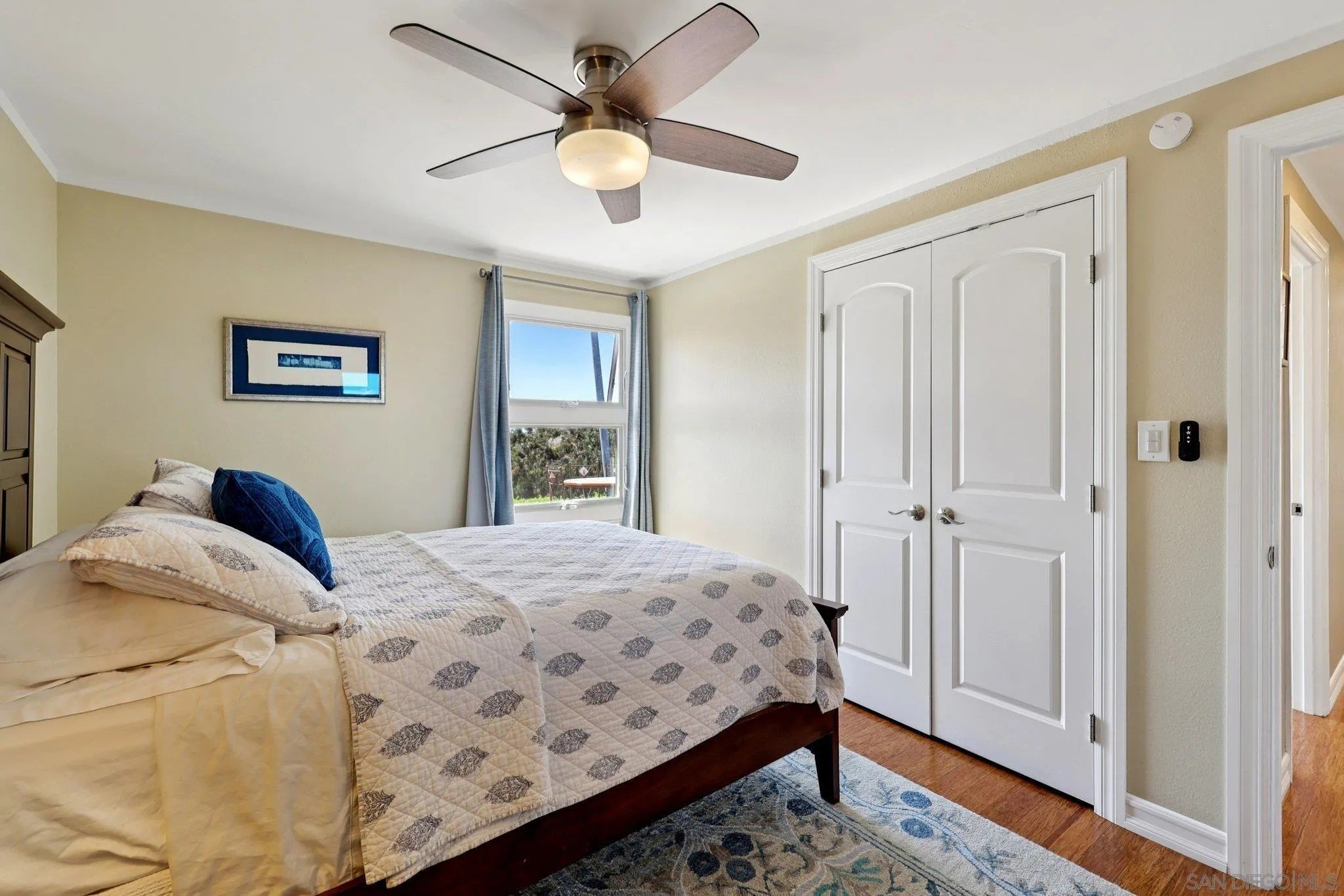 Welcome to this one-of-a-kind Bay Ho residence, a single-story retreat showcasing custom upgrades and breathtaking sit-down views of Mission Bay. Homes of this caliber rarely come to market. From the moment you step inside, you'll be impressed by the open floor plan, the beautifully remodeled kitchen, and the seamless connection between indoor and outdoor living. The kitchen is a showpiece, featuring cream shaker cabinetry, quartz countertops, a designer tile backsplash, a large island with seating, and high-end stainless steel appliances, including a Fulgor Milano oven. The great room flows effortlessly to the backyard through an impressive 23-foot four-panel panoramic sliding door, opening to a private outdoor sanctuary with multiple spaces for entertaining. The backyard is truly remarkable, offering expansive bay views, a built-in BBQ island with bar seating, a synthetic deck with a covered patio, and thoughtfully designed areas for relaxation or gatherings. Fruit trees, including fig and citrus, add to the charm, while the fenced backyard provides peace of mind and privacy. Inside, engineered strand-woven bamboo floors, recessed lighting, bronze hardware, and a large brick fireplace create warmth and style. The home also includes dual-pane windows, ceiling fans in every bedroom, smooth stucco finish, and a security courtyard with a designer metal gate and custom front door. The master suite features its own private oasis, while the den offers a cozy space to unwind by the gas fireplace.