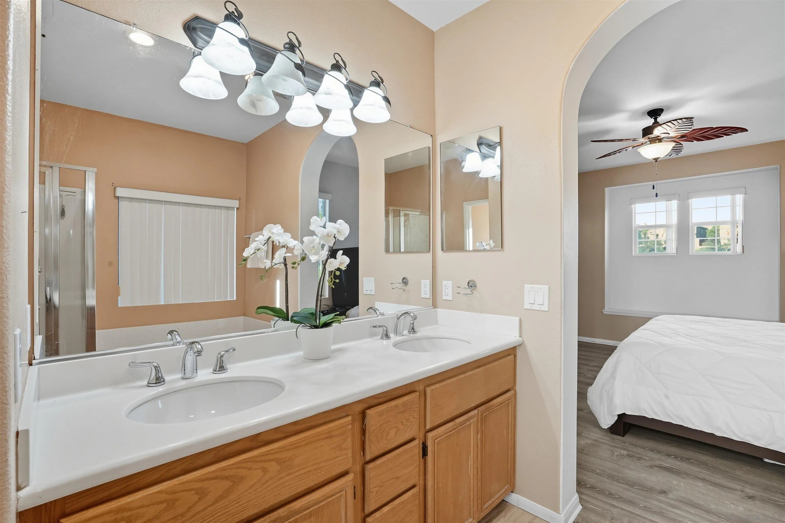Priced to Sell! Don't miss this spacious corner-lot home in the sought-after Arrowood Community with PAID SOLAR, NO MELLO ROOS AND LOW HOA! Step inside to soaring vaulted ceilings that flood the living room with natural light. The kitchen is oversized and open, offering ample cabinet space, a large prep area, and direct flow into the second living room featuring a cozy fireplace and custom built-ins, ideal for gathering with friends and family. One bedroom with a full en-suite bathroom on the main floor provides excellent flexibility for guests, extended family, or a home office. Upstairs you will find three generously sized bedrooms where you will enjoy abundant light and space. The primary suite features a spa-like bathroom with double sinks, a soaking tub, and a separate shower, your own retreat to unwind after a long day. The backyard is designed for entertaining, complete with a paved patio that's perfect for BBQs, pets, or play. Located on a quiet corner lot, this home has both privacy and curb appeal. While the condition leaves room for updating, this is a wonderful opportunity to add your personal touch, build instant equity, and truly make it your own. Arrowood is known for its friendly community, nearby parks, golf course, pools and access to excellent schools. Hurry, homes like this, priced to sell in Arrowood, rarely last long!