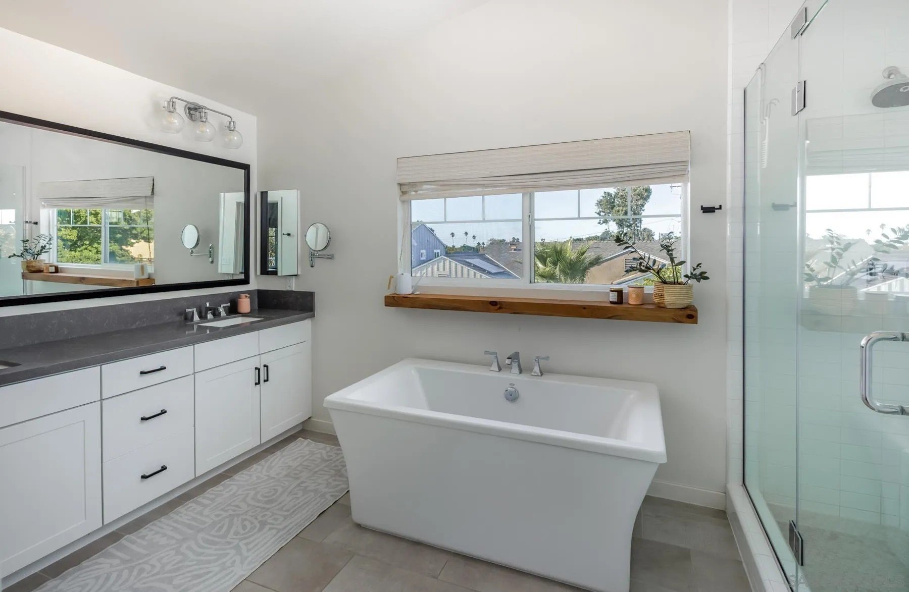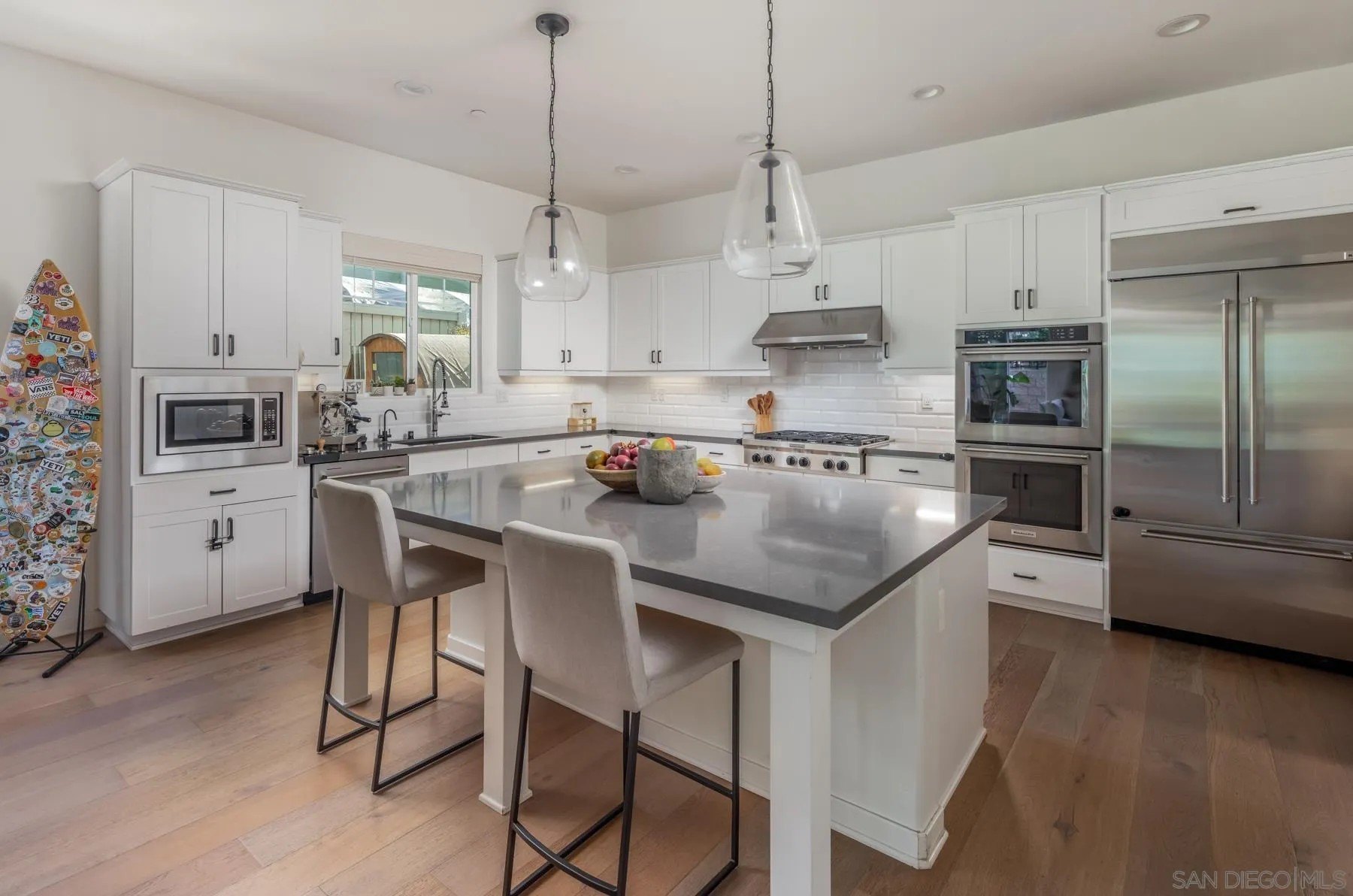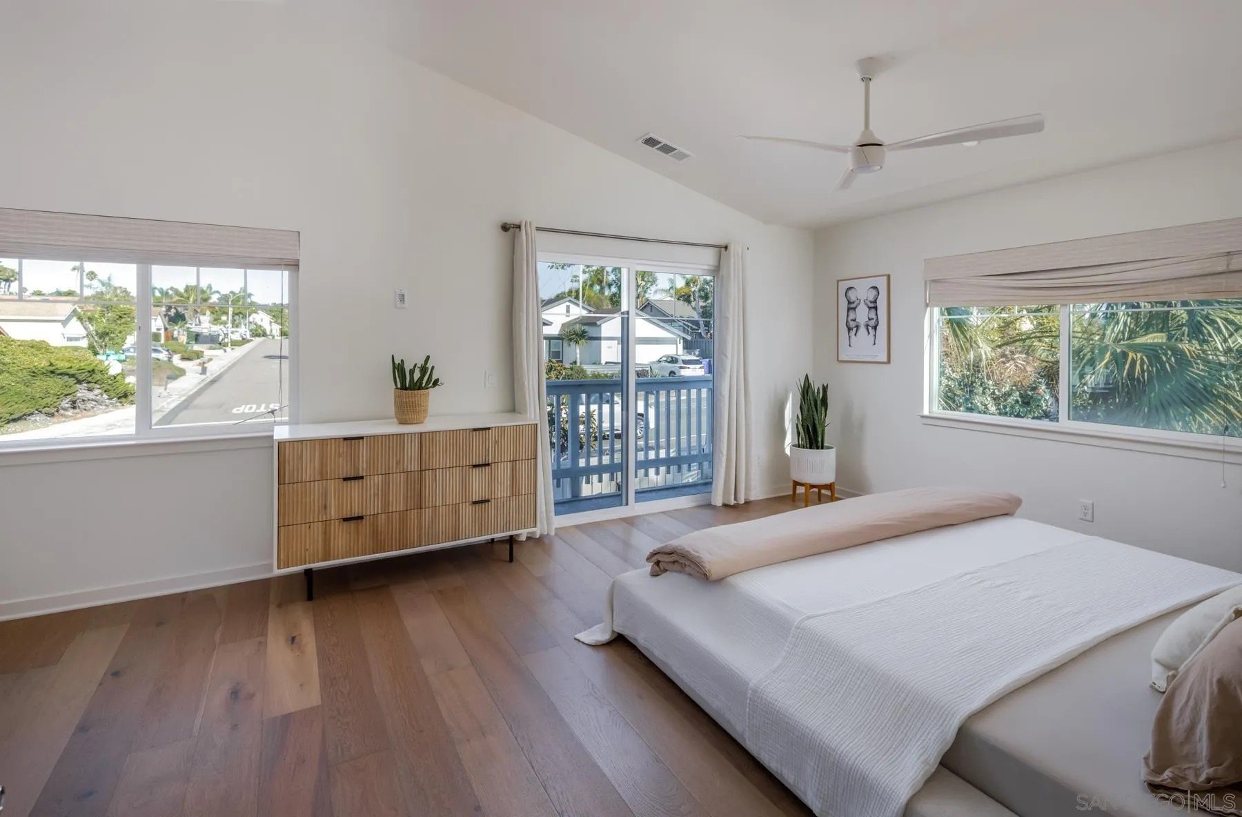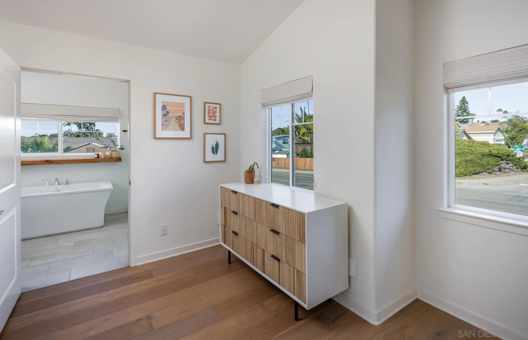 Style, function and the Cardiff lifestyle! This 2,500 sq ft coastal home offers modern design, generous space, and a prime location near parks, schools, and the beach. Soaring 10-ft ceilings and an open floor plan flow seamlessly to a private front yard, a backyard with sauna, and a tiered rear deck, perfect for entertaining or sunset views. The main level features a separate bedroom with ensuite bath, ideal for a guest retreat or extended visitors. Upstairs, the oversized primary suite provides a private escape. Additionally, a flexible bonus room with an oversized barn door and Murphy bed, can serve as a fifth bedroom, office, or media space. Highlights include wide-plank wood floors throughout, custom closets, designer fixtures, an outdoor sauna, and energy-efficient features such as owned solar and tankless water heater. All within walking distance to Encinitas Park, Seaside Market, and the beach.