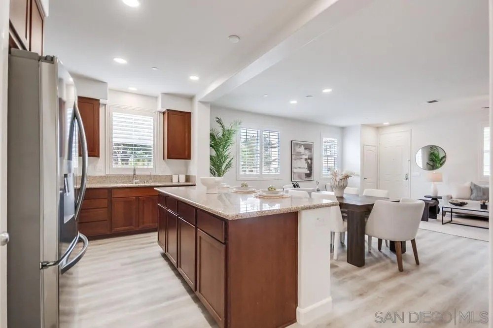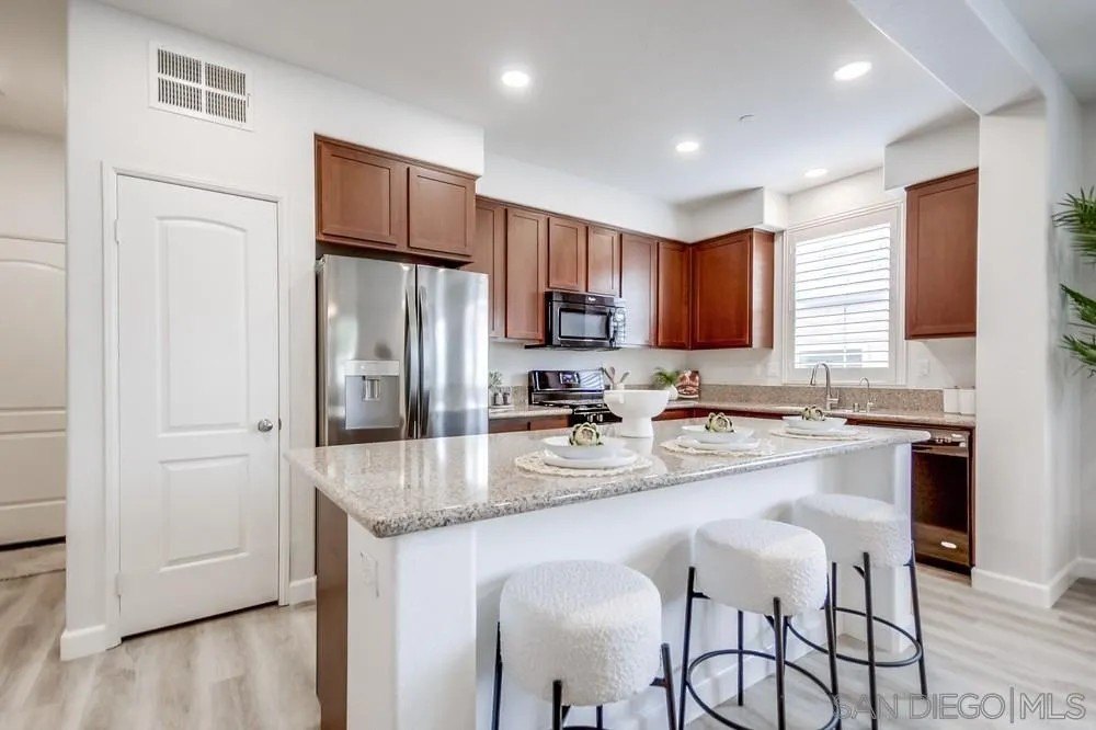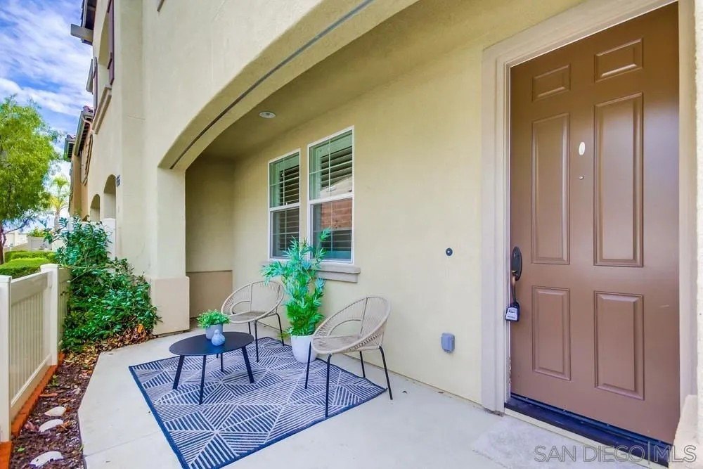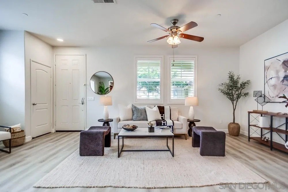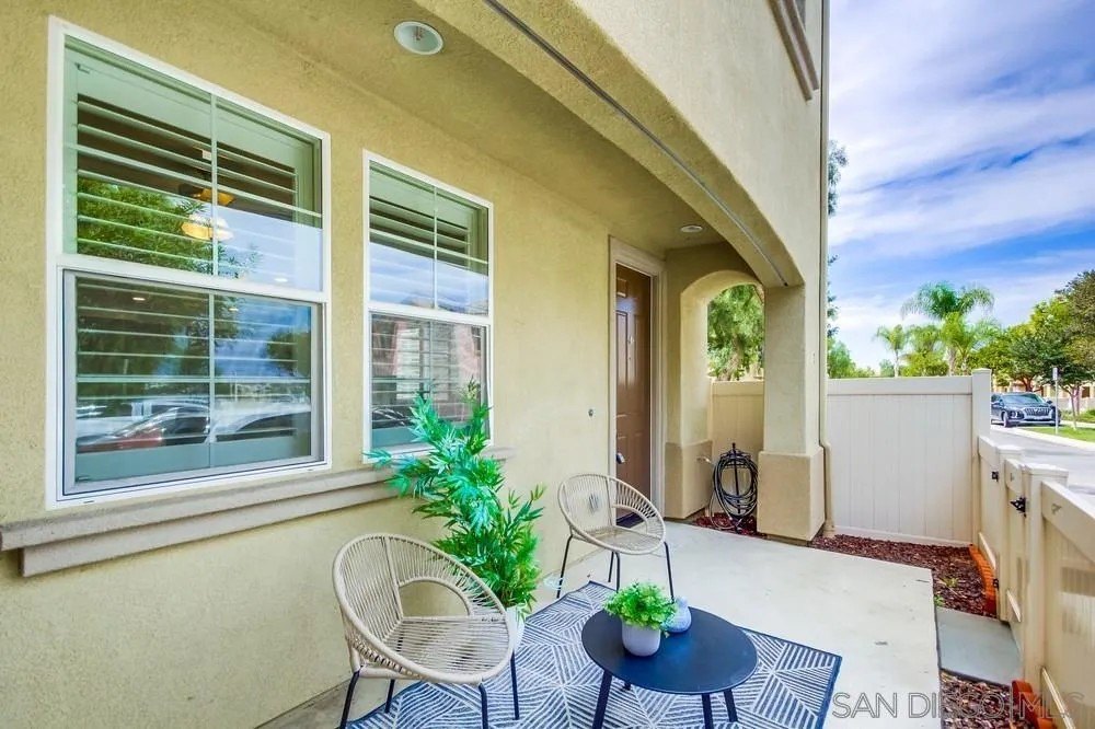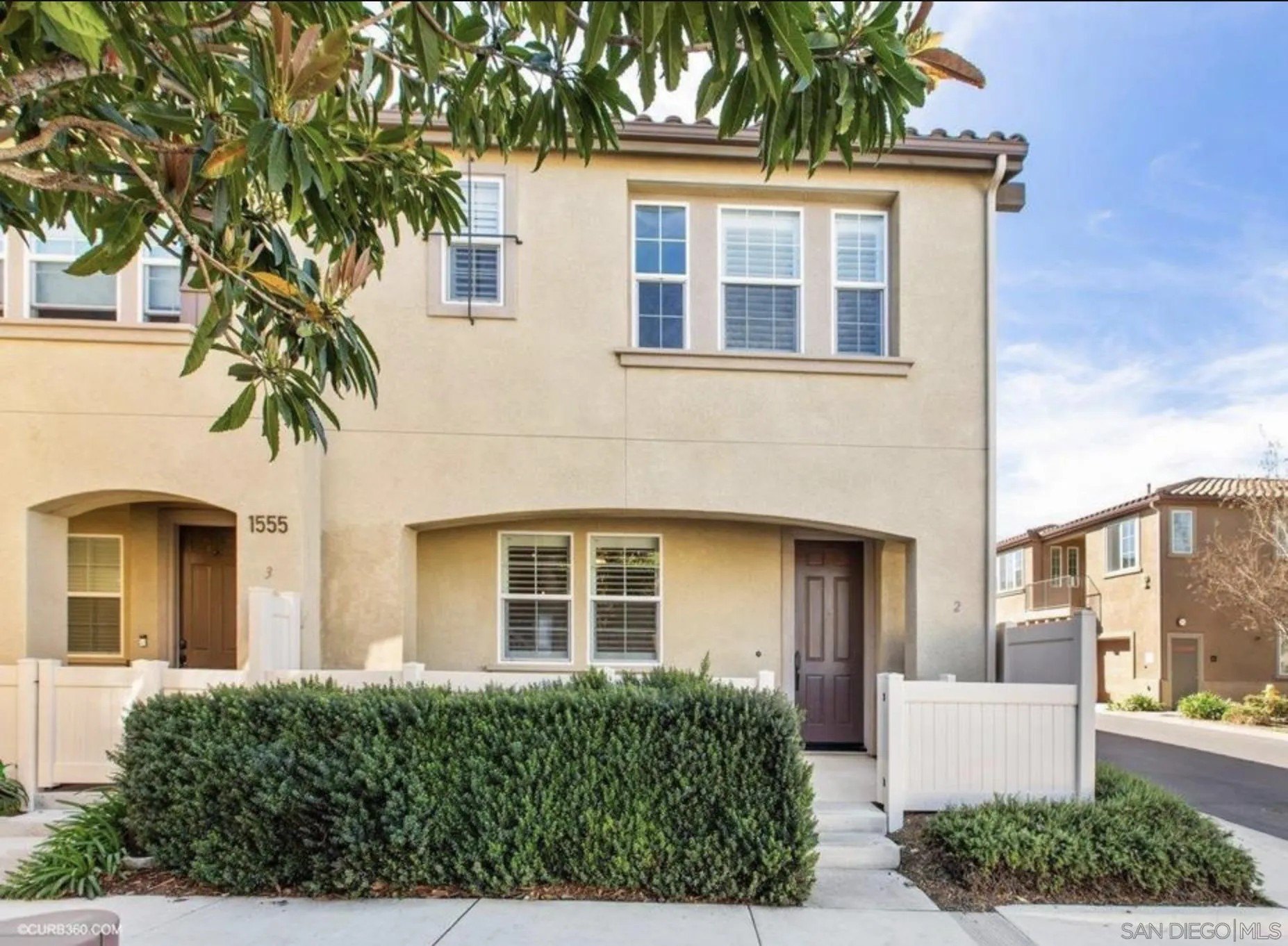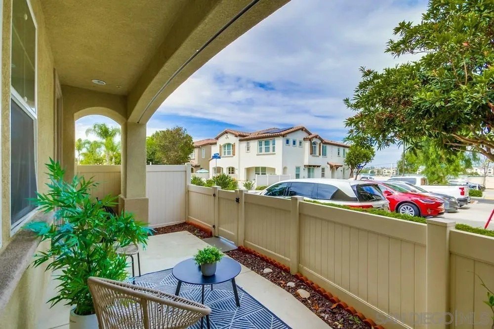 Welcome home to this turn-key end-unit townhouse in the desirable Otay Ranch community! This quiet home is attached on only one side and features a bright, airy interior with brand-new luxury vinyl plank flooring throughout the living areas, new carpet upstairs, and fresh white paint that enhances the feeling of space and light. The open floor plan is perfect for entertaining, while 10-foot ceilings throughout add an extra sense of openness. The kitchen is a chef's dream, boasting custom hardwood cabinetry, granite countertops, and a huge kitchen island. Enjoy new LED recessed lighting in the living area, a convenient half-bath downstairs, and most windows fitted with high-end wood plantation shutters. Upstairs, you'll find three spacious bedrooms, including a primary suite that boasts a huge walk-in closet and a separate water closet. Step outside to your private patio, perfect for morning coffee or evening BBQs.