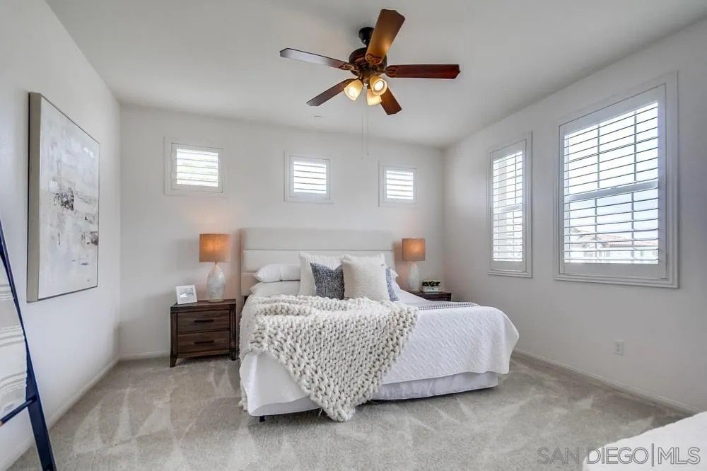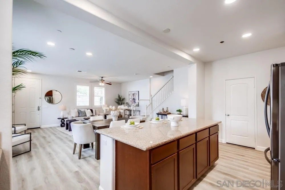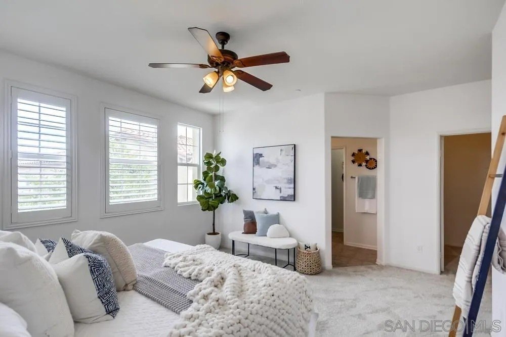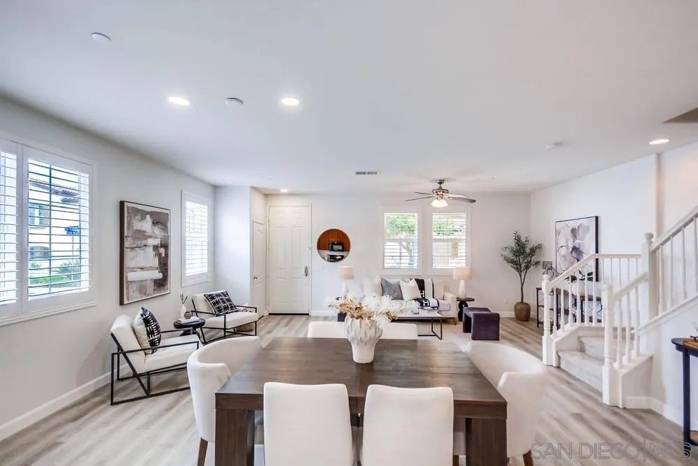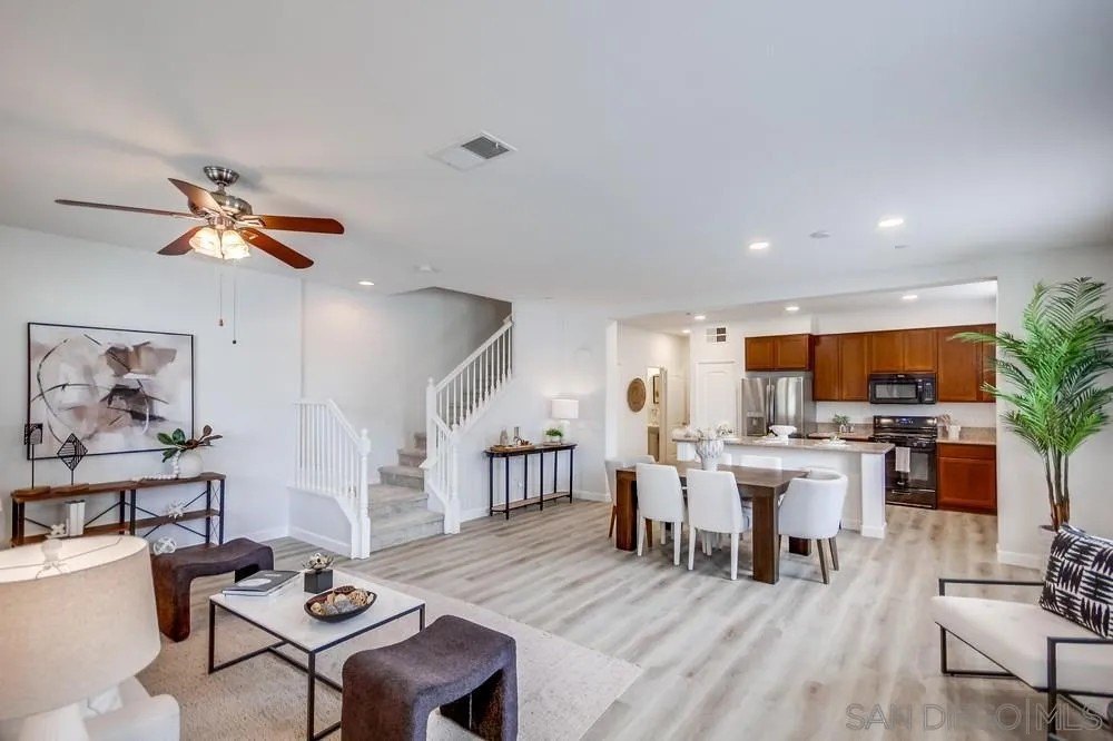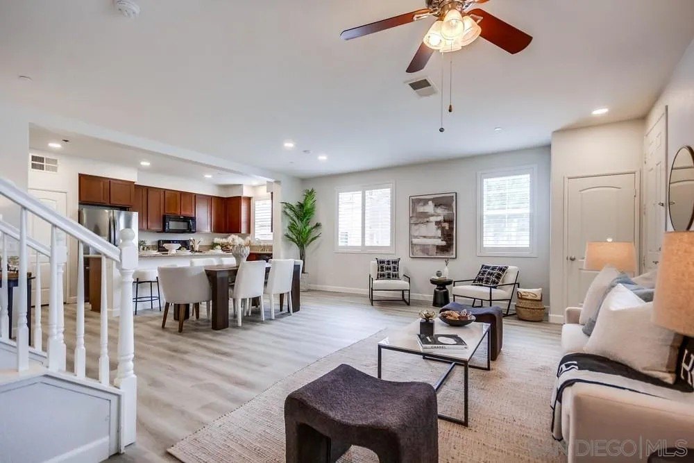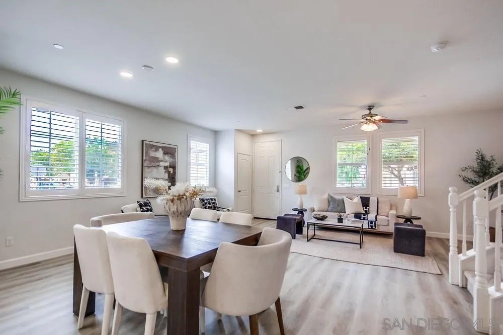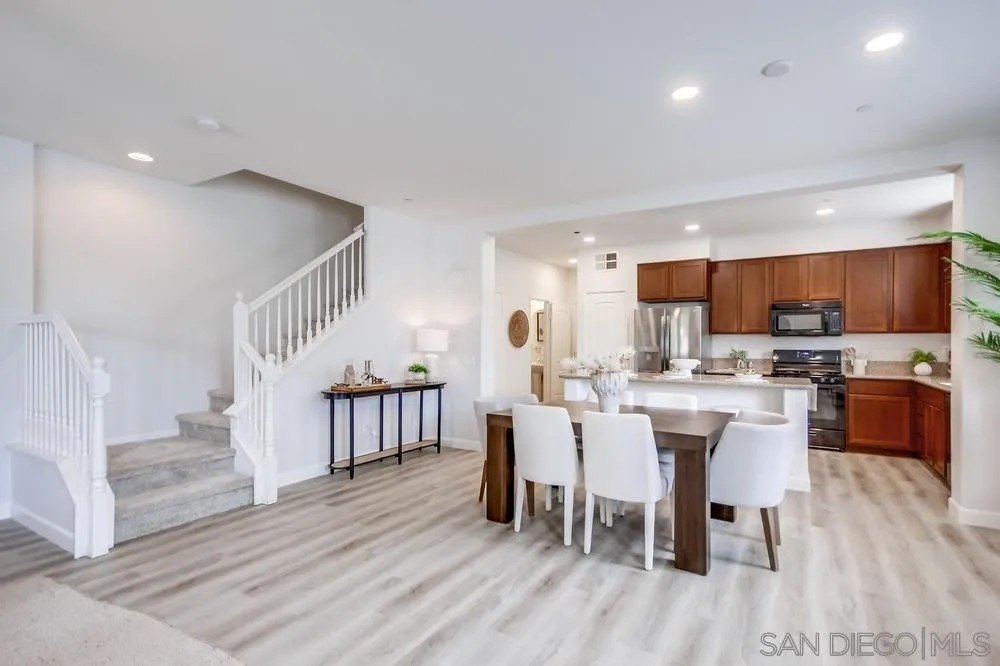 Welcome home to this turn-key end-unit townhouse in the desirable Otay Ranch community! This quiet home is attached on only one side and features a bright, airy interior with brand-new luxury vinyl plank flooring throughout the living areas, new carpet upstairs, and fresh white paint that enhances the feeling of space and light. The open floor plan is perfect for entertaining, while 10-foot ceilings throughout add an extra sense of openness. The kitchen is a chef's dream, boasting custom hardwood cabinetry, granite countertops, and a huge kitchen island. Enjoy new LED recessed lighting in the living area, a convenient half-bath downstairs, and most windows fitted with high-end wood plantation shutters. Upstairs, you'll find three spacious bedrooms, including a primary suite that boasts a huge walk-in closet and a separate water closet. Step outside to your private patio, perfect for morning coffee or evening BBQs.