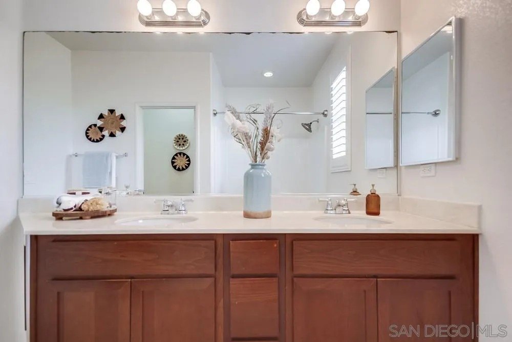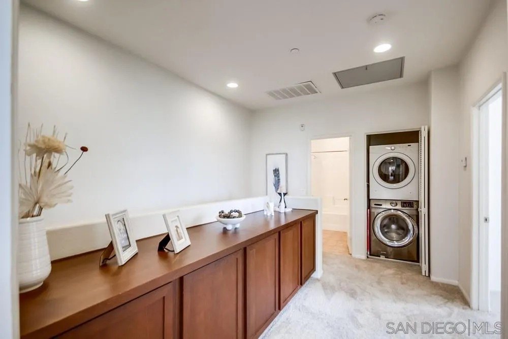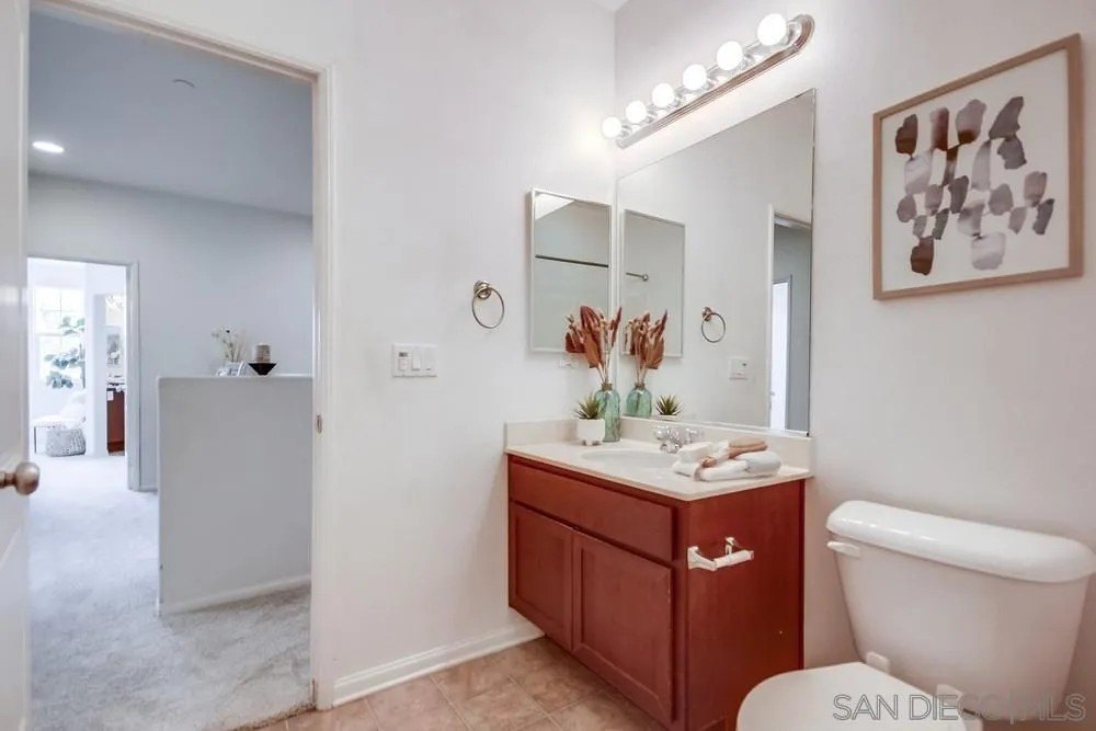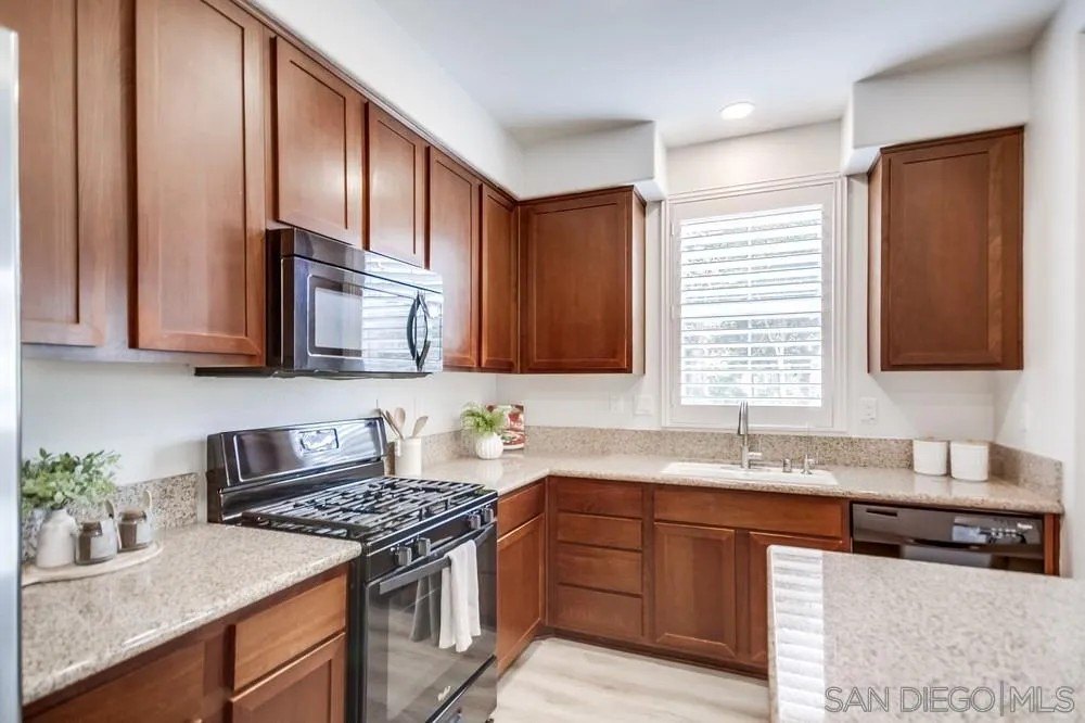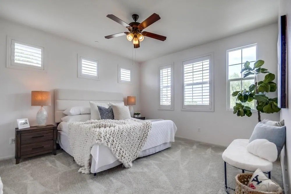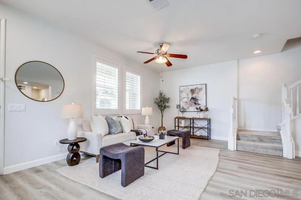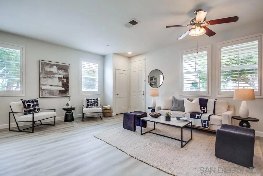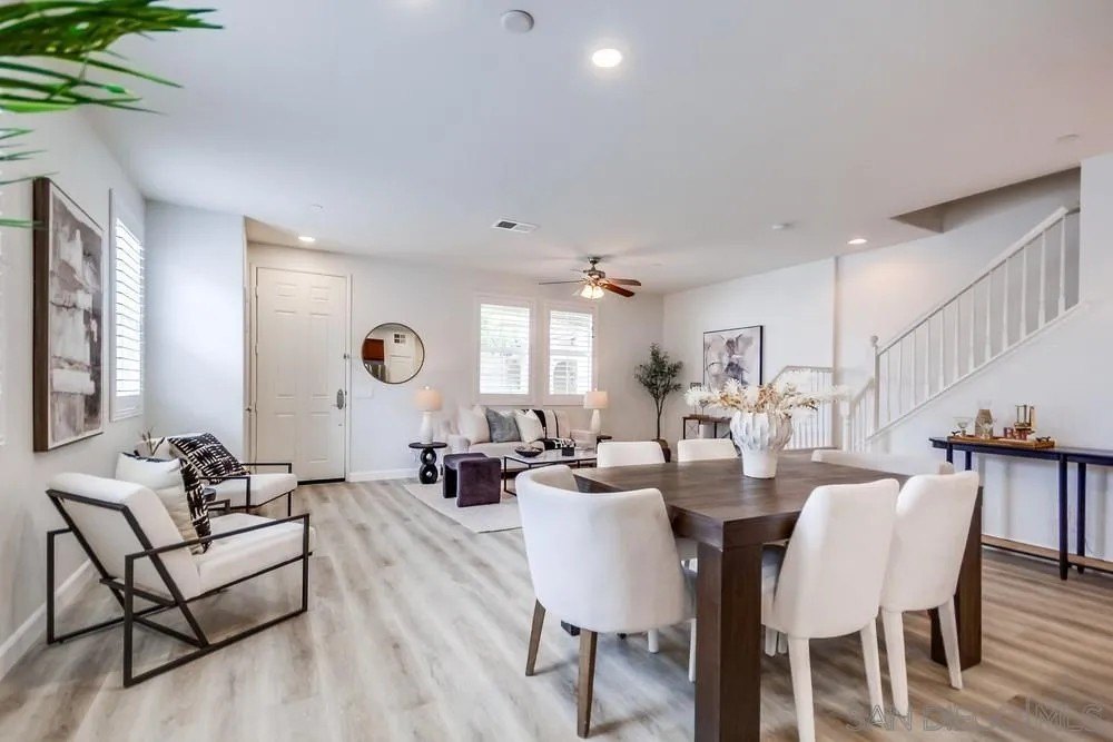 Welcome home to this turn-key end-unit townhouse in the desirable Otay Ranch community! This quiet home is attached on only one side and features a bright, airy interior with brand-new luxury vinyl plank flooring throughout the living areas, new carpet upstairs, and fresh white paint that enhances the feeling of space and light. The open floor plan is perfect for entertaining, while 10-foot ceilings throughout add an extra sense of openness. The kitchen is a chef's dream, boasting custom hardwood cabinetry, granite countertops, and a huge kitchen island. Enjoy new LED recessed lighting in the living area, a convenient half-bath downstairs, and most windows fitted with high-end wood plantation shutters. Upstairs, you'll find three spacious bedrooms, including a primary suite that boasts a huge walk-in closet and a separate water closet. Step outside to your private patio, perfect for morning coffee or evening BBQs.