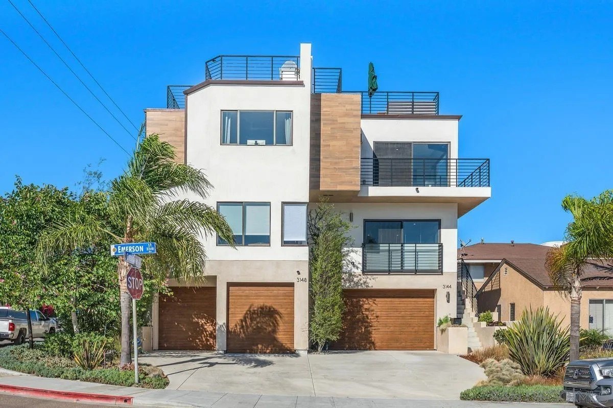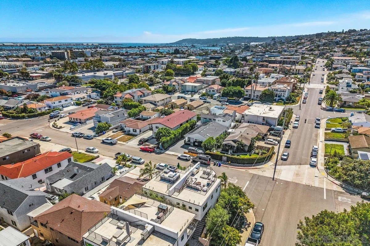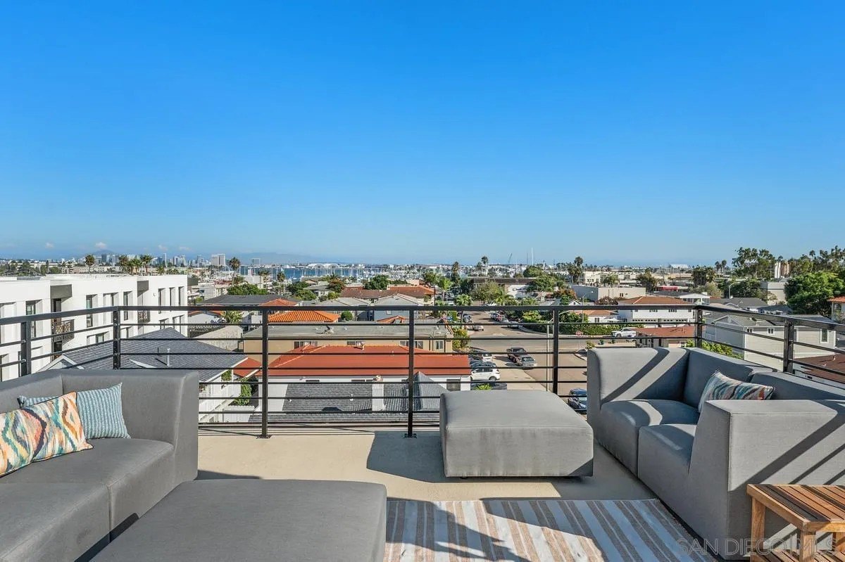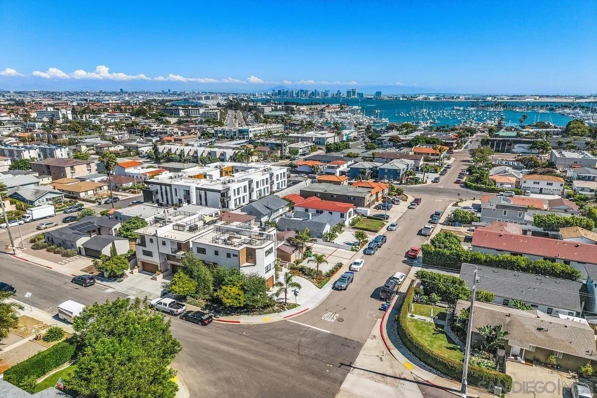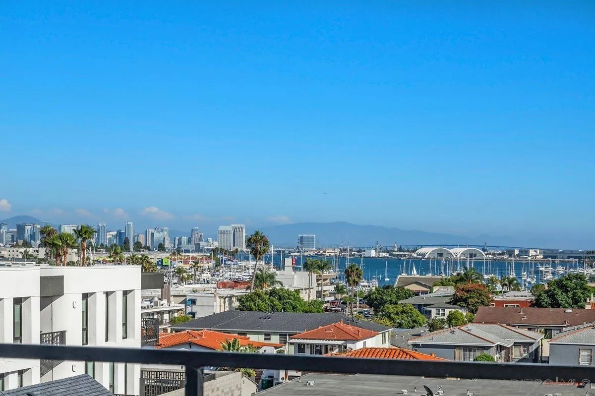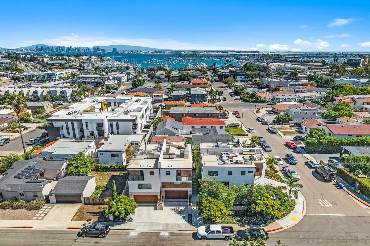 Just three blocks from the Bay in the heart of Point Loma Village, this luxury townhome in the Emerson Corner Complex blends modern design with everyday convenience and stunning views. Built in 2017, the home features an open floor plan with engineered Baltic Oak flooring, Shinnoki cabinetry, a Dacor appliance package, and a white quartz waterfall-edge island with designer lighting. Both upstairs bedrooms include ensuite baths with bay views, while the primary suite offers a private wraparound balcony and custom Elfa walk-in closet. Enjoy panoramic vistas from the private rooftop deck, complete with gas hookup, water spigot, and sink access - perfect for entertaining and watching the Big Bay Boom on the 4th of July! Additional highlights include dual-zone A/C, tankless water heater, LED lighting, Emtek digital hardware, and a smart-home system with Lutron lighting, Ring security, and MyQ garage controls. The two-car garage is equipped with an insulated Martin door with ultra-quiet smart opener. Living here grants easy access to some of Point Loma's most popular spots, including Mitch's seafood, Jimmy Famous Tavern, Ketch, Old Venice, to name a few, and an easy walk to live music at Humphrey's by the Bay. Nearby Shelter Island and Liberty Station add even more dining, entertainment, and coastal recreation options, all just minutes from your front door. With its rare combination of style, comfort, and a walkable waterfront location, this home captures the best of Point Loma living.